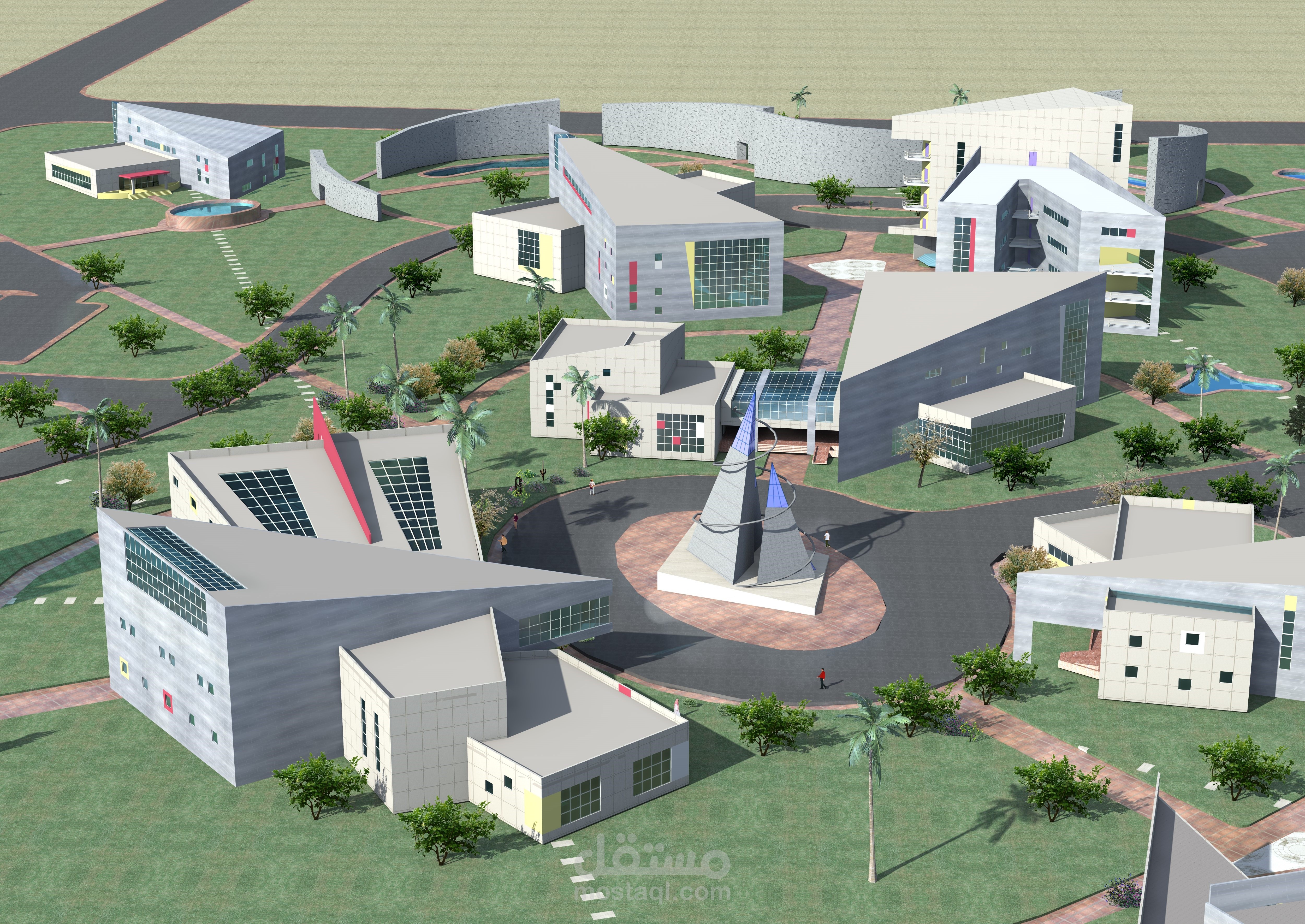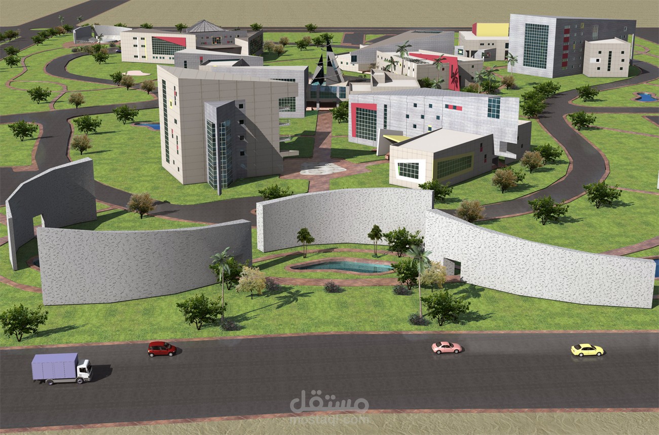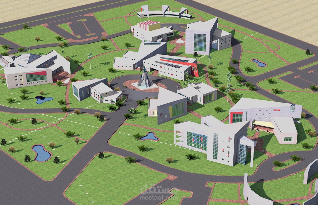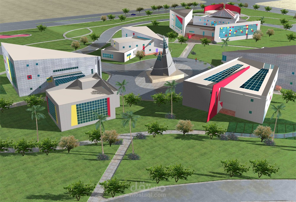 تصميم وتخطيط مساحة مفتوحة لحاضنة تكنولوجية تحتوي على عدد من المباني