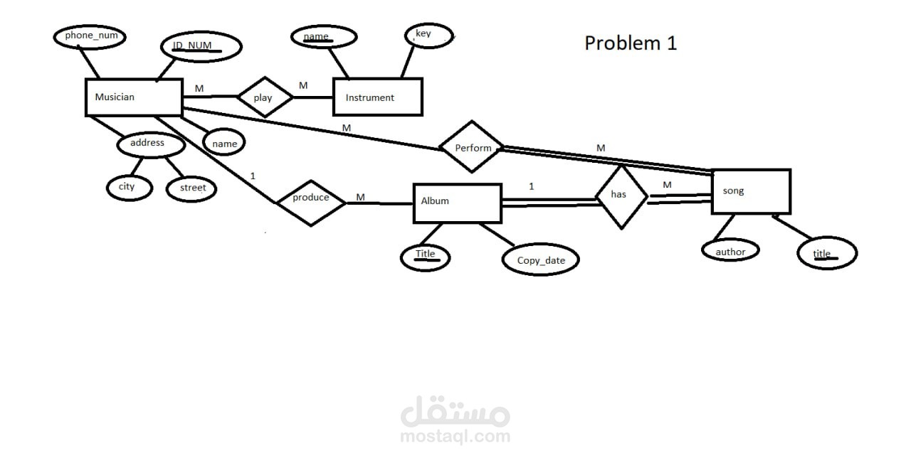 ألبوم (Album): يمثل الألبومات الموسيقية، مع السمة Title (العنوان)، وترتبط بعلاقة produce (ينتج) مع الموسيقي، مما يعني أن موسيقيًا قد ينتج ألبومًا واحدًا أو أكثر، بينما كل ألبوم يرتبط بموسيقي واحد.
