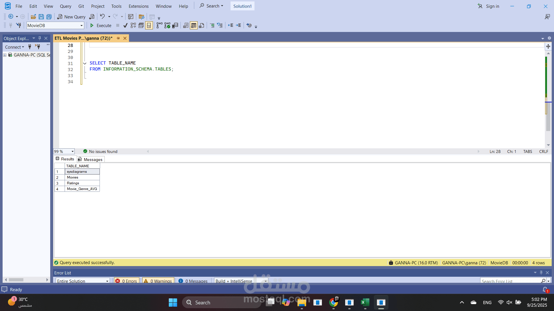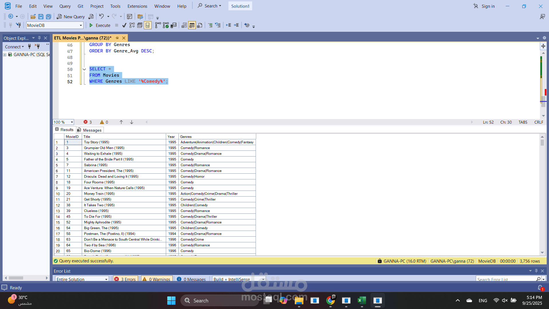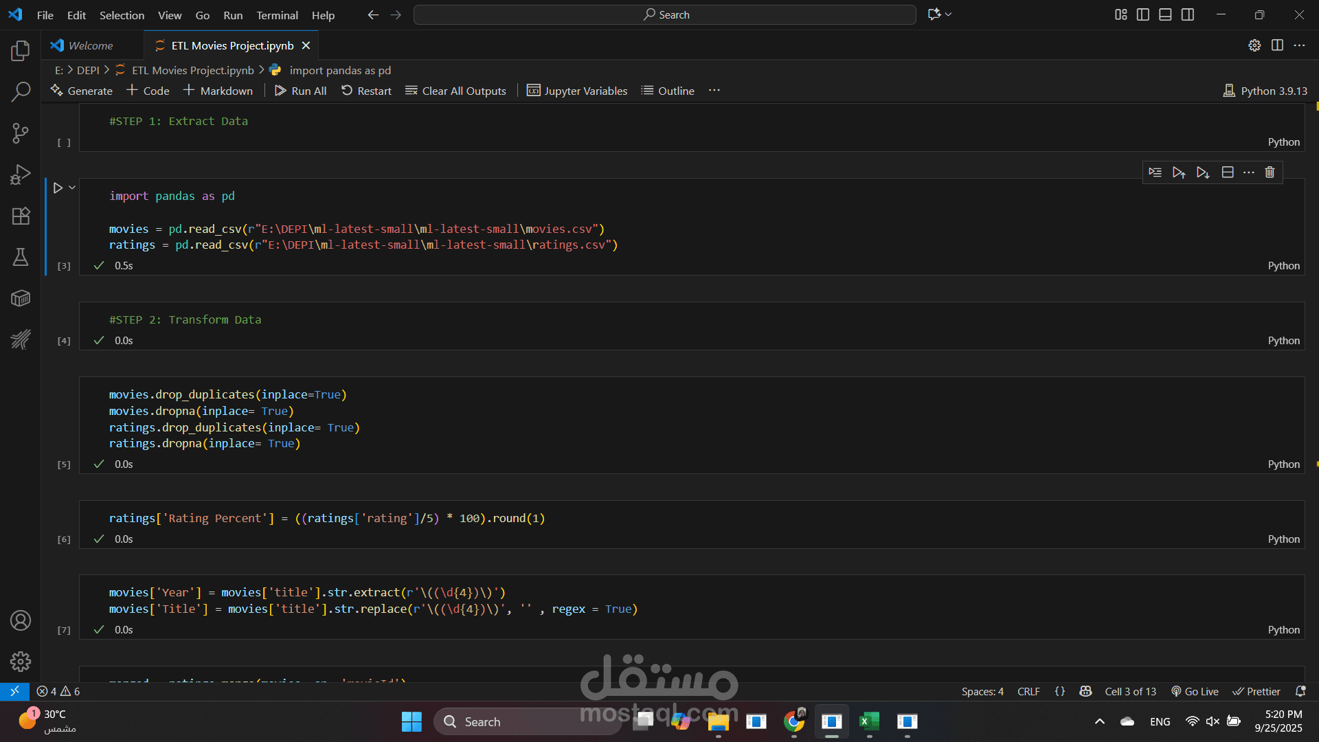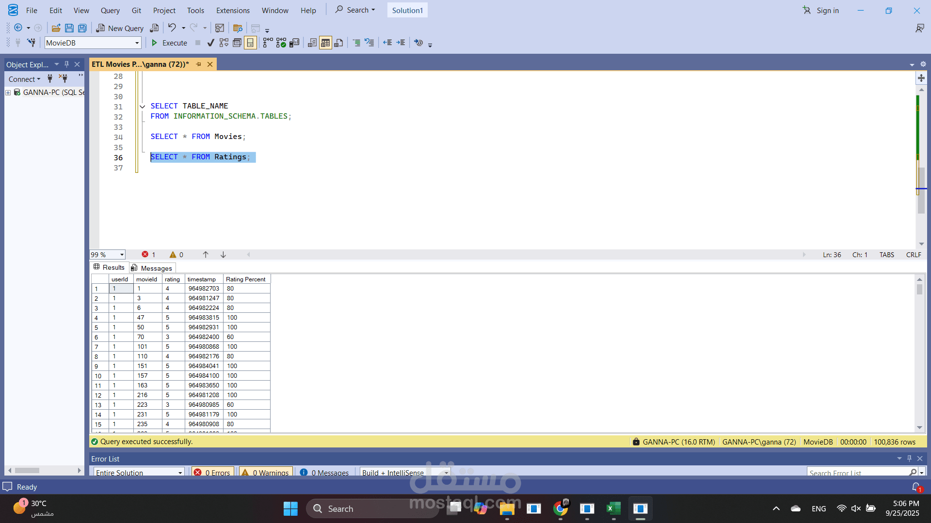 يهدف هذا المشروع إلى بناء قاعدة بيانات للأفلام وتقييماتها باستخدام SQL Server و Python (Pandas + SQLAlchemy).