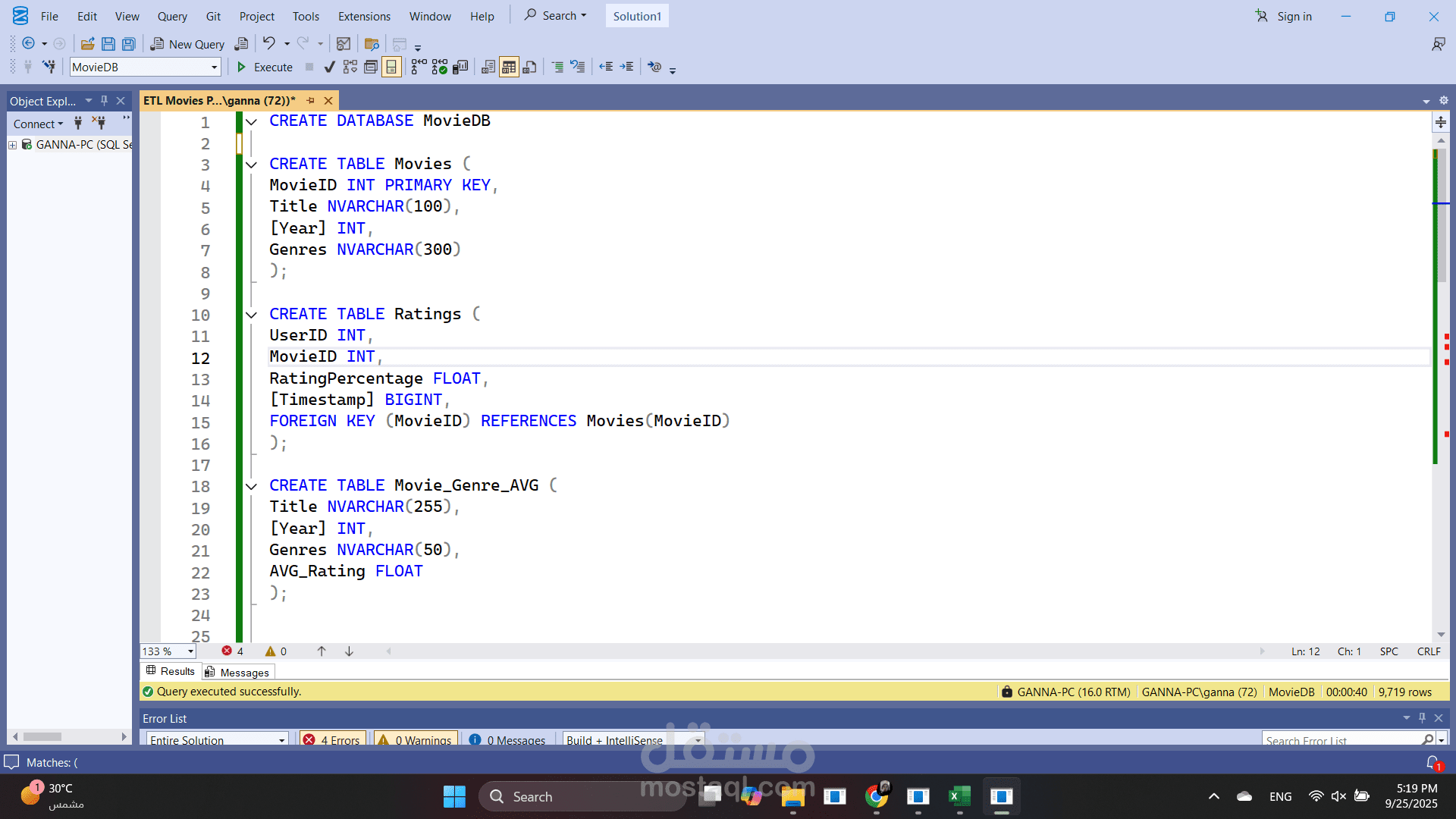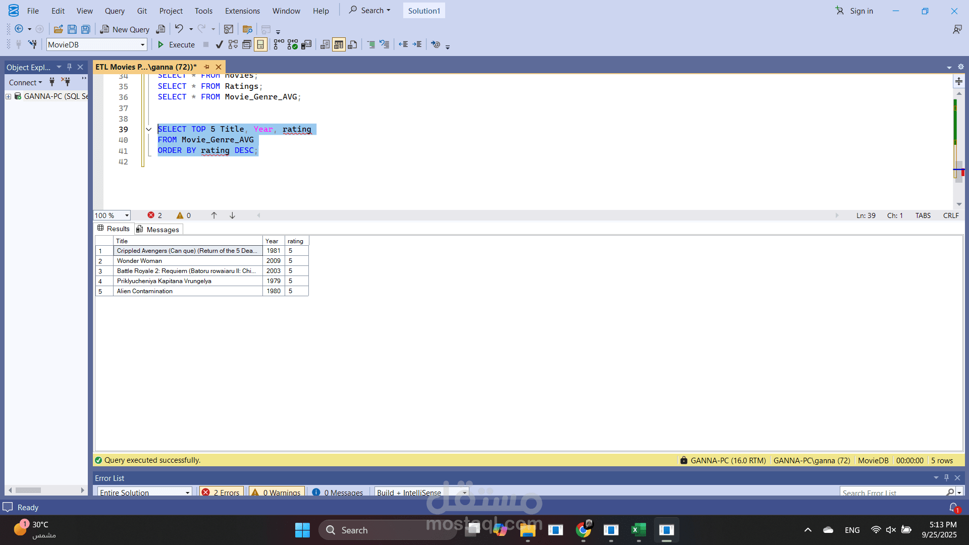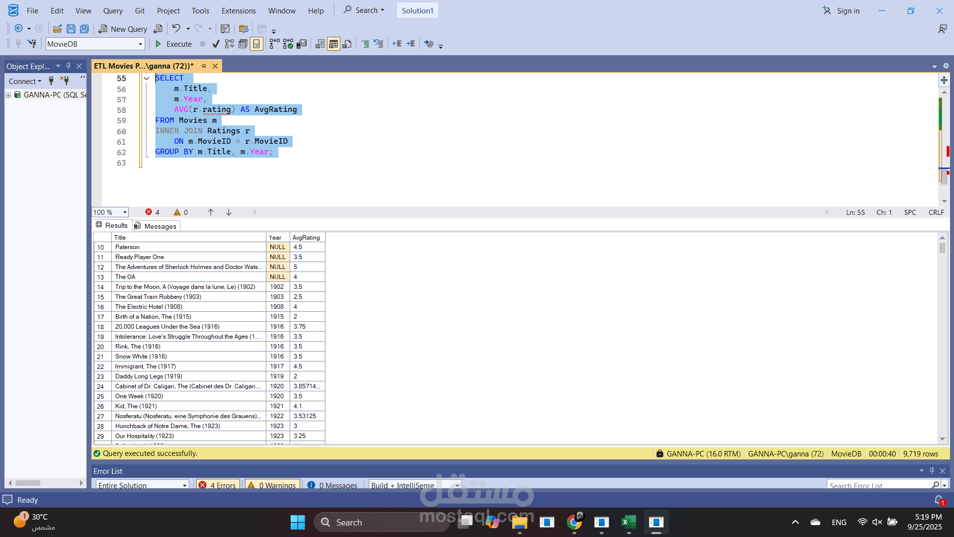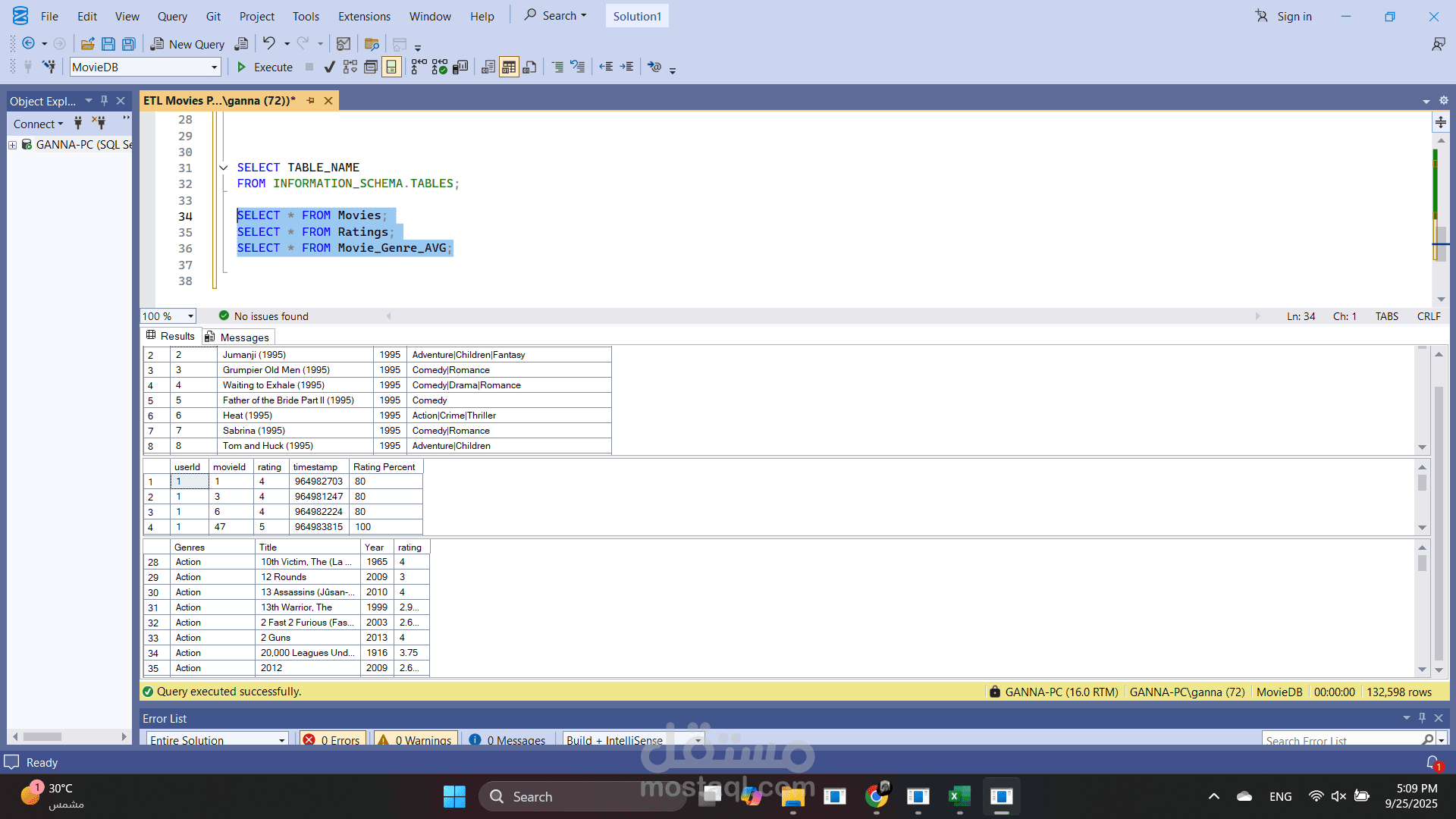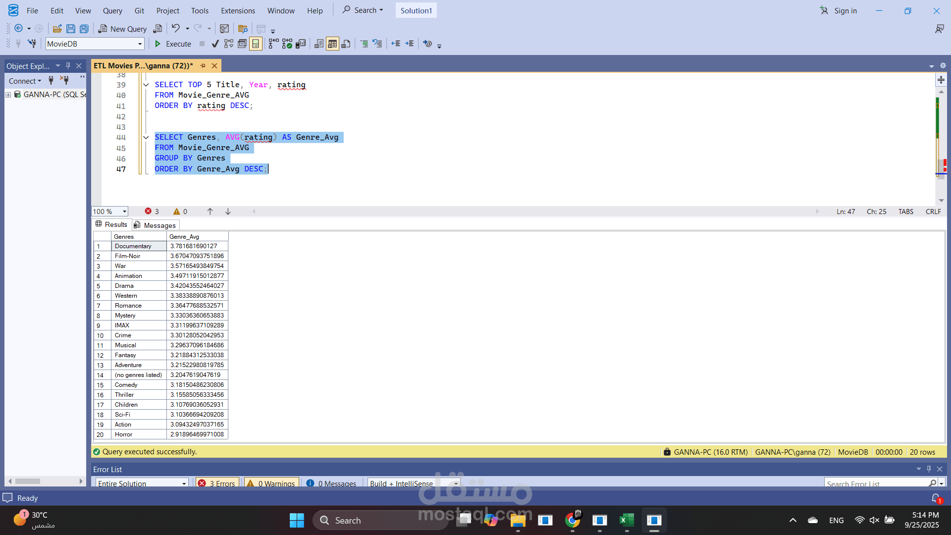 3. Movie_Genre_Avg: يحتوي على متوسط التقييمات لكل فيلم بحسب النوع (Genre) والعنوان والسنة.