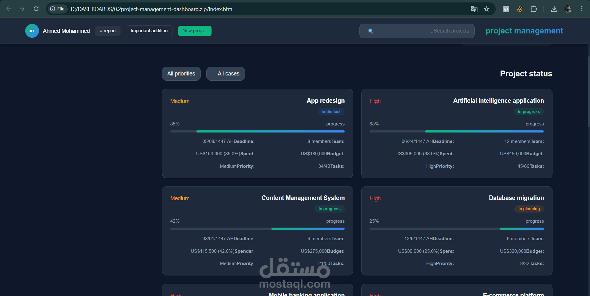 بطاقات مشاريع تفاعلية مع تنبيهات الأولوية