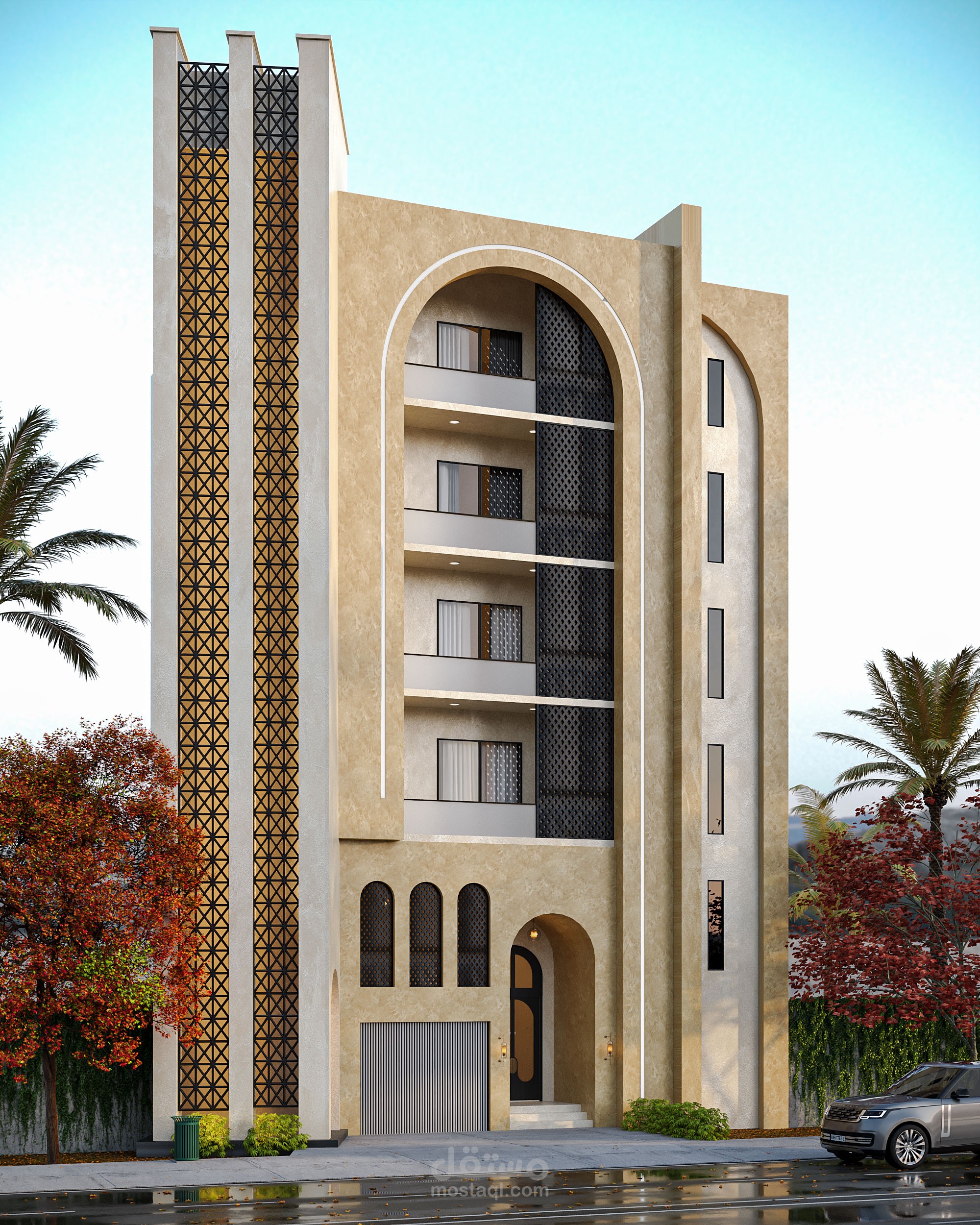 واجهة معمارية حديثة تجمع بين البساطة واللمسات الكلاسيكية، حيث يبرز الاستخدام المتوازن للأقواس الكبيرة والعناصر الهندسية المزخرفة. تتناغم الألوان الترابية مع التفاصيل المعدنية الداكنة لتعكس فخامة وعصرية في آن واحد، بينما تضفي الفتحات الرأسية الطويلة إيقاعاً جمالياً يضاف إلى قوة التصميم وأناقة شكله العام.