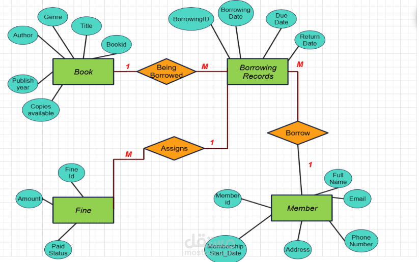 ERD Creation: Identified four main entities—Books, Members, Borrowings, and Fines—and mapped their relationships using an ERD diagram to ensure normalization and integrity.