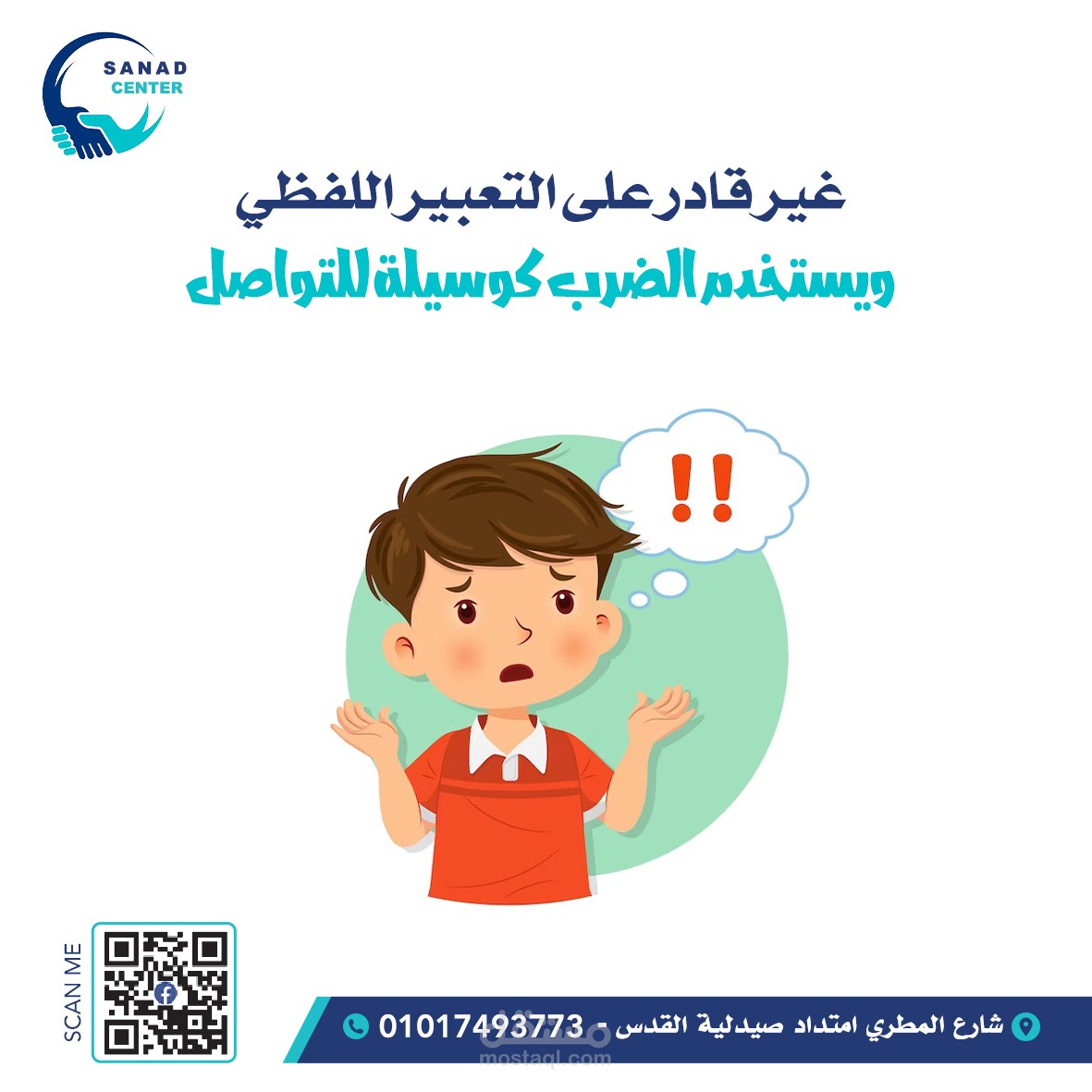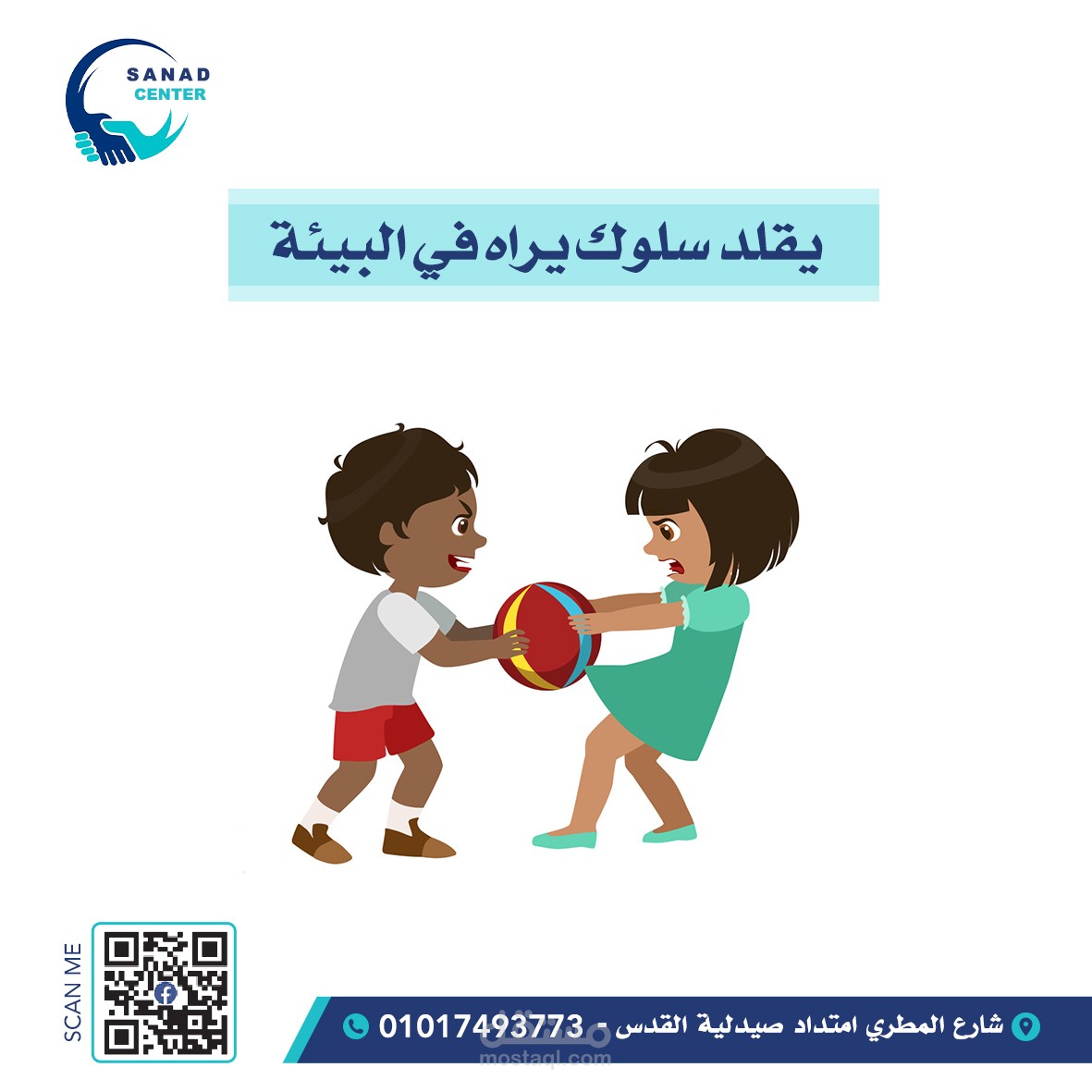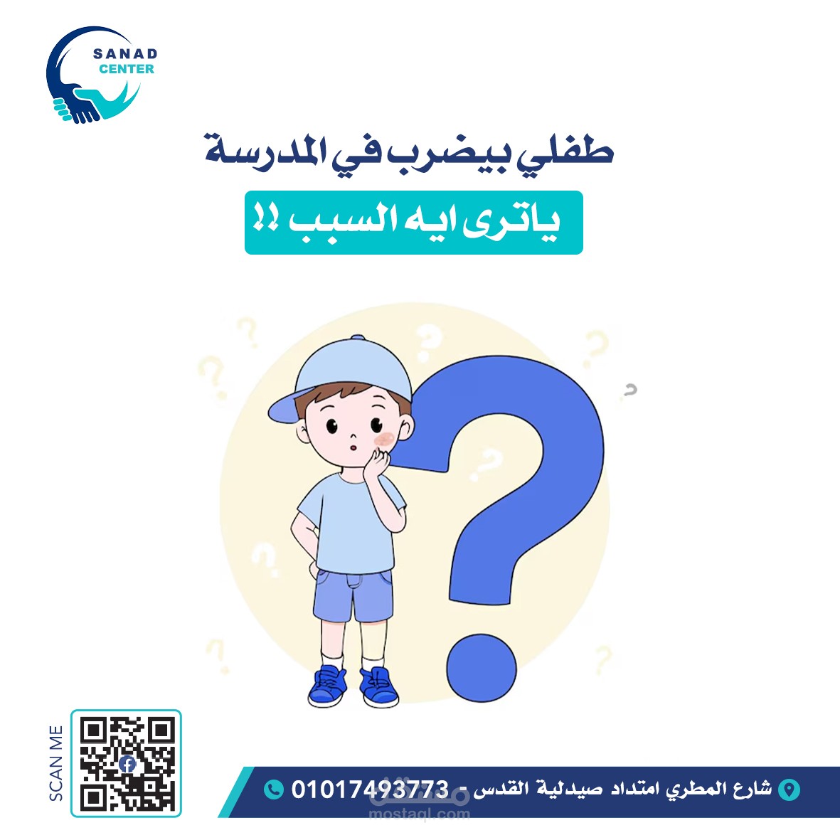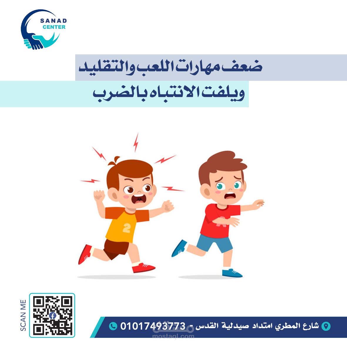 التفاصيل: التركيز على توصيل رسالة المركز بشكل واضح من خلال العنوان الرئيسي، مع استخدام أيقونات ورسومات داعمة للأطفال، وتنسيق النصوص لتسهيل القراءة وجذب الانتباه على شبكات التواصل الاجتماعي.