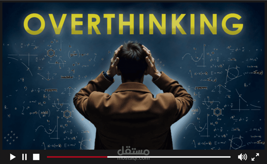 تصميم صورة مصغّرة (Thumbnail) بعنوان Overthinking، تعكس فكرة الانشغال الذهني والتفكير الزائد من خلال دمج الشخصيات مع الرموز والمعادلات العلمية بشكل بصري جذاب. استخدمت في التصميم تباين الألوان الداكنة مع النص البارز لإبراز الفكرة وجذب الانتباه.