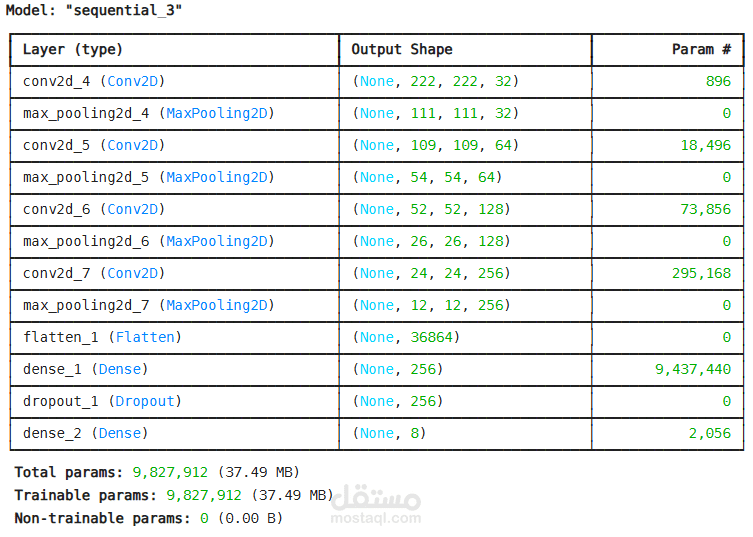 بناء بنية مخصصة لشبكة CNN، تشمل طبقات تلافيفية، تجميع (Pooling)، التطبيع (Batch Normalization) وطبقات تسلسلية نهائية.