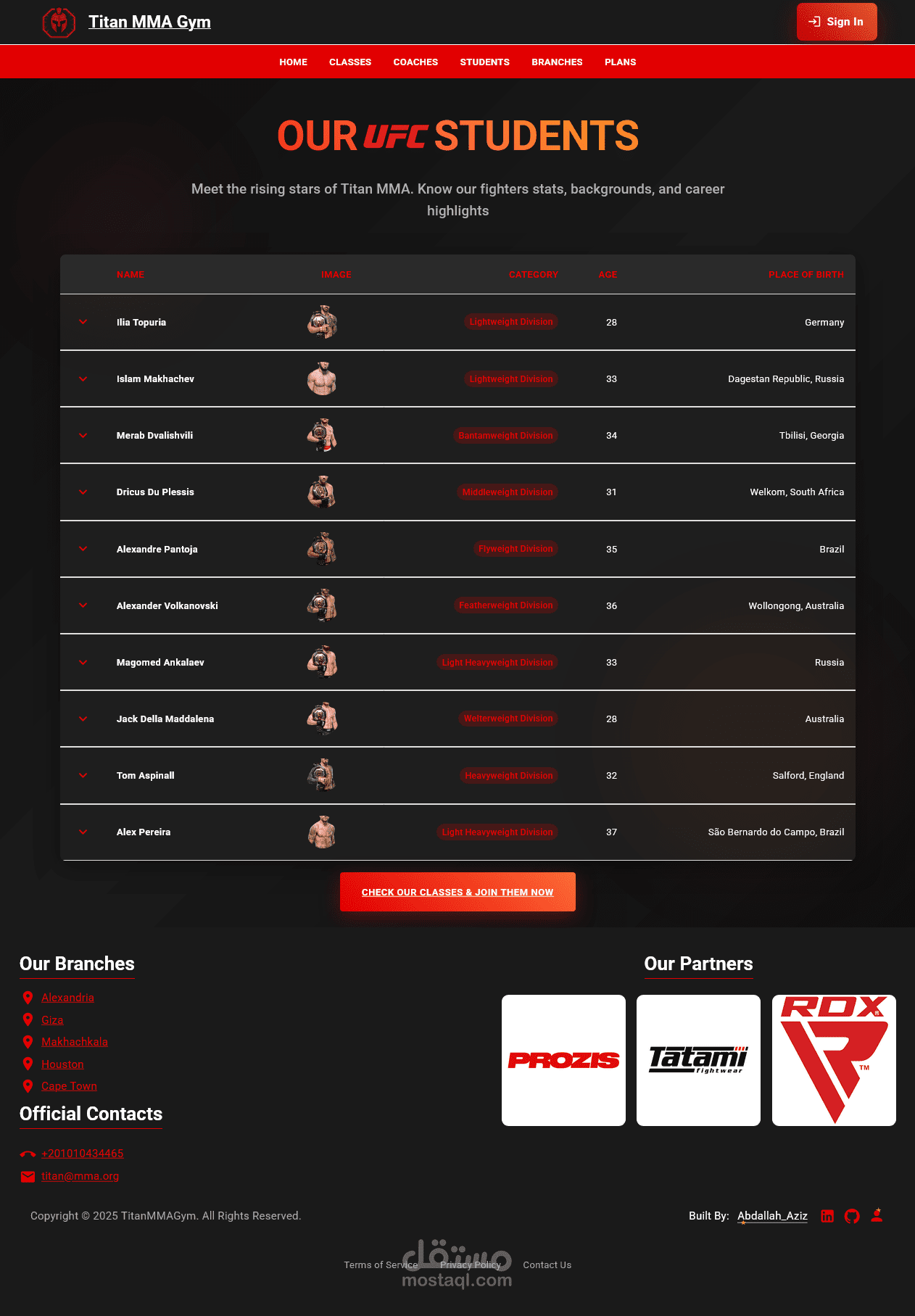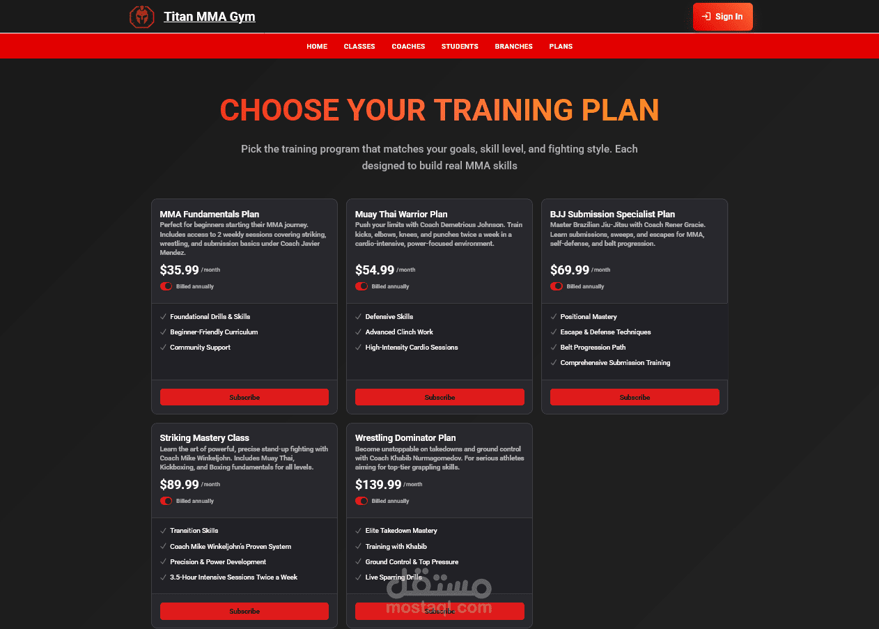 1. عرض قائمة شاملة بجميع الحصص المتاحة (MMA – مواي تاي – المصارعة – الضربات).