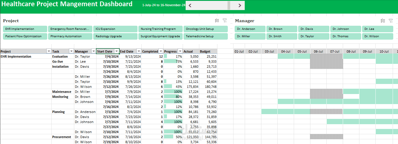 هذا المشروع عبارة عن لوحة متابعة شاملة لإدارة مشاريع الرعاية الصحية صممتها بالكامل باستخدام Excel. قمت بتنظيم بيانات المشاريع وجدولتها وتحليلها بشكل متقدم لتتبع الميزانيات، التكاليف الفعلية، نسب الإنجاز، توزيع المهام على المديرين، ومواعيد البدء والانتهاء لكل مهمة. اعتمدت في التحليل على أدوات متقدمة مثل Pivot Tables والجداول الديناميكية ودوال SUMIFS، VLOOKUP وتصميم رسوم بيانية تفاعلية لمقارنة الأداء واستخراج مؤشرات الأداء الرئيسية لكل مشروع ومدير.