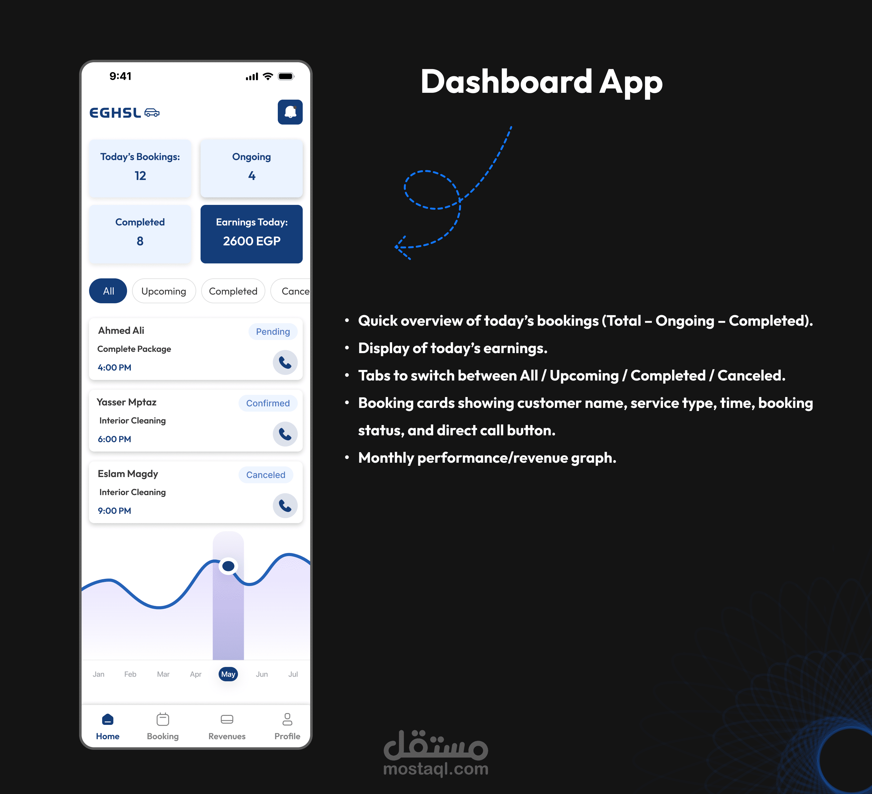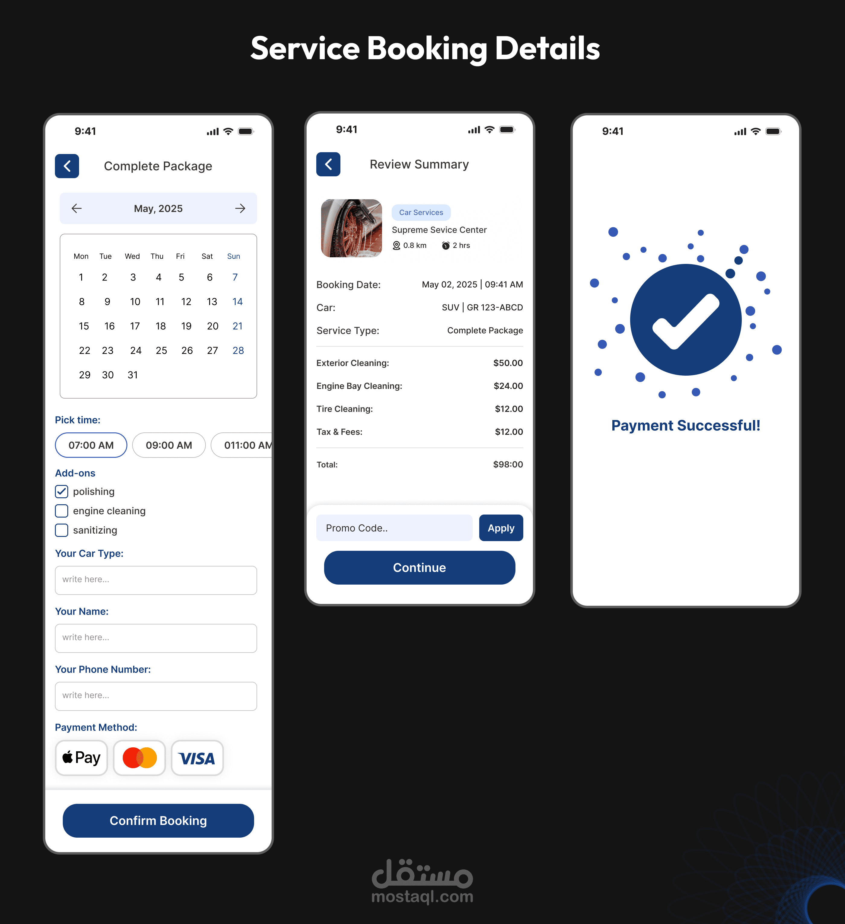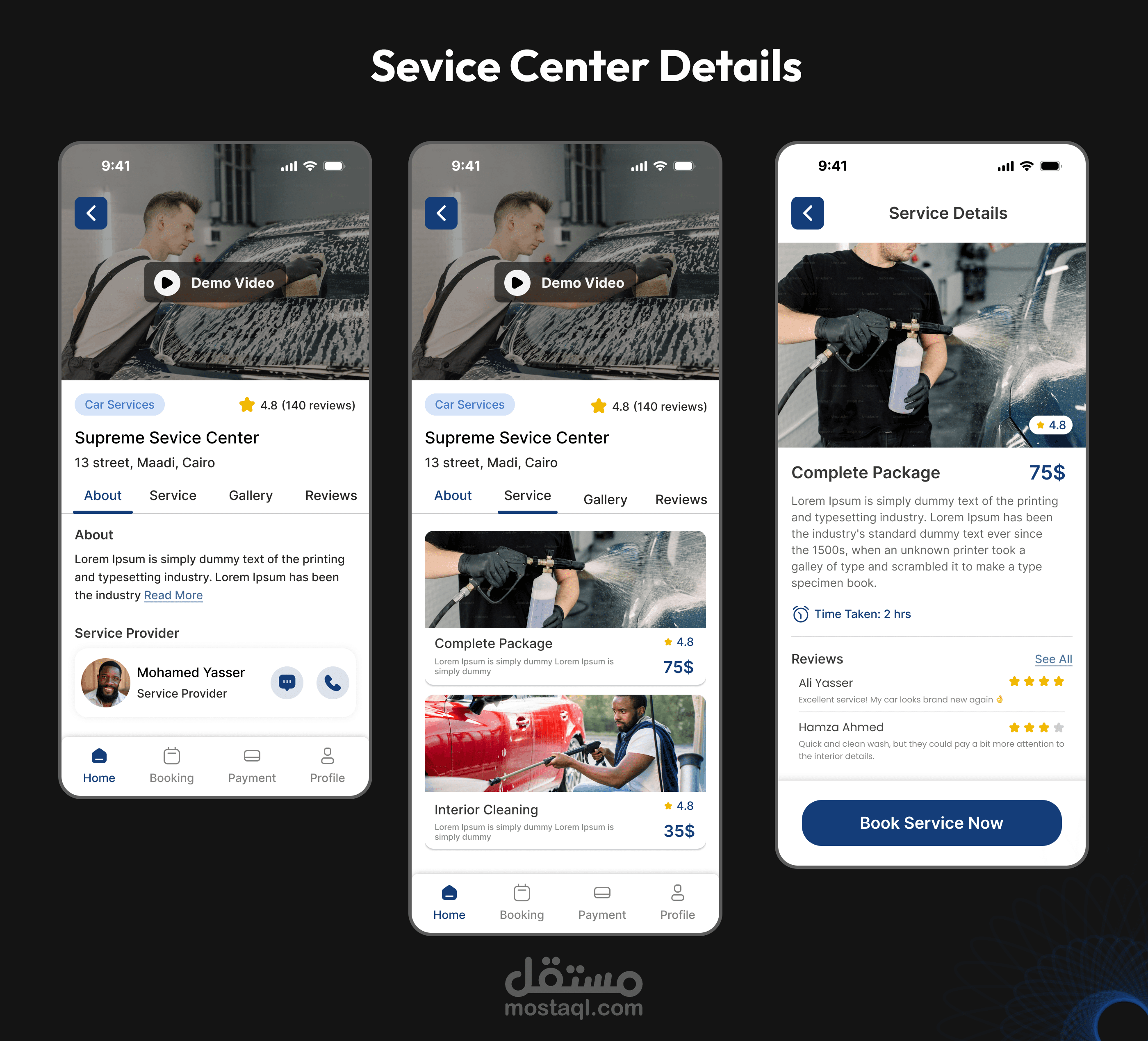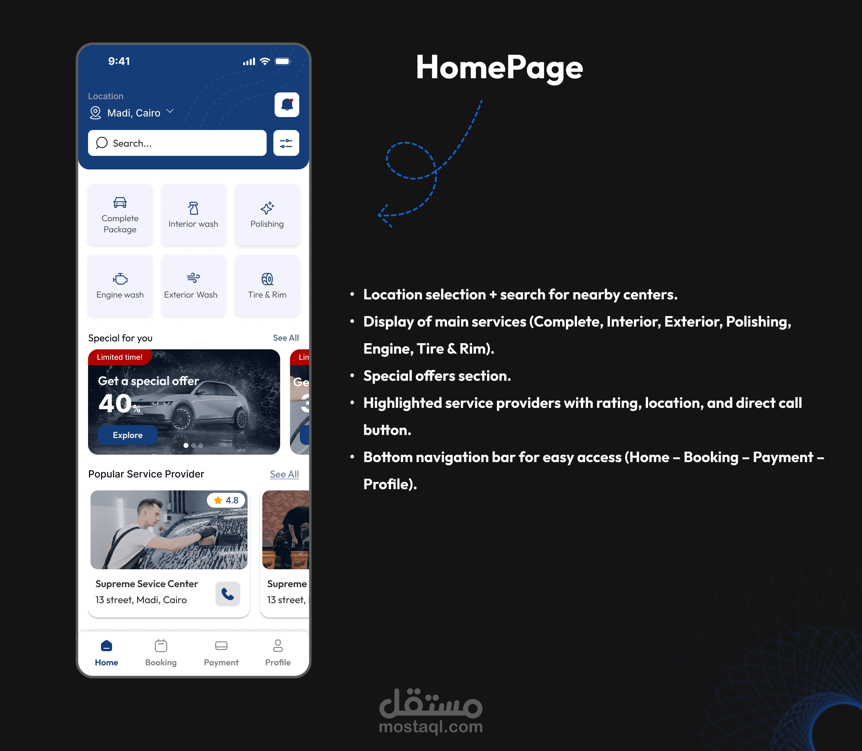 قمت بتصميم الـ Main Flow الرئيسي لتطبيق حجز مغسلة سيارات بطريقة عصرية وسهلة الاستخدام. ركزت على بساطة تجربة المستخدم وتنظيم خطوات الحجز بدءًا من تسجيل الدخول وحتى تأكيد الحجز، مع مراعاة هوية البراند والألوان الخاصة بالخدمة.