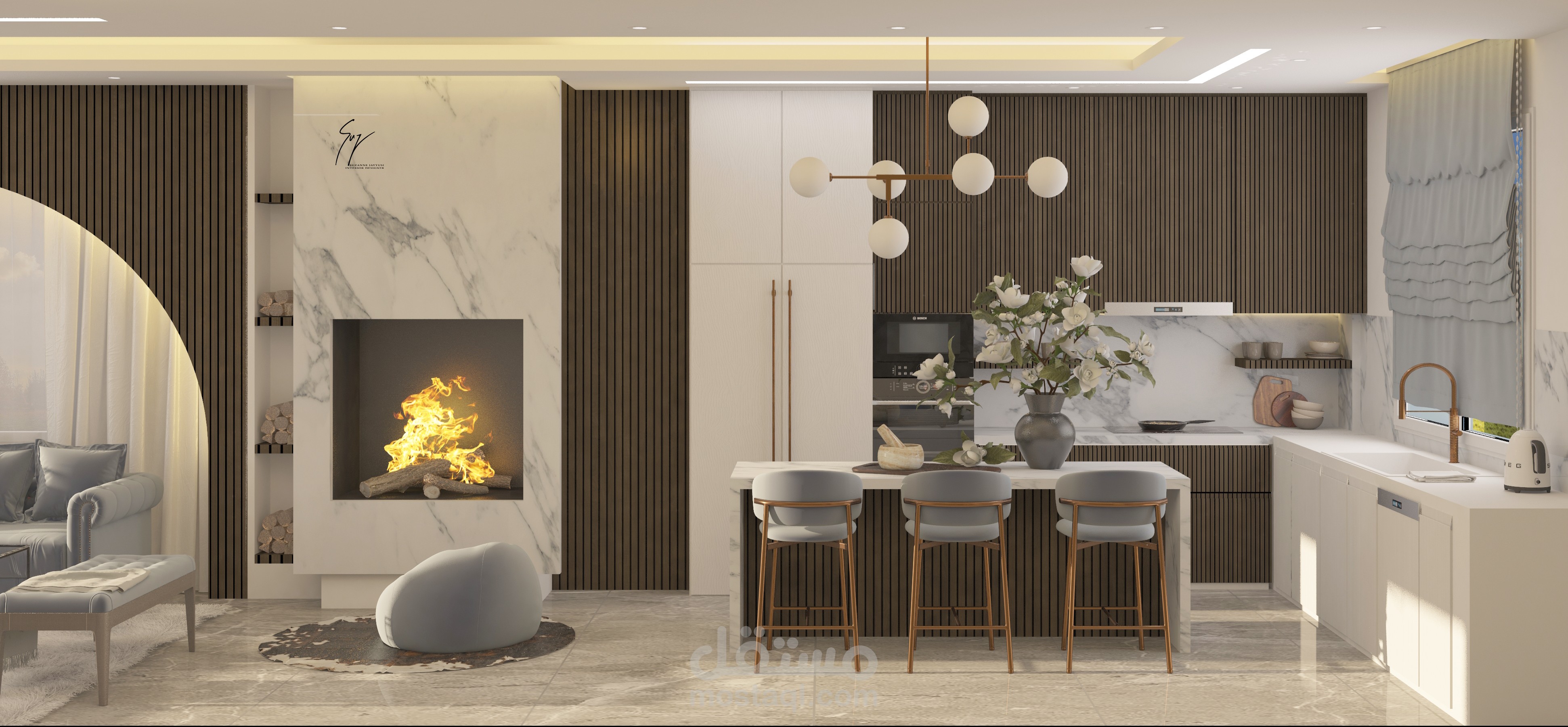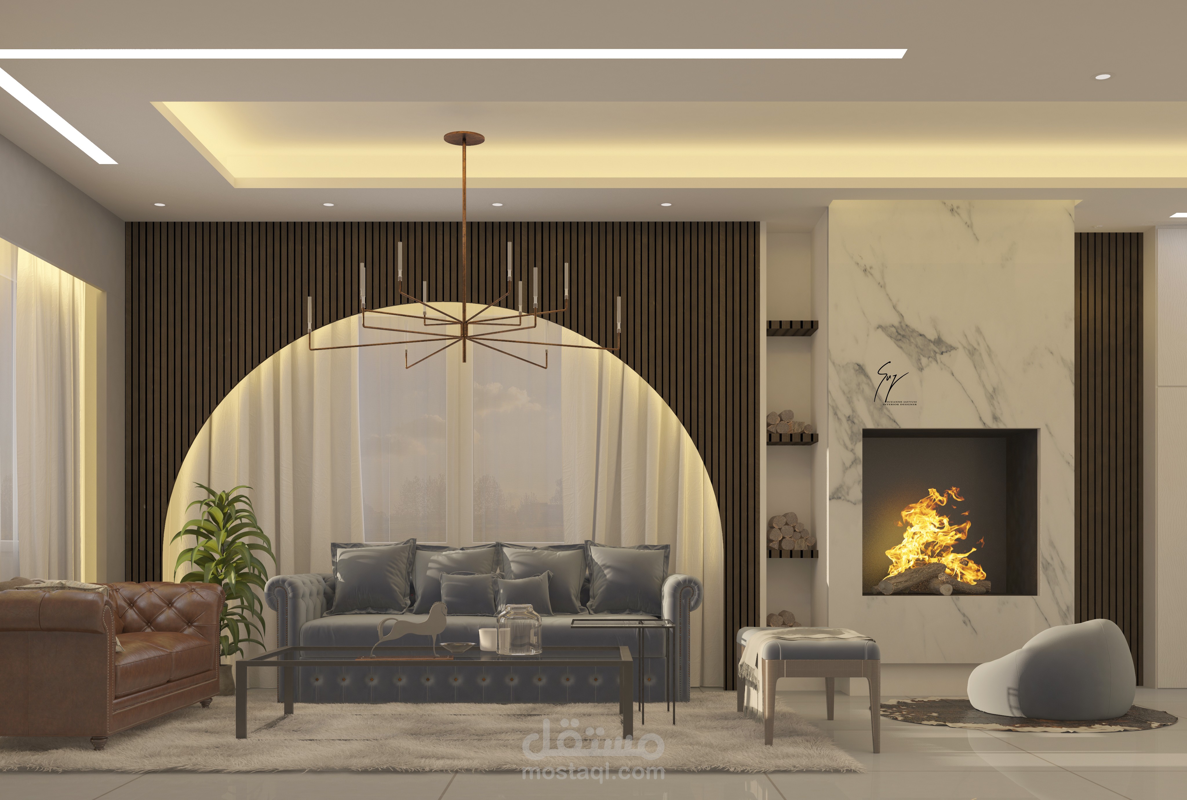 تصميم حديث مع استخدام لقطع اثاث كلاسيكية، للموازنة بين البساطة والفخامة والعملية والجمال. الموقد والخشب الداكن يضفيان دفئا على التصميم مقابل اللون الرمادي والازرق
