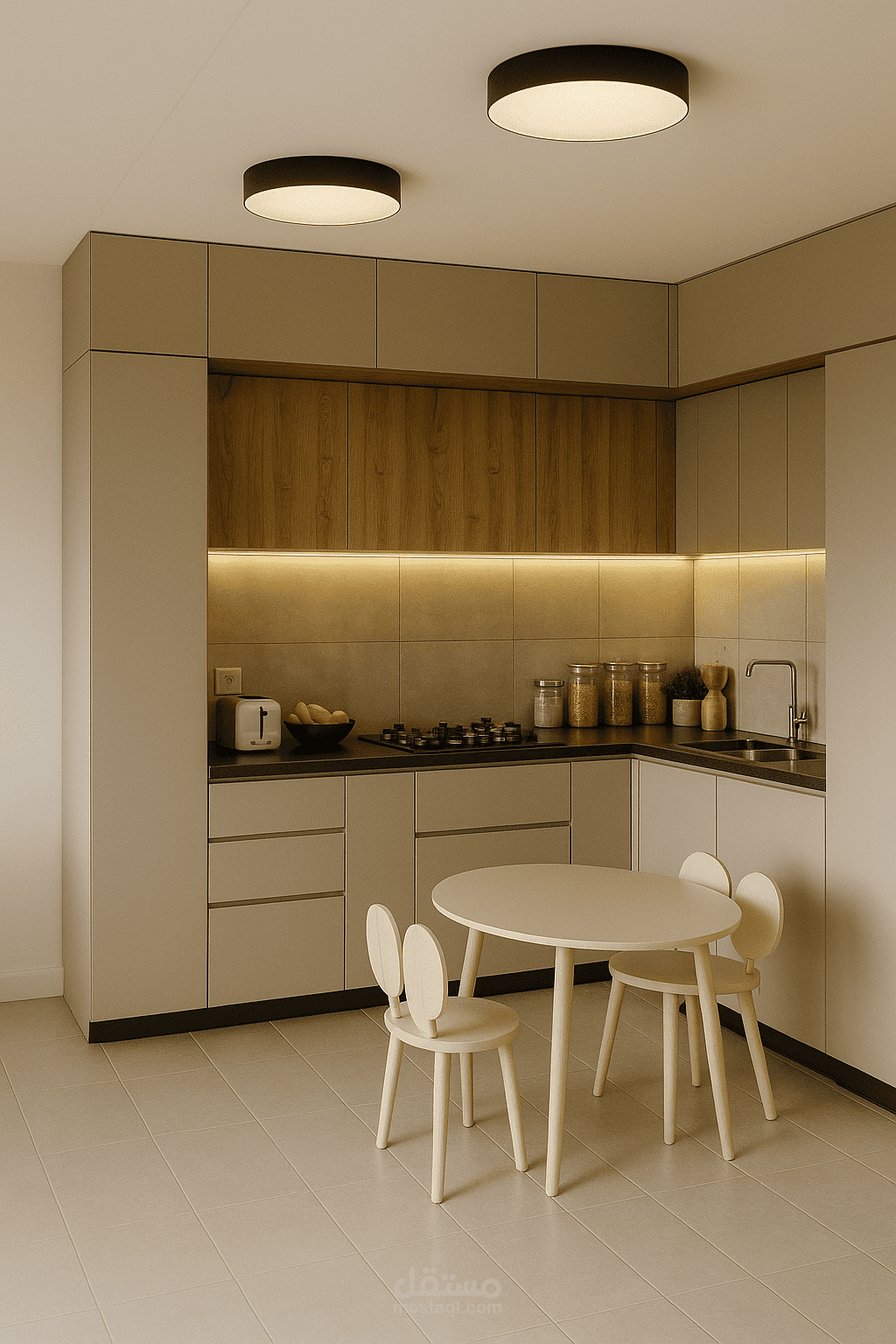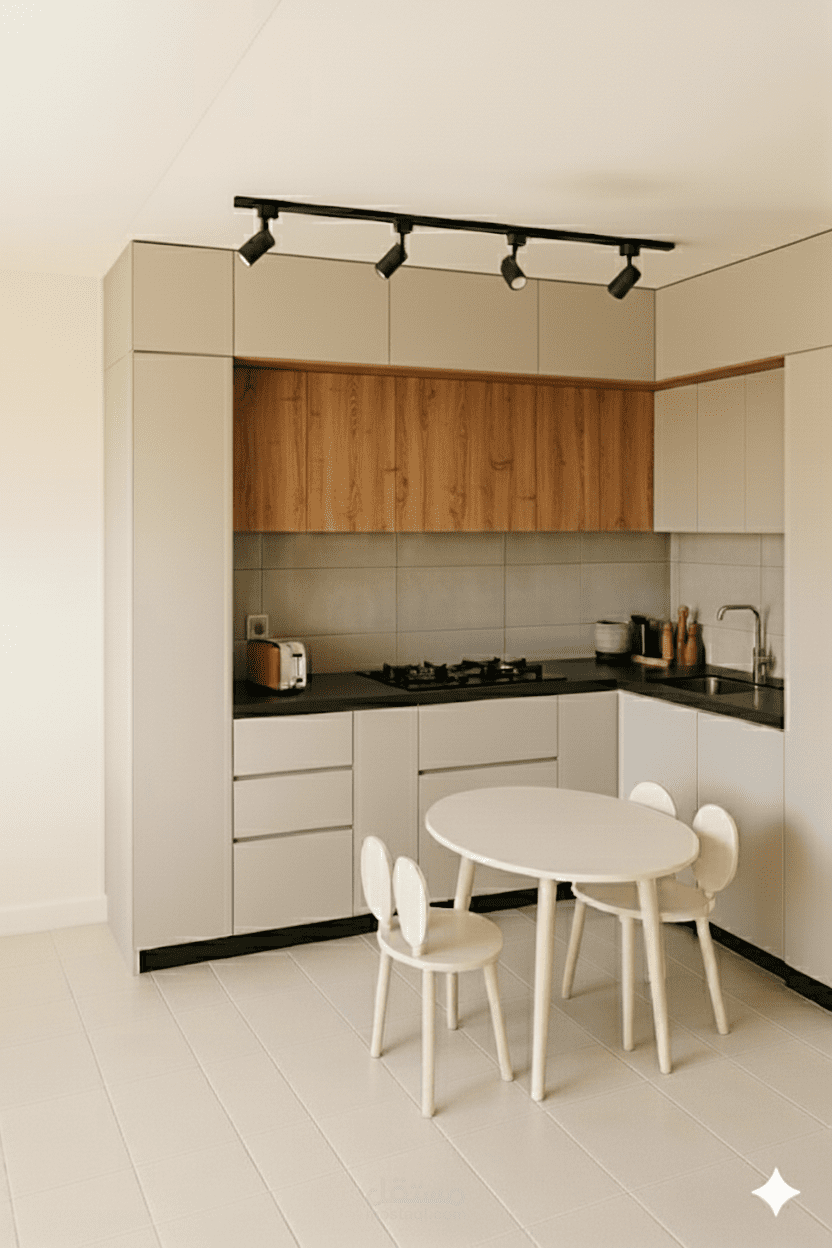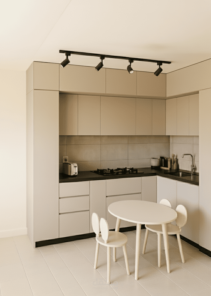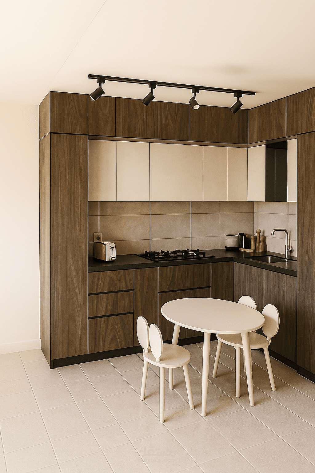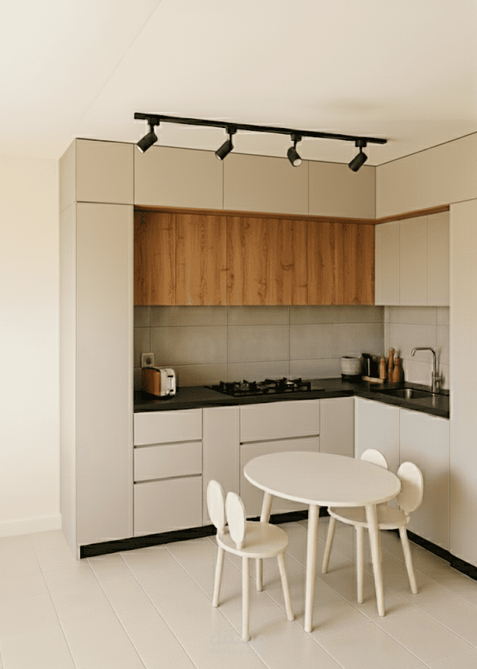 مطبخ حرف L مصمم للماسحات الصغيرة وخاصة الشاليهات السياحية وبالوان وخامات عصرية وحديثة