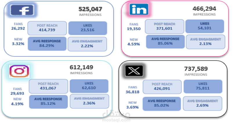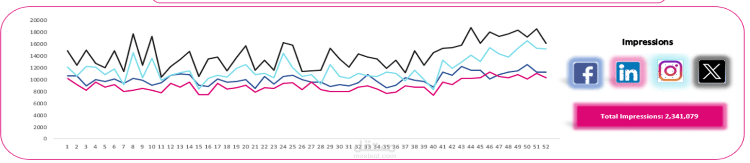 تساعد هذه اللوحة في تتبّع الأداء عبر مختلف المنصات (Facebook, LinkedIn, Instagram, X)، مما يتيح للشركات فهم فعالية استراتيجياتها الرقمية، تحسين الحملات التسويقية، واتخاذ قرارات مبنية على بيانات دقيقة.