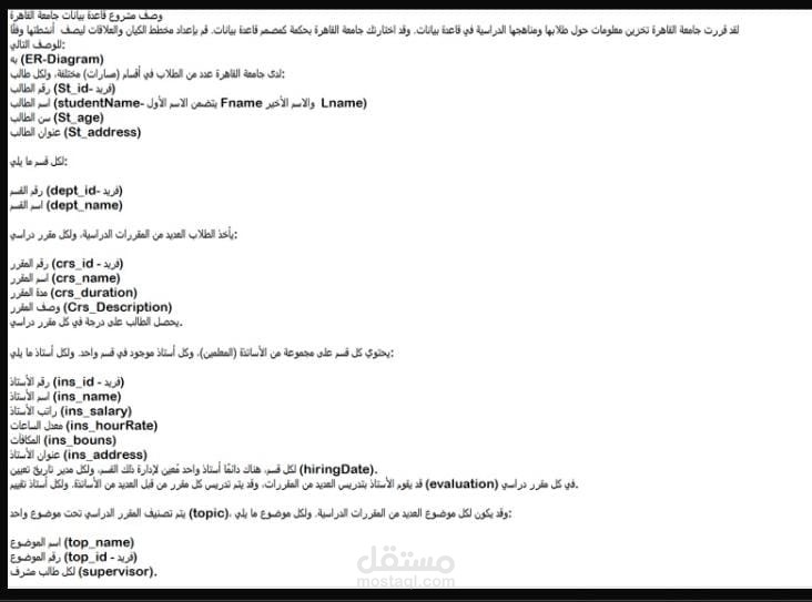 تم تصميم قاعدة بيانات علائقية (Relational Database) لجامعة القاهرة بهدف إدارة بيانات الطلاب، الأقسام، المقررات، الموضوعات، وأعضاء هيئة التدريس.