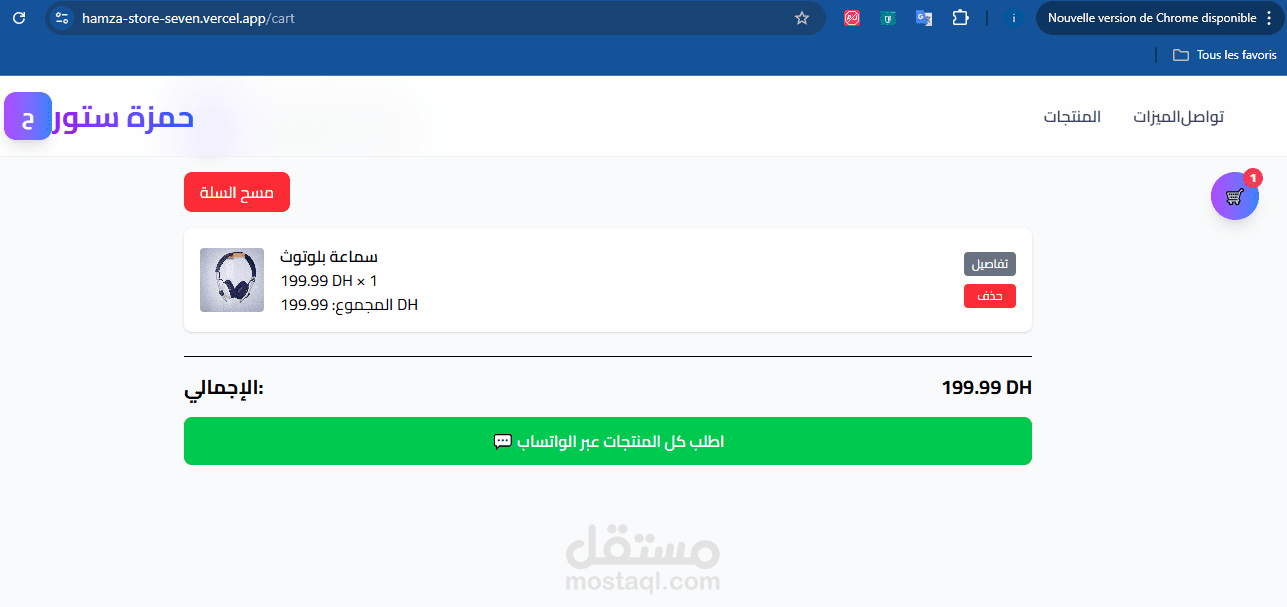 يتضمن: عرض المنتجات، صفحة تفاصيل، سلة مشتريات تعمل بالكامل على العميل وتُحفظ بيانات المستخدم محليًا، تصميم متجاوب يعمل على الجوال، وشريط جانبي للتواصل عبر الواتساب وإنستغرام.