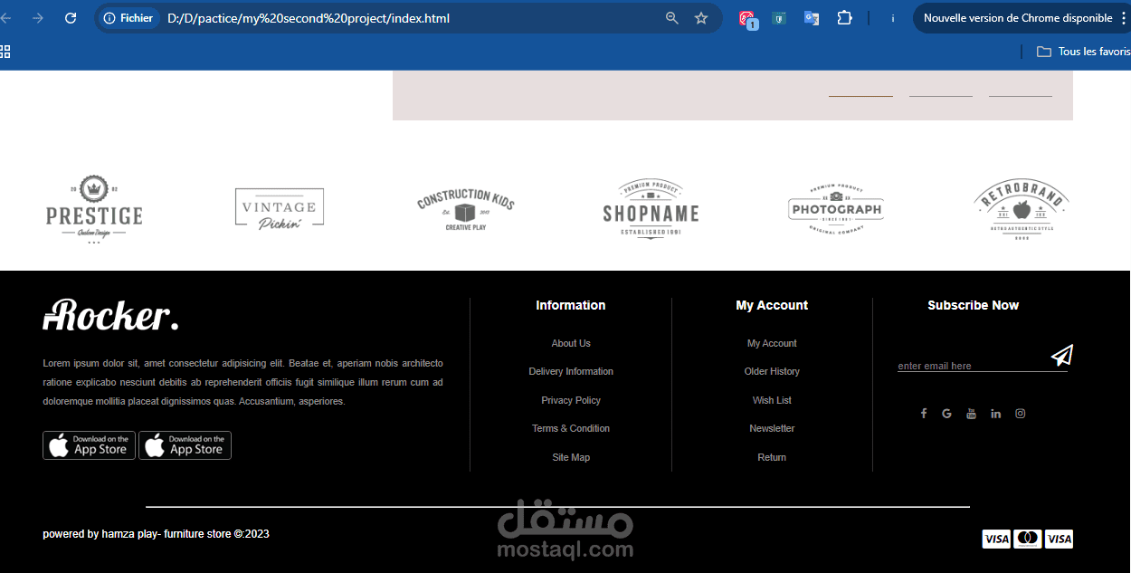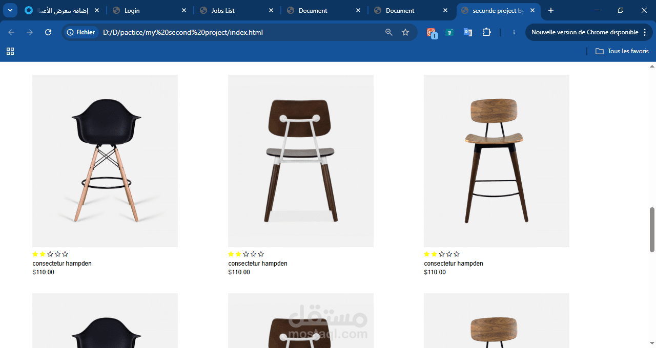 يتضمن: تصميم الصفحة الرئيسية مع شعار وقائمة تصفح، عرض منتج رئيسي (كرسي خشبي)، زر "Shop Now" للتفاعل، وتصميم متجاوب يعمل على الجوال.