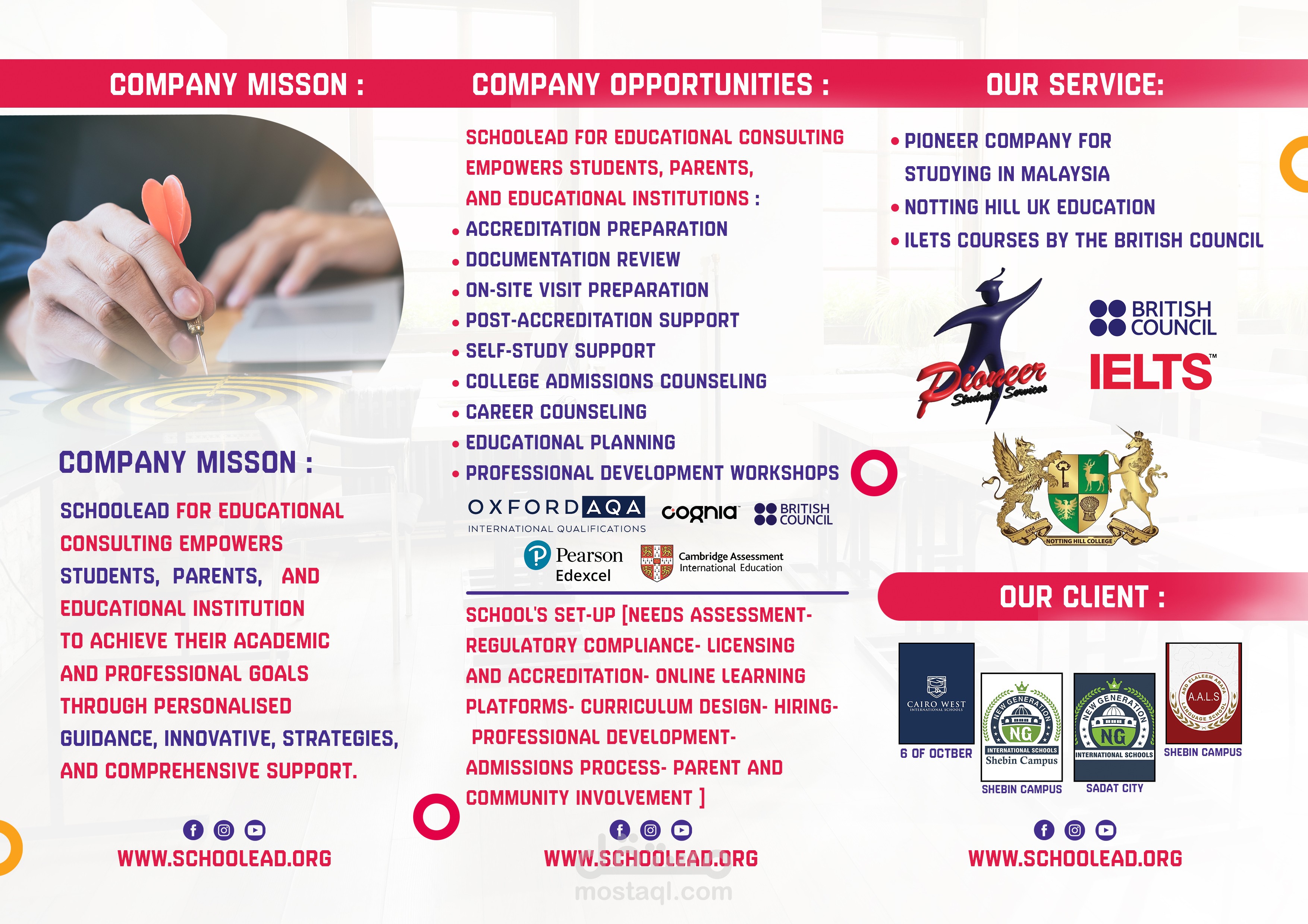 يهدف هذا البروشور إلى تقديم "SCHOOLEAD" ككيان تعليمي رائد وموثوق، من خلال عرض خدماتها وفريقها القيادي بشكل احترافي. إنه تصميم متكامل، جذاب بصرياً، وغني بالمعلومات، مصمم ليكون أداة تسويقية فعالة تترك انطباعاً قوياً لدى الجمهور المستهدف من طلاب وأولياء أمور ومؤسسات تعليمية.