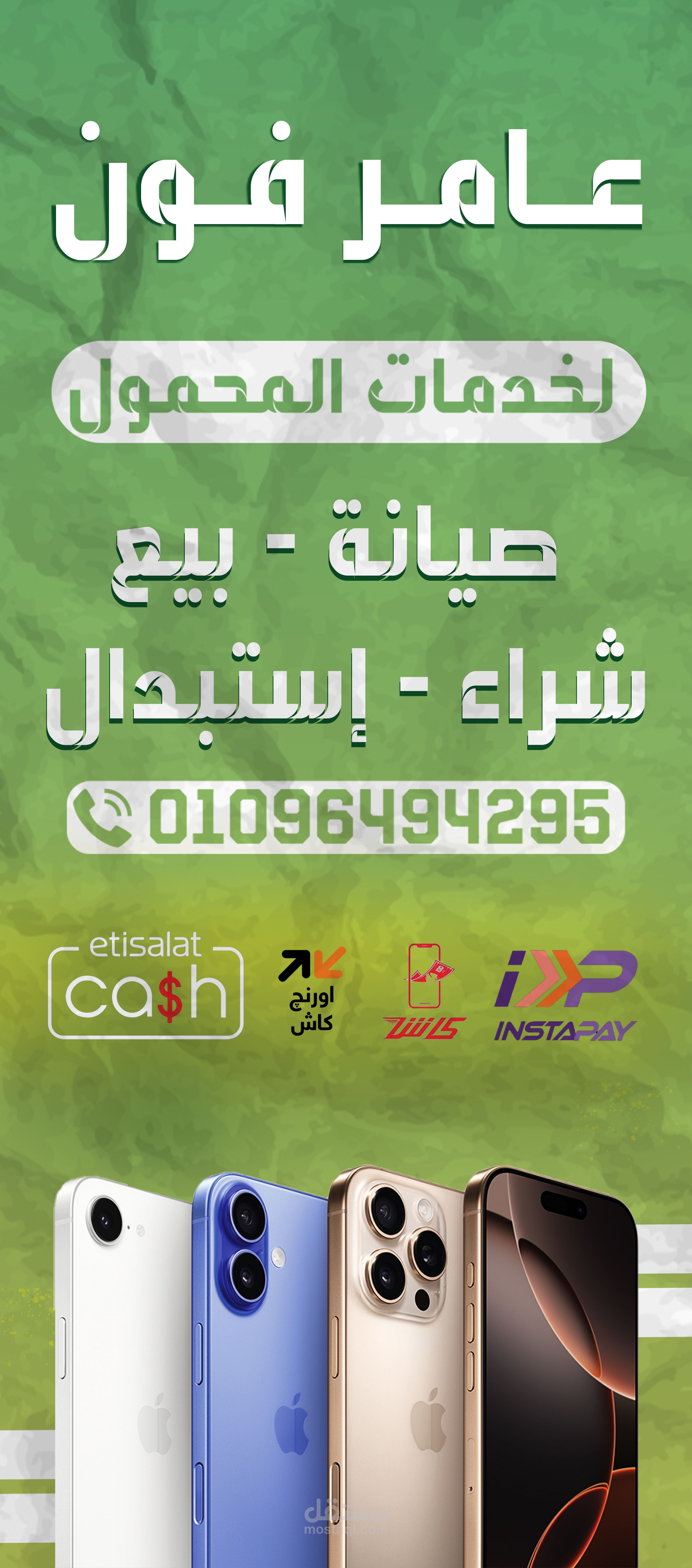 يسرني أن أقدم لكم هذا العمل التصميمي لبانر إعلاني لـ "عامر فون"، وهو يهدف إلى الترويج لخدمات الهواتف المحمولة المتنوعة التي تقدمها الشركة. يجمع البانر بين الجاذبية البصرية والرسالة التسويقية الواضحة، ليلفت انتباه الجمهور المستهدف ويعكس الشمولية في الخدمات المقدمة.