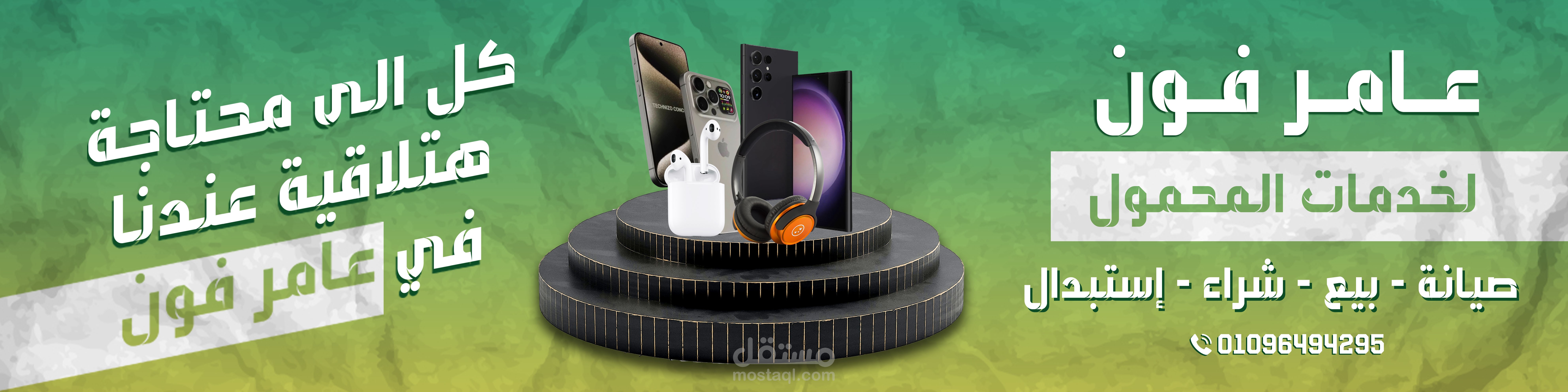 معلومات الاتصال: يتم تضمين رقم الهاتف للتواصل المباشر مع "عامر فون" في أسفل يمين البانر.