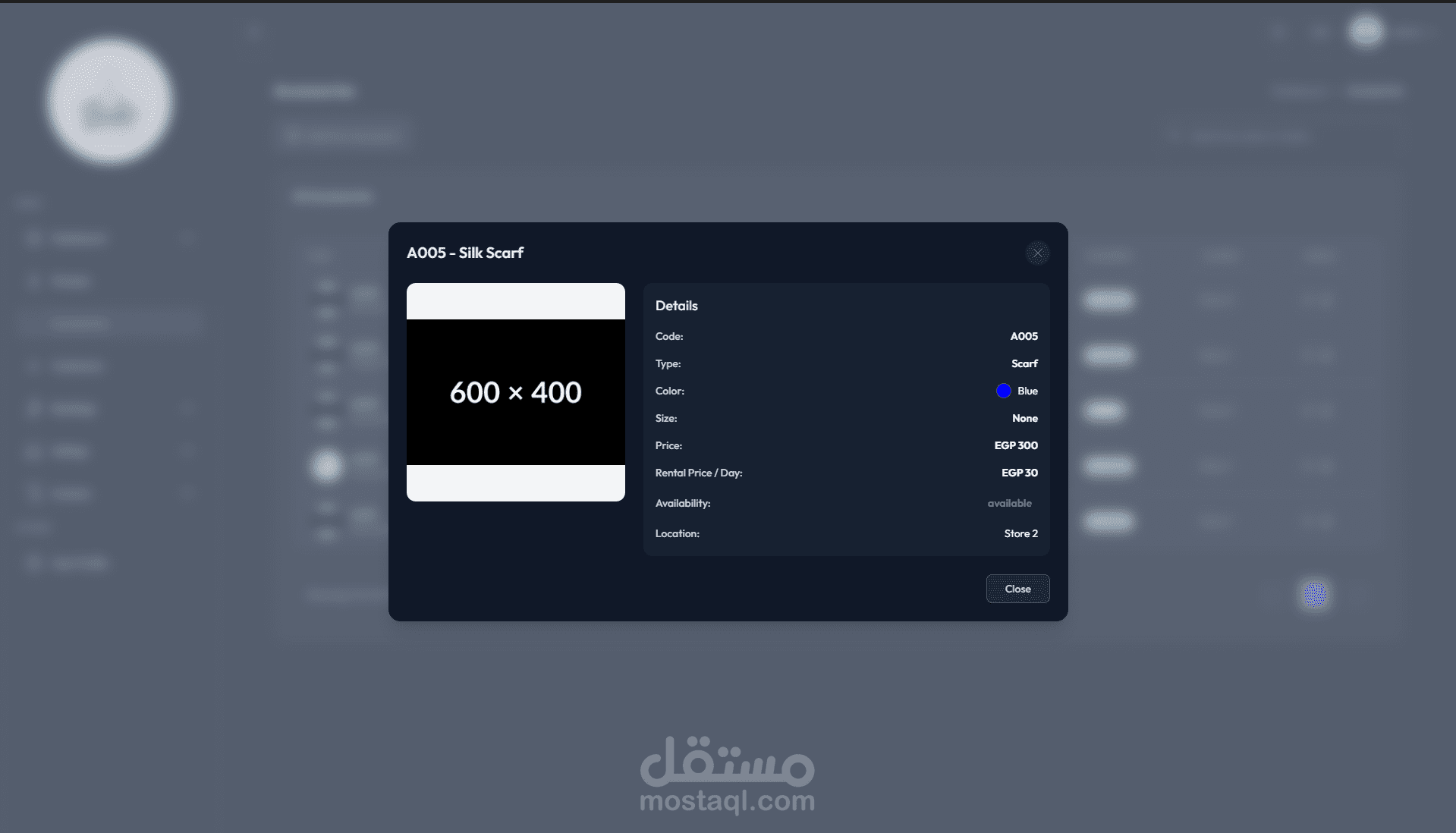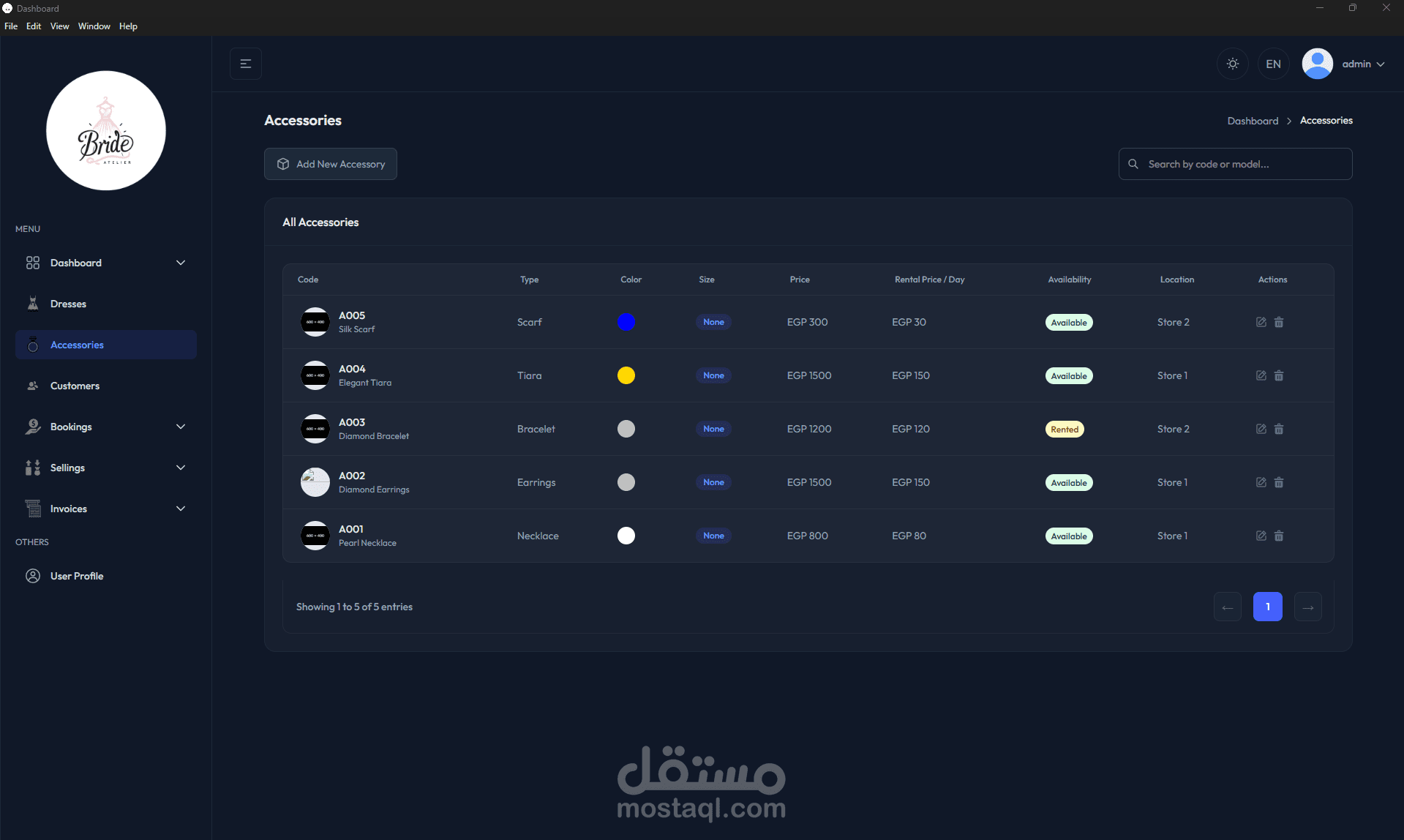 الإكسسوارات: إدارة كاملة للإكسسوارات المتاحة مثل التيجان والأقراط والأوشحة، مع تسجيل حالتها وموقعها وسعر إيجارها.