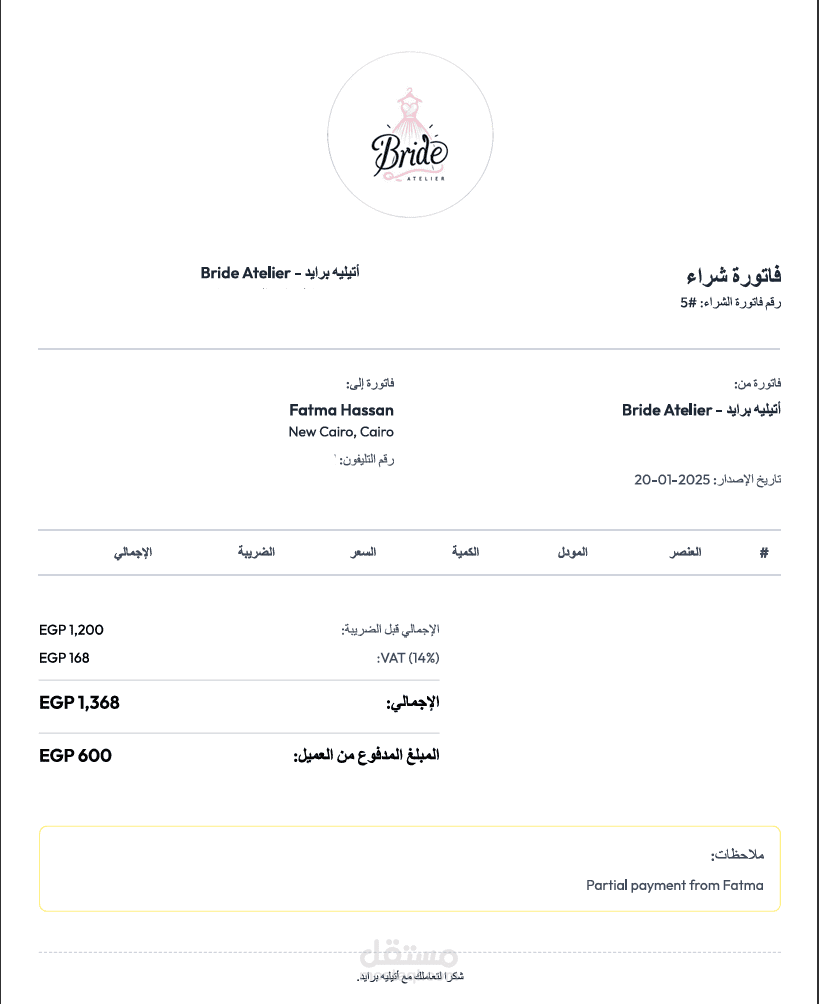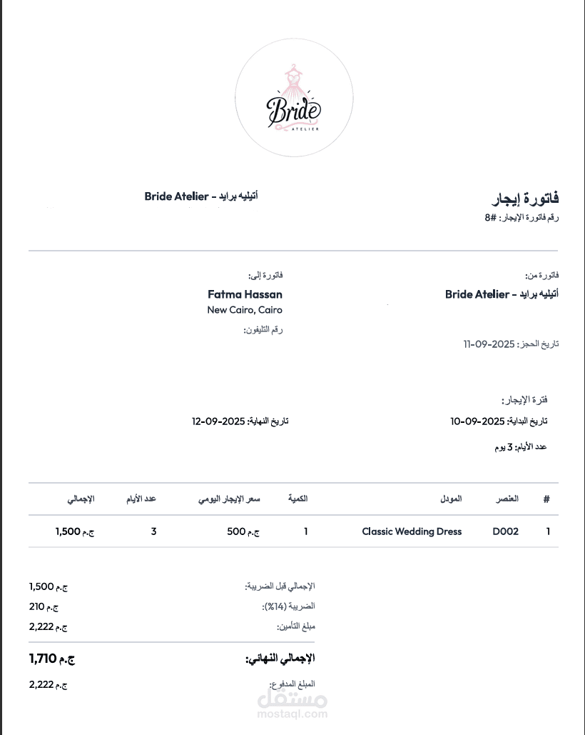 تتضمن الفاتورة جميع التفاصيل اللازمة: بيانات الأتيليه والعميل، تفاصيل القطعة المستأجرة، فترة الإيجار، التكلفة الإجمالية، قيمة الضريبة المضافة (14%)، ومبلغ التأمين.