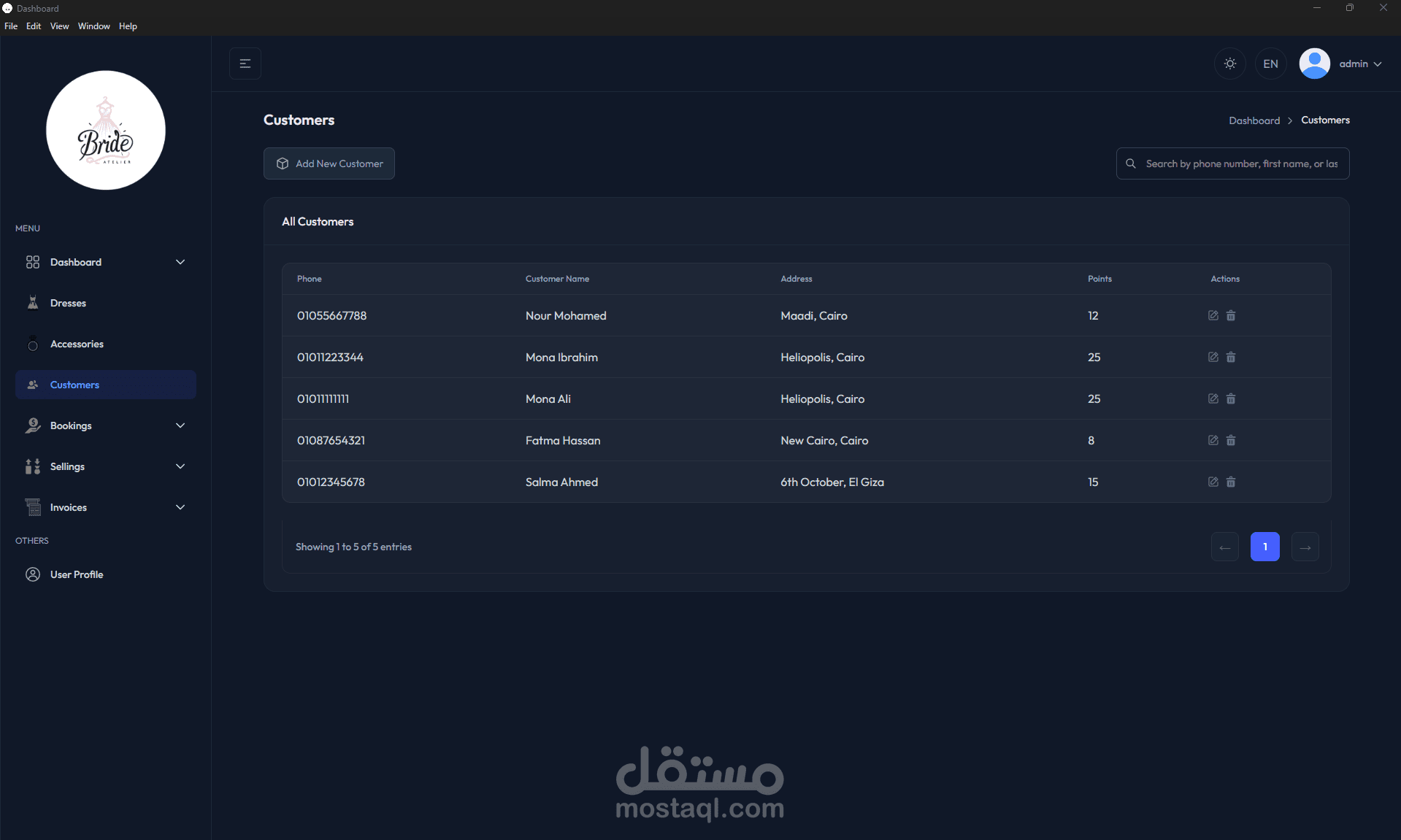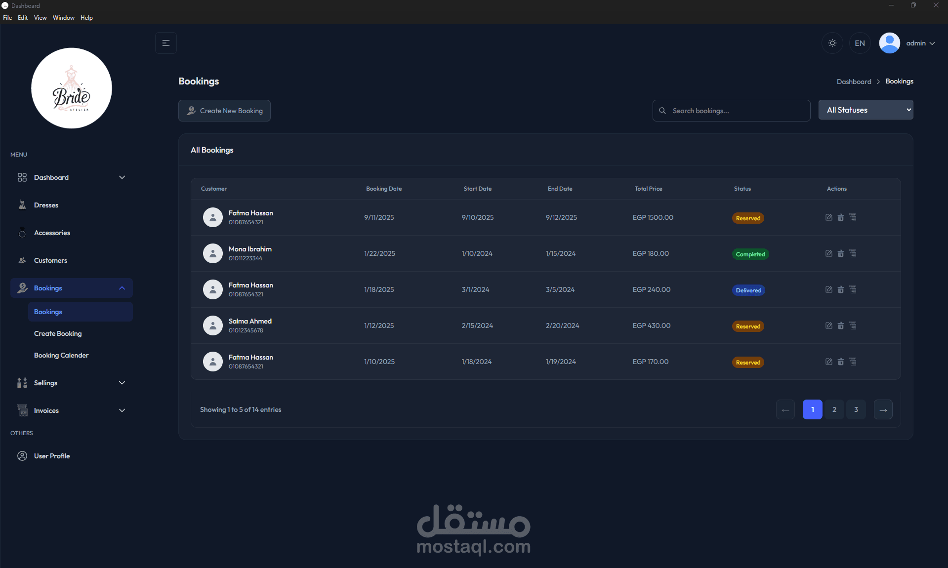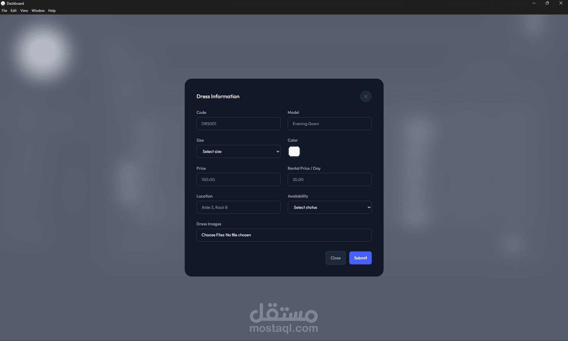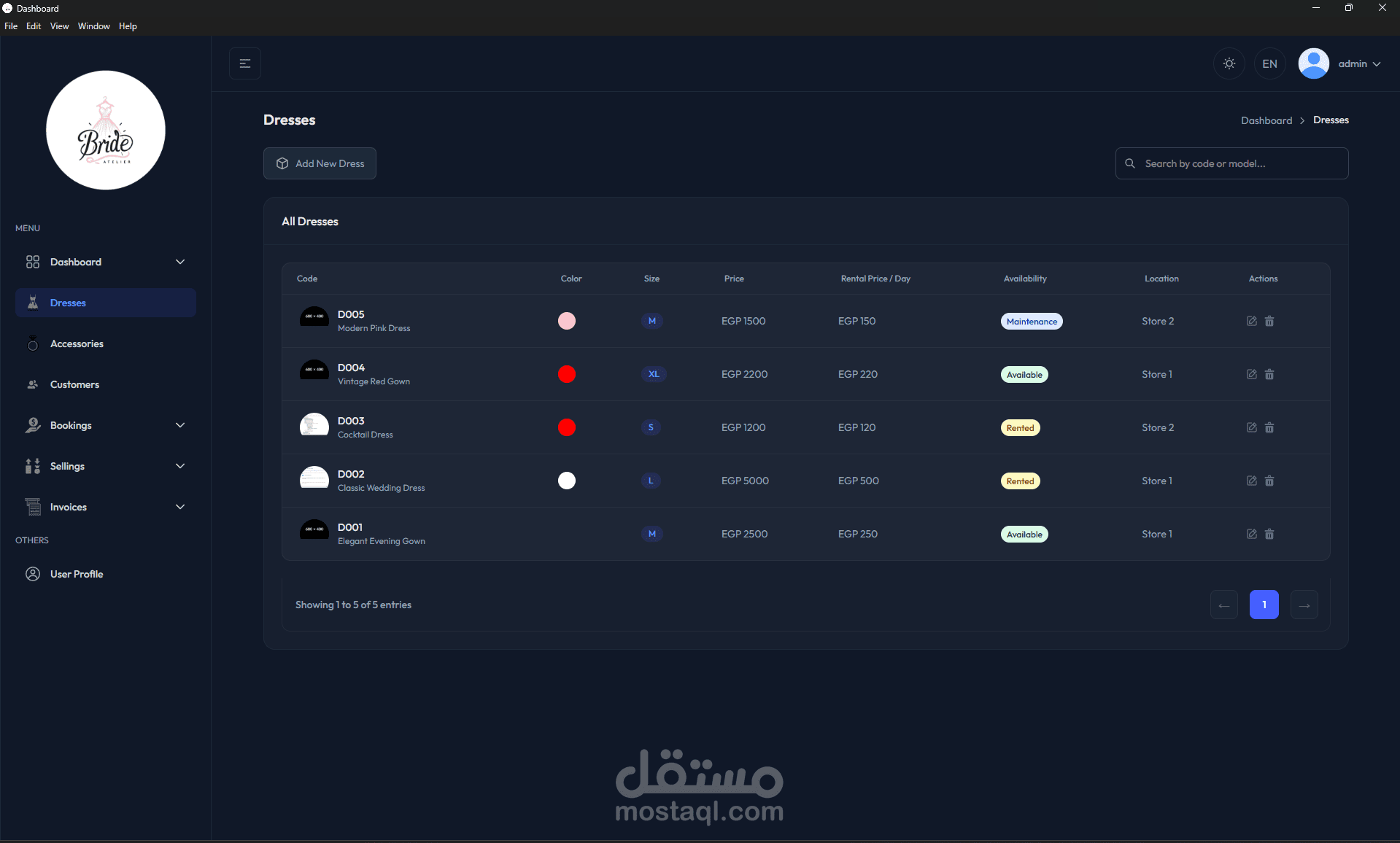 الفساتين: قسم خاص لإدارة مخزون الفساتين، حيث يمكن إضافة وتعديل كل فستان مع تتبع تفاصيله مثل الكود، الموديل، اللون، المقاس، سعر الإيجار اليومي، وحالة التوفر (متاح، محجوز، تحت الصيانة).