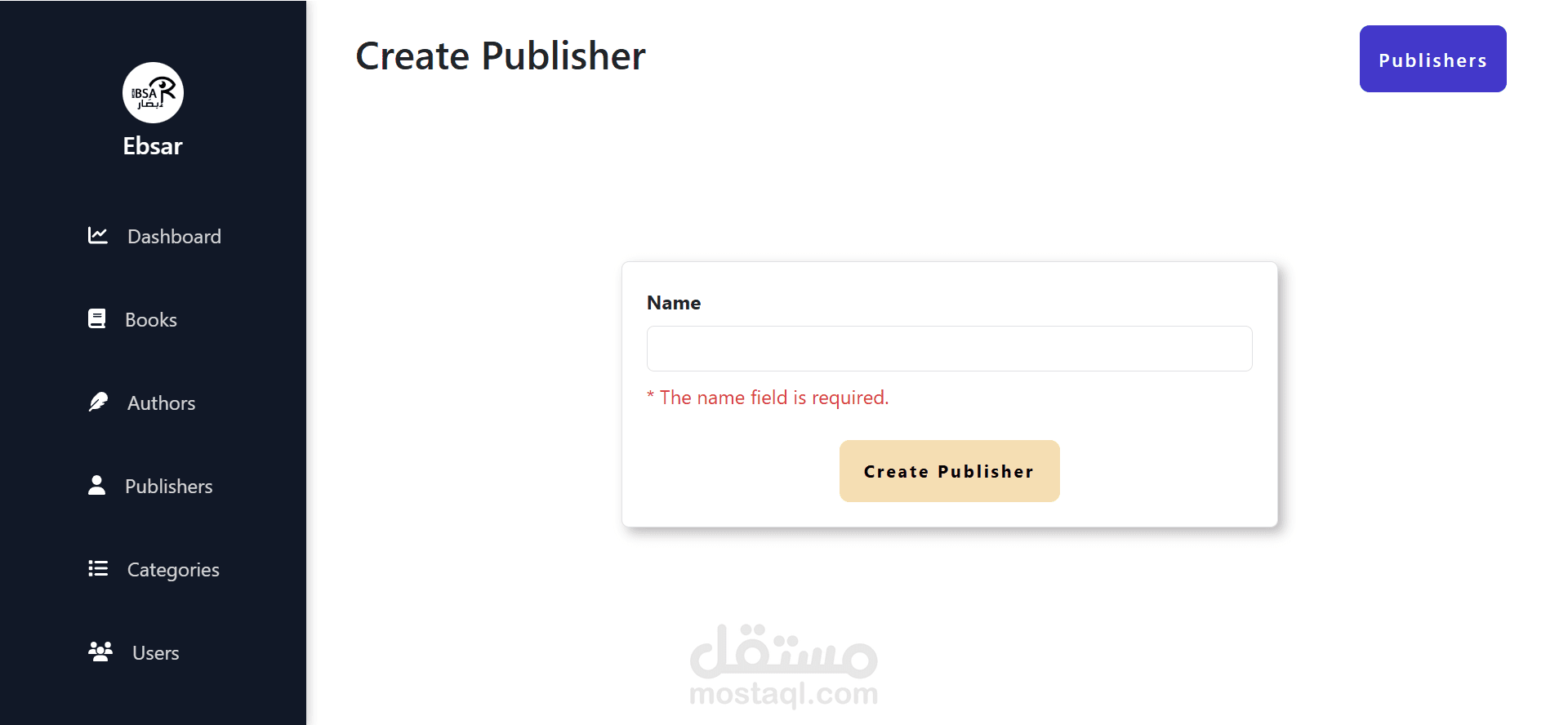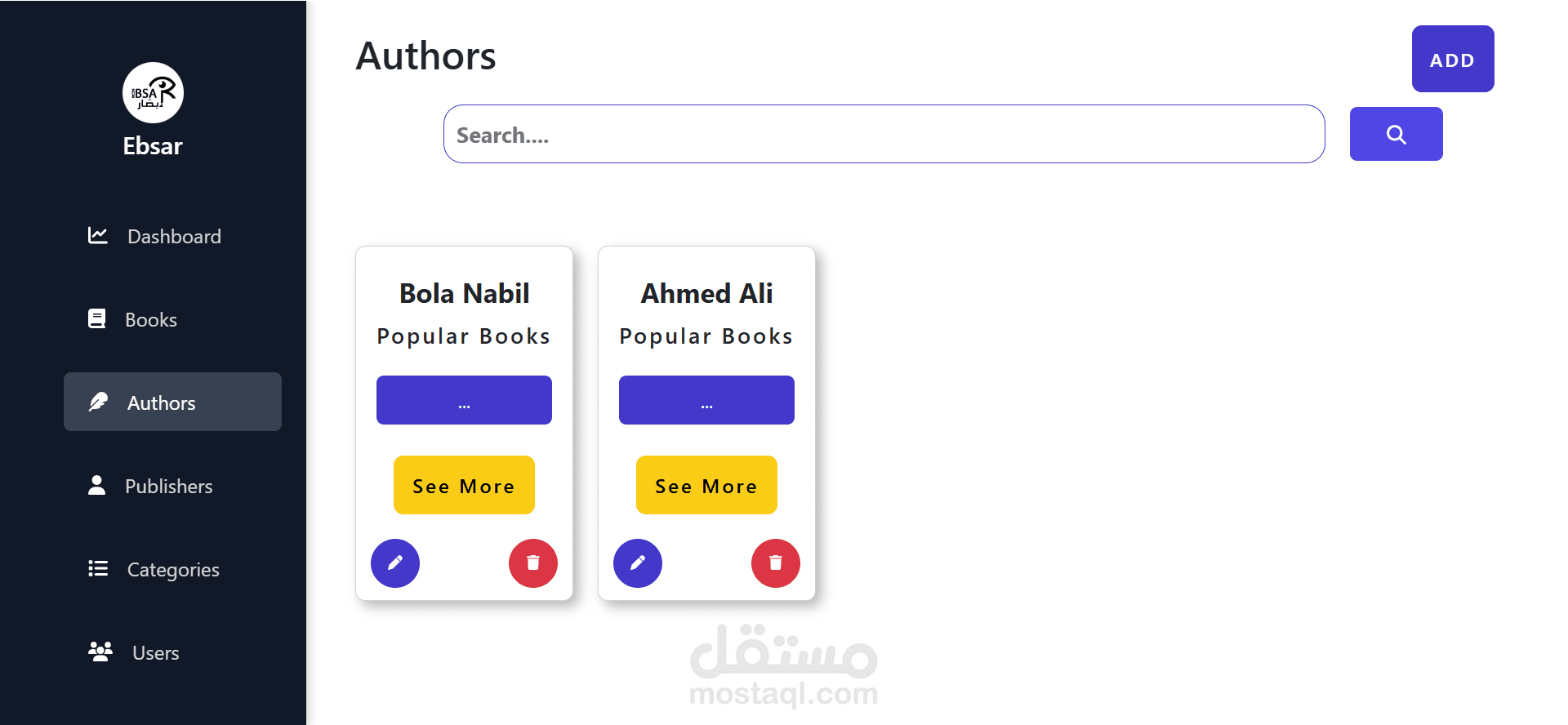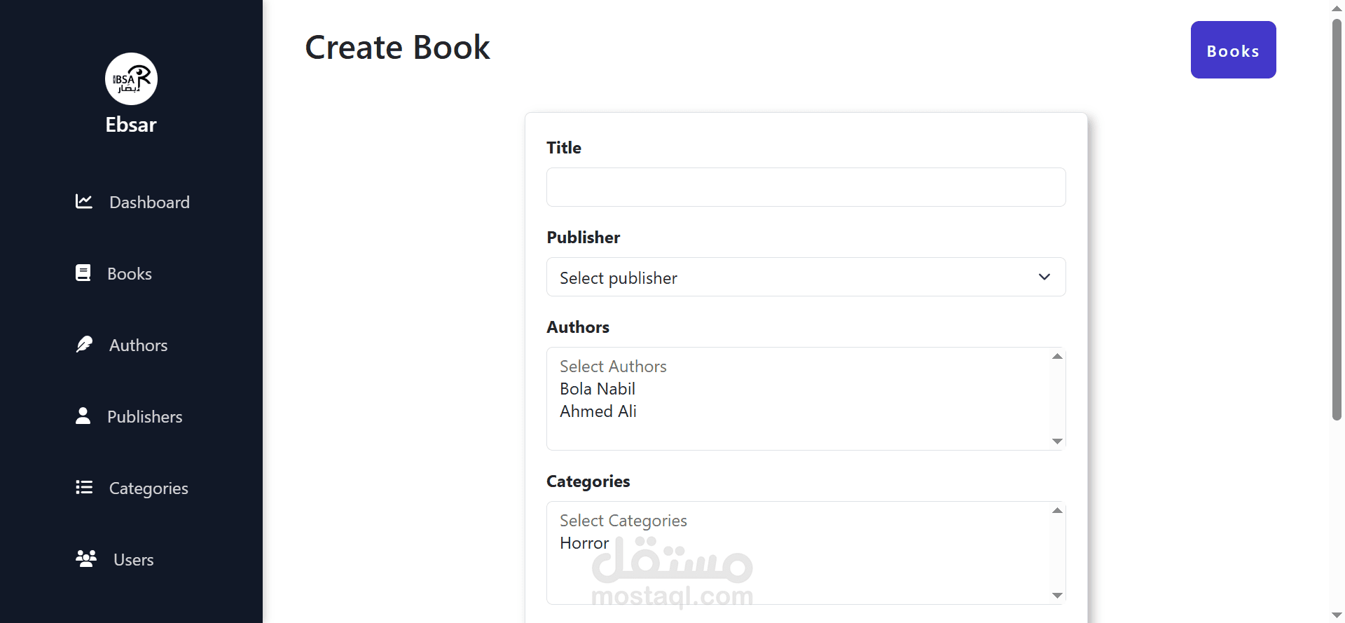مشروع Ebsar هو الواجهة الأمامية لتطبيق إدارة الكتب / المكتبة، حيث يسهل على المستخدمين عرض الكتب، إضافتها، تعديلها، حذفها، والتفاعل مع بيانات الكتب المرتبطة بالمؤلفين والفئات والناشرين. يقدم تجربة مستخدم سلسة وتفاعلية، باستخدام تقنيات حديثة لإدارة الحالة وواجهة عرض جميلة.