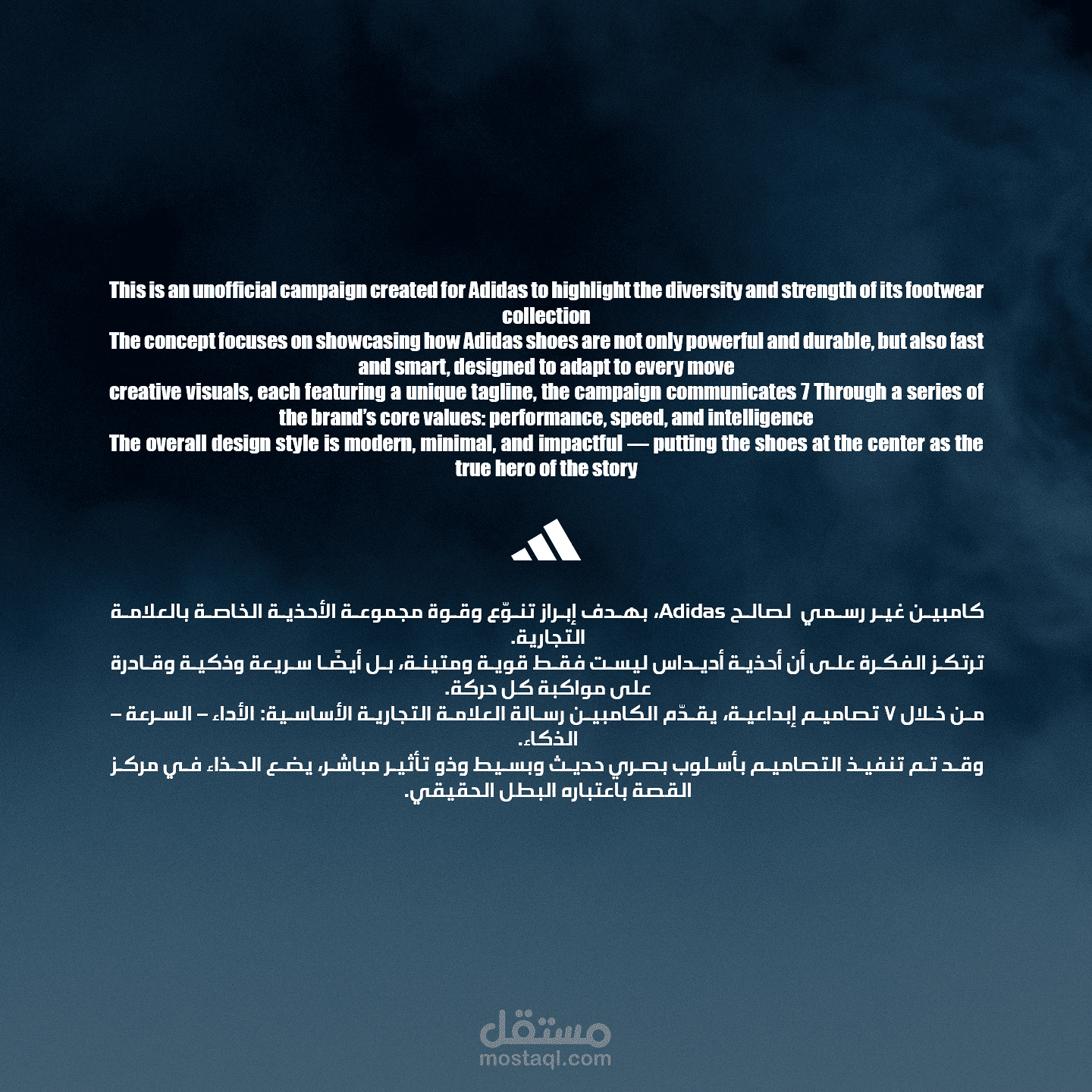 The Adidas Unofficial Footwear Campaign is a dynamic visual campaign concept crafted for promoting Adidas footwear in a sport-centric social media environment. It combines powerful imagery, bold typography, and high contrast colours to evoke energy and athleticism. The designs include social media posts, campaign banners, promotional graphics, and mockups that showcase the footwear in action, aiming to engage sports fans and drive brand visibility. Using sleek layouts and strong motion suggestions, this campaign maintains a premium and compelling aesthetic.