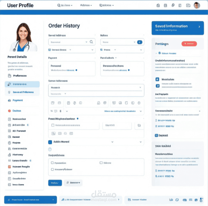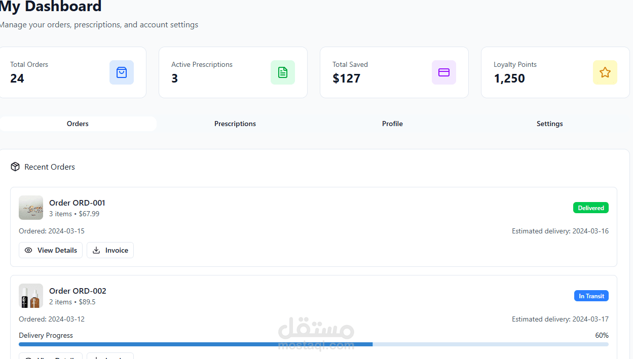 لوحة تحكم العميل (الطلبات، الروشتات، الحساب الشخصي).