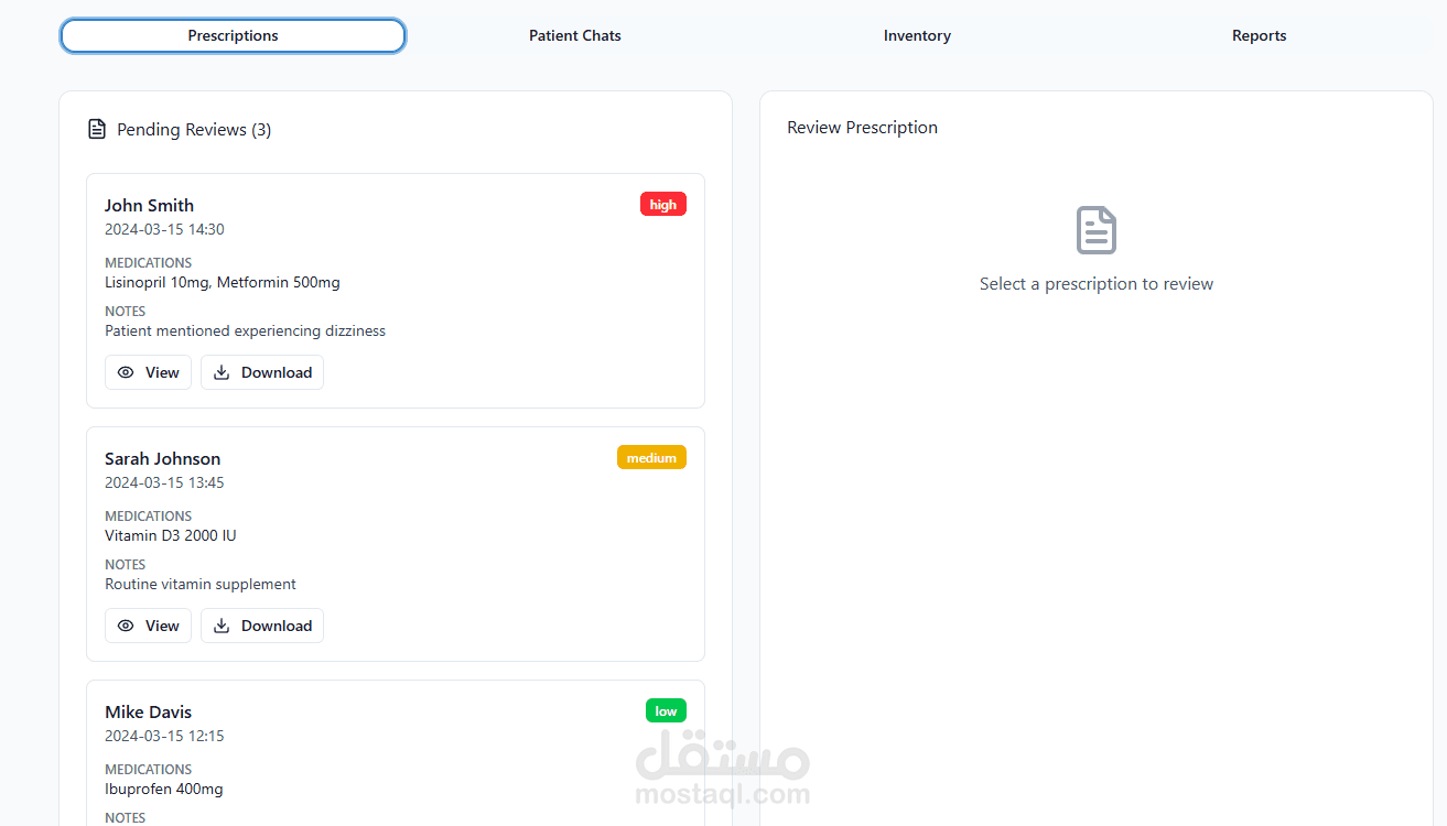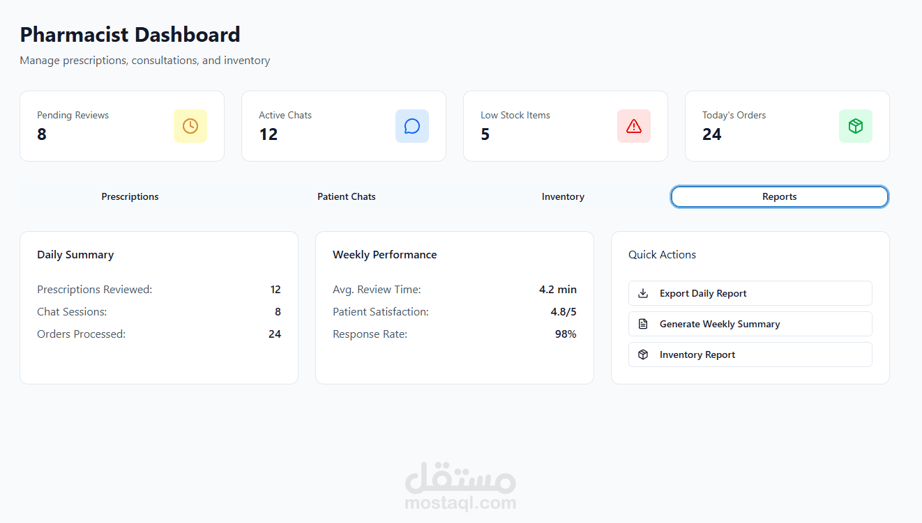 لوحة تحكم الصيدلي (إدارة المخزون + مراجعة الروشتات).