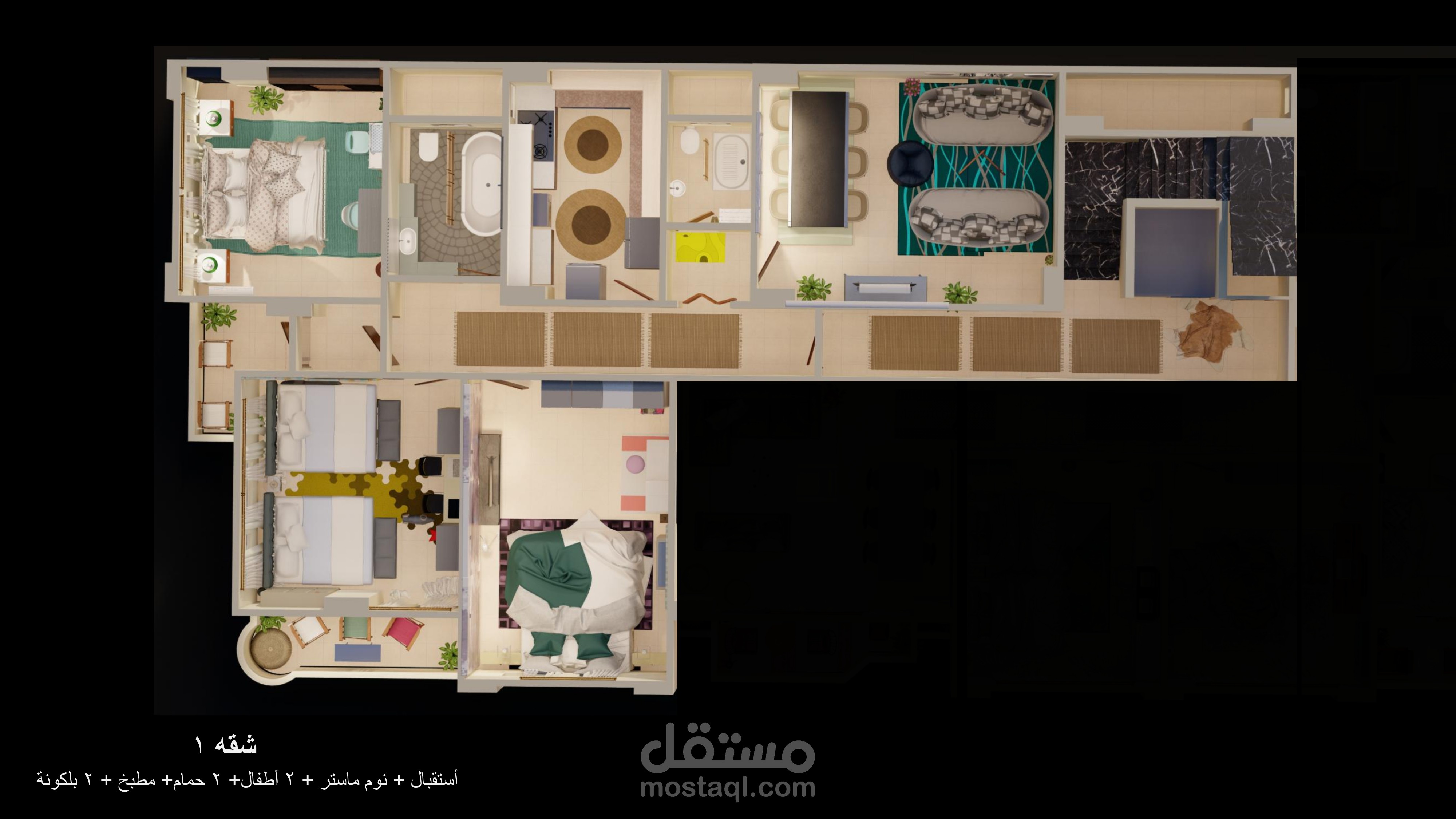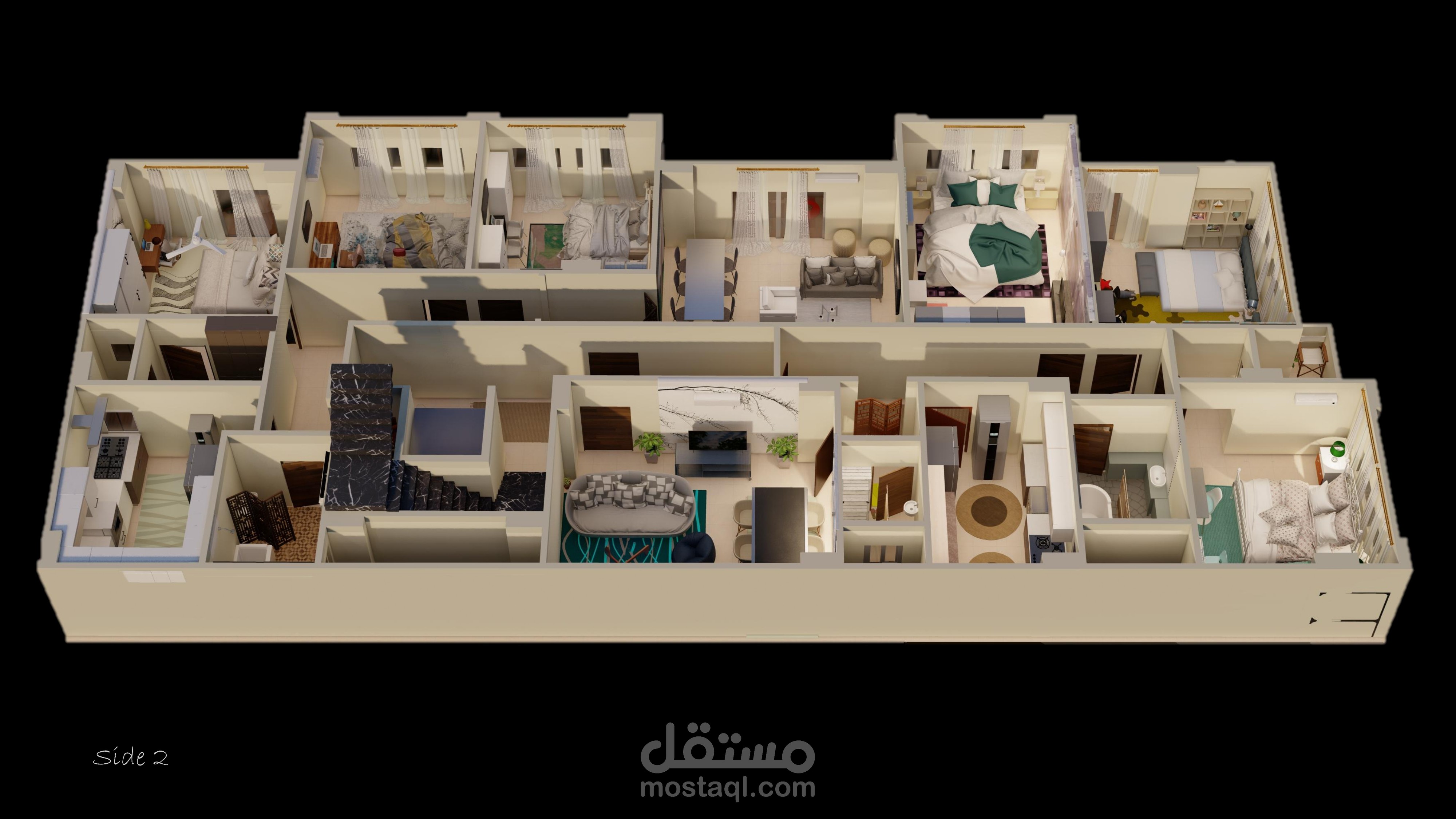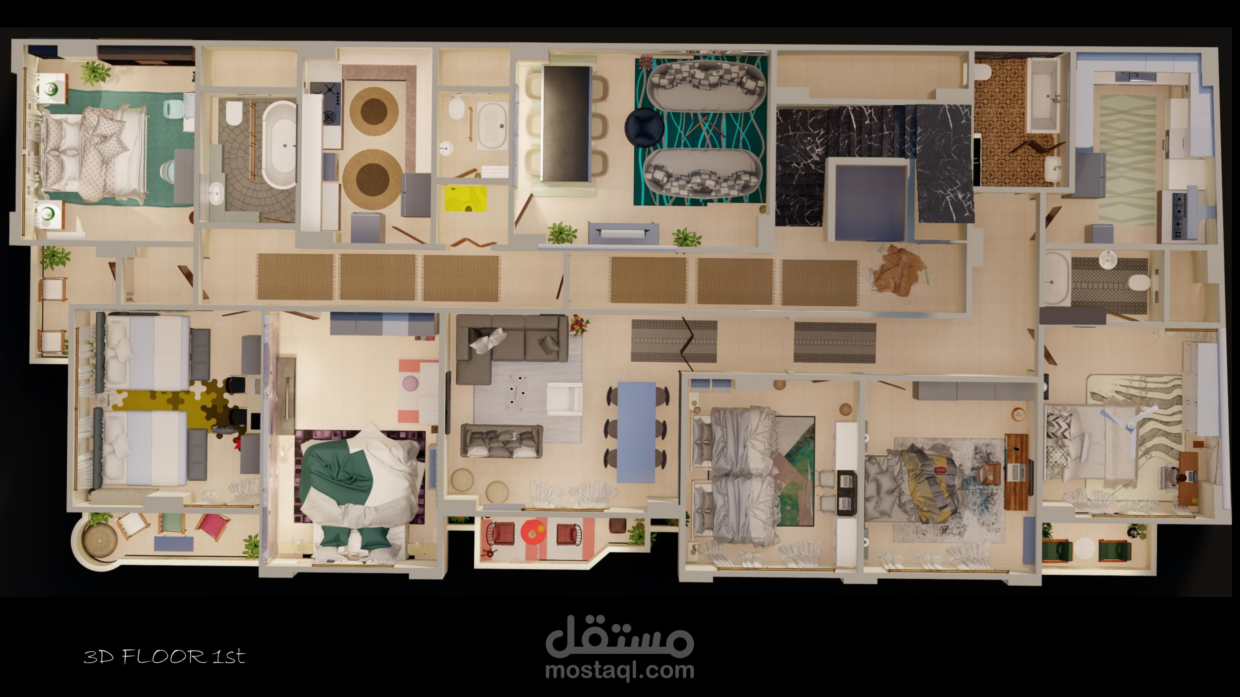 يُظهر التصميم استخدام أثاث متنوع يناسب وظيفة كل غرفة، مثل الأسرّة، الأرائك، الطاولات، والكراسي.