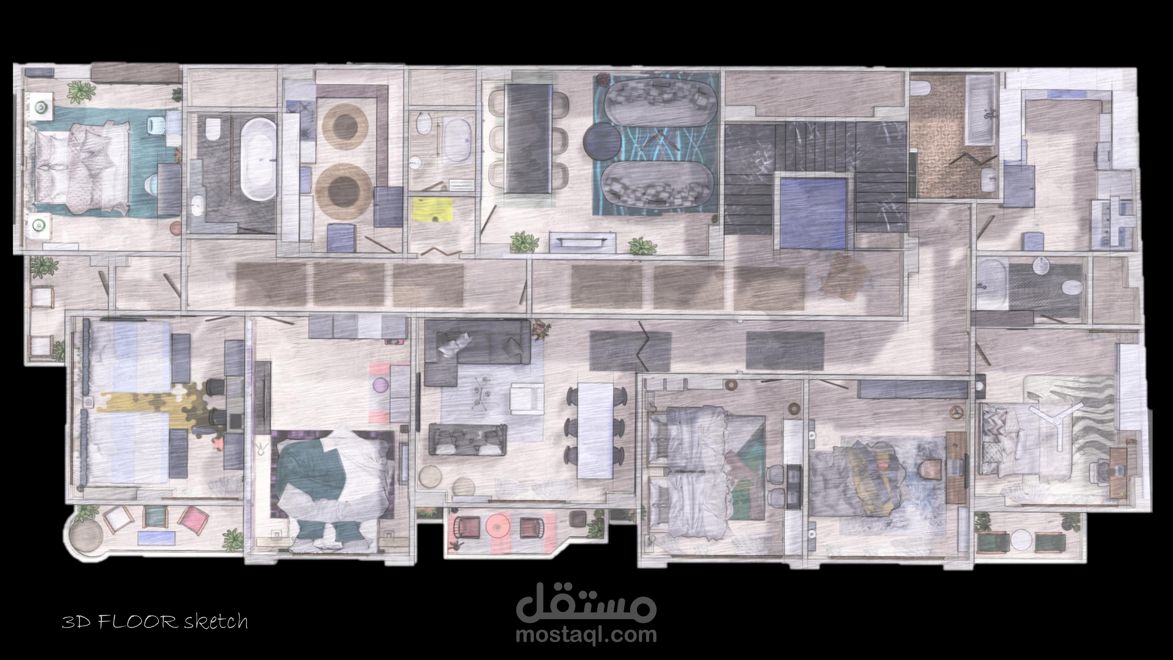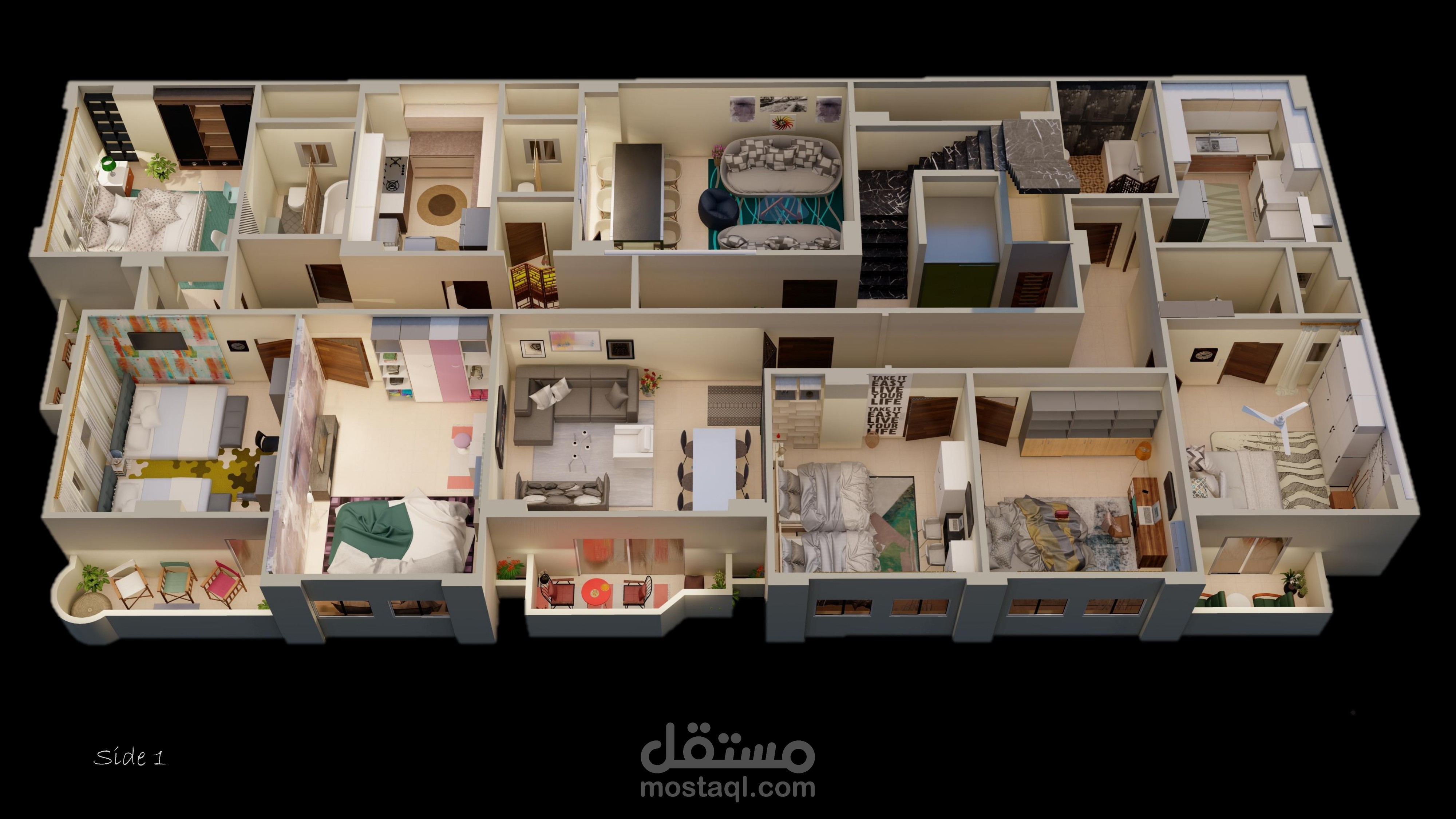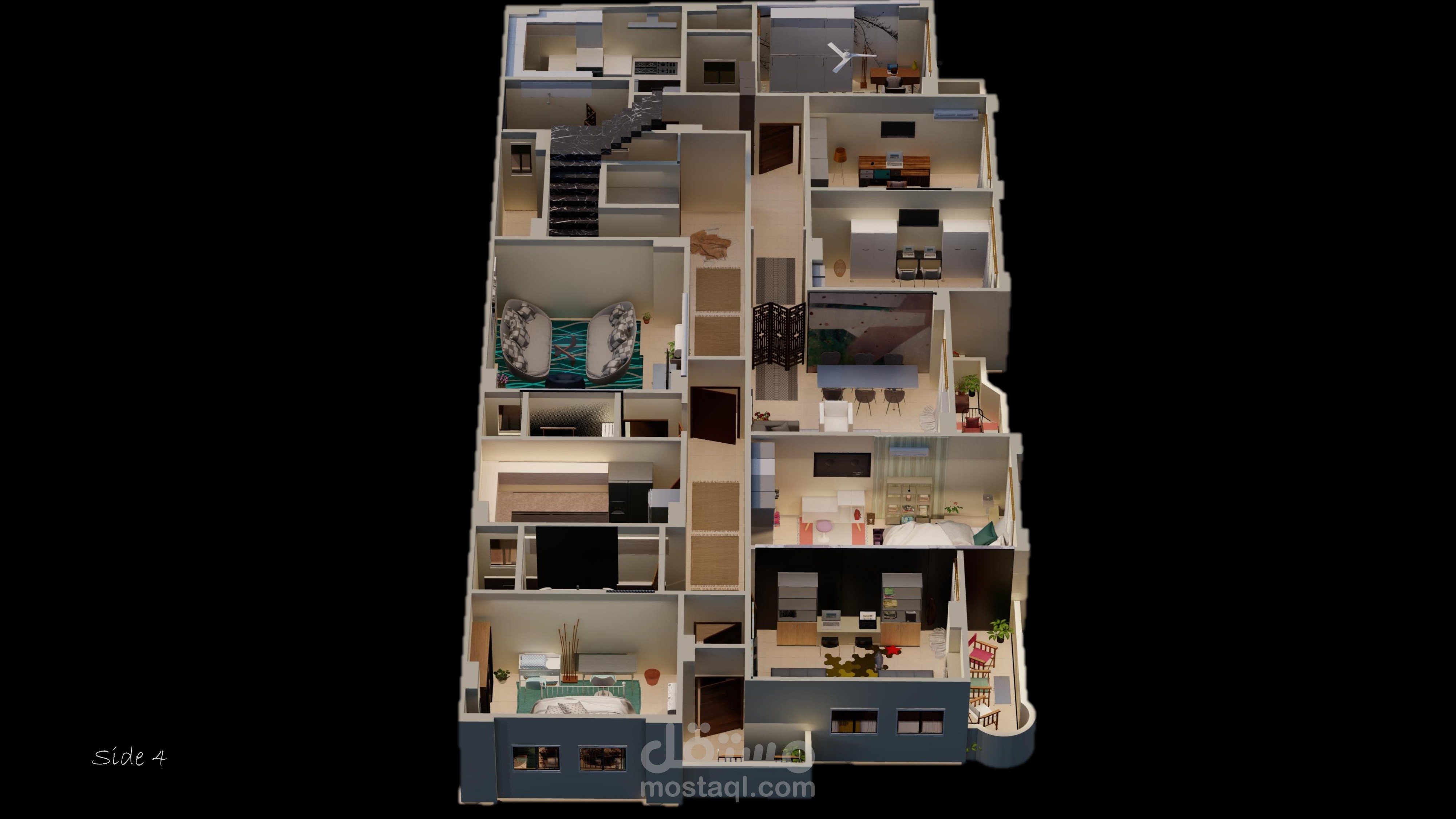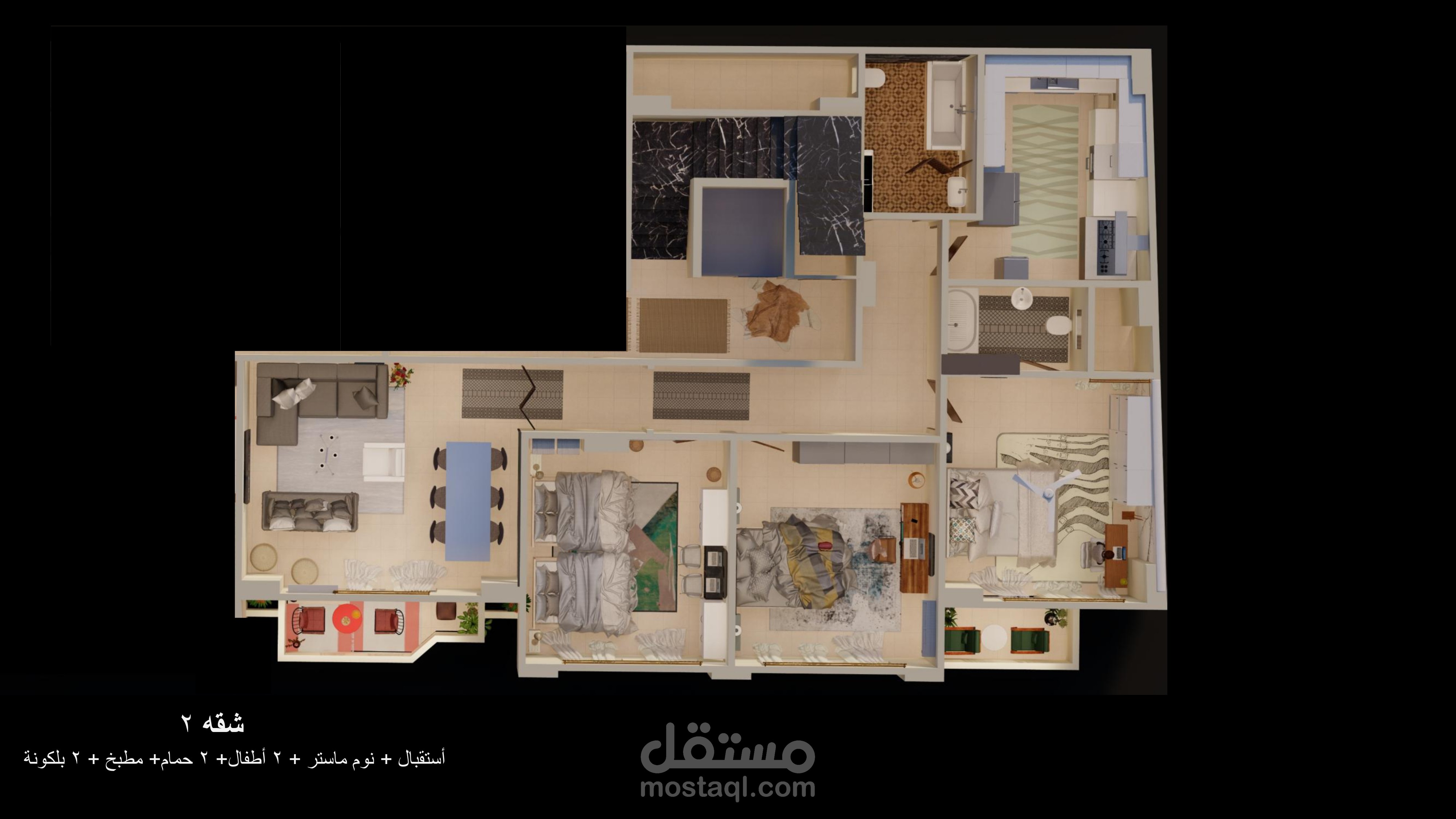 يُظهر التصميم استخدام أثاث متنوع يناسب وظيفة كل غرفة، مثل الأسرّة، الأرائك، الطاولات، والكراسي.