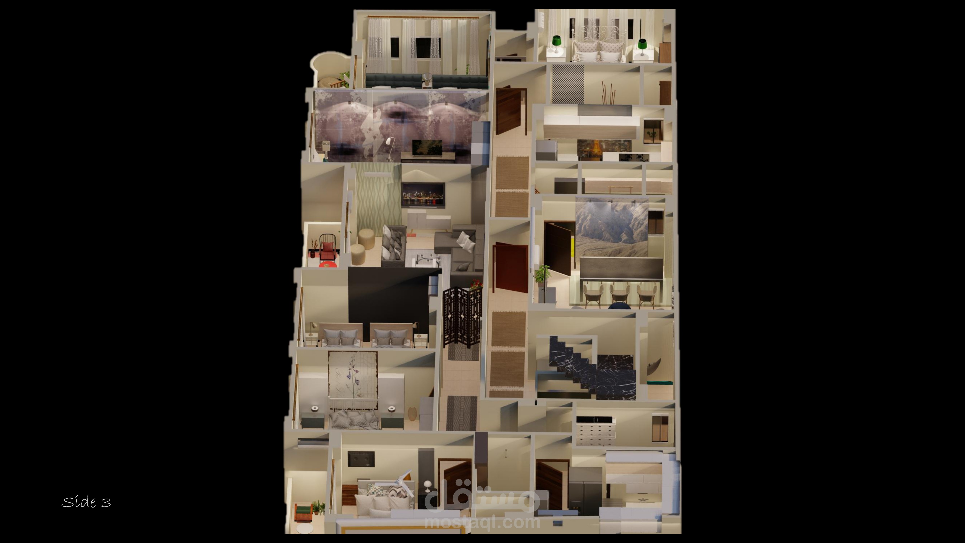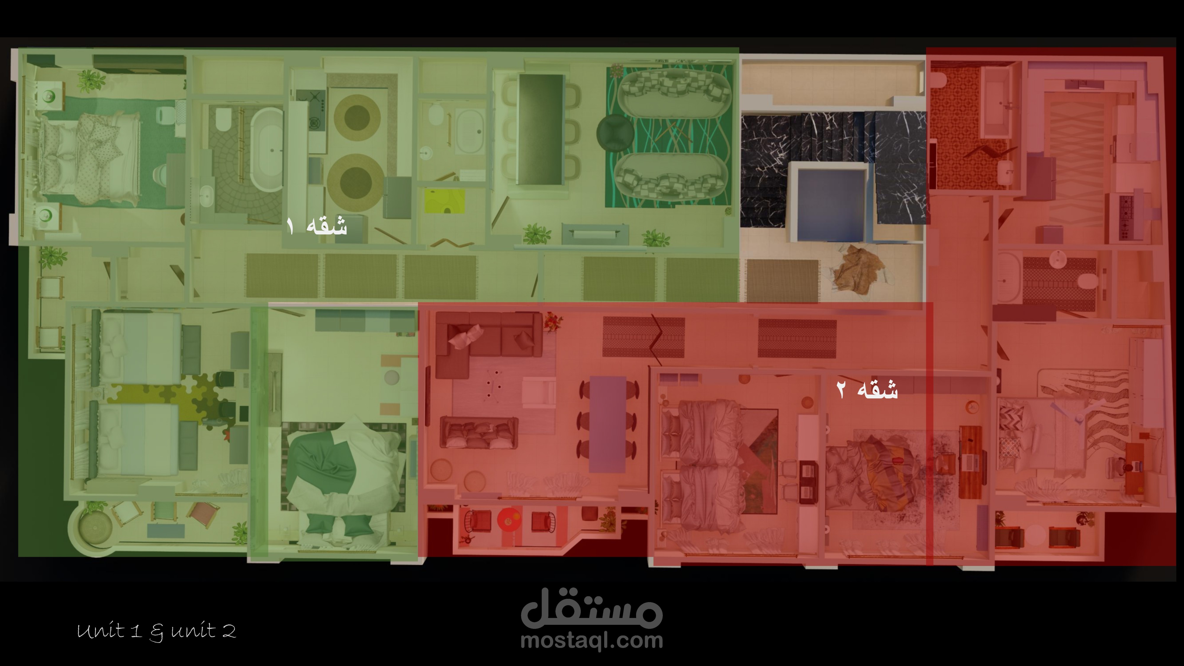 يُلاحظ الاهتمام بالتوازن البصري وتناسق الألوان والمواد المستخدمة في كل مساحة.