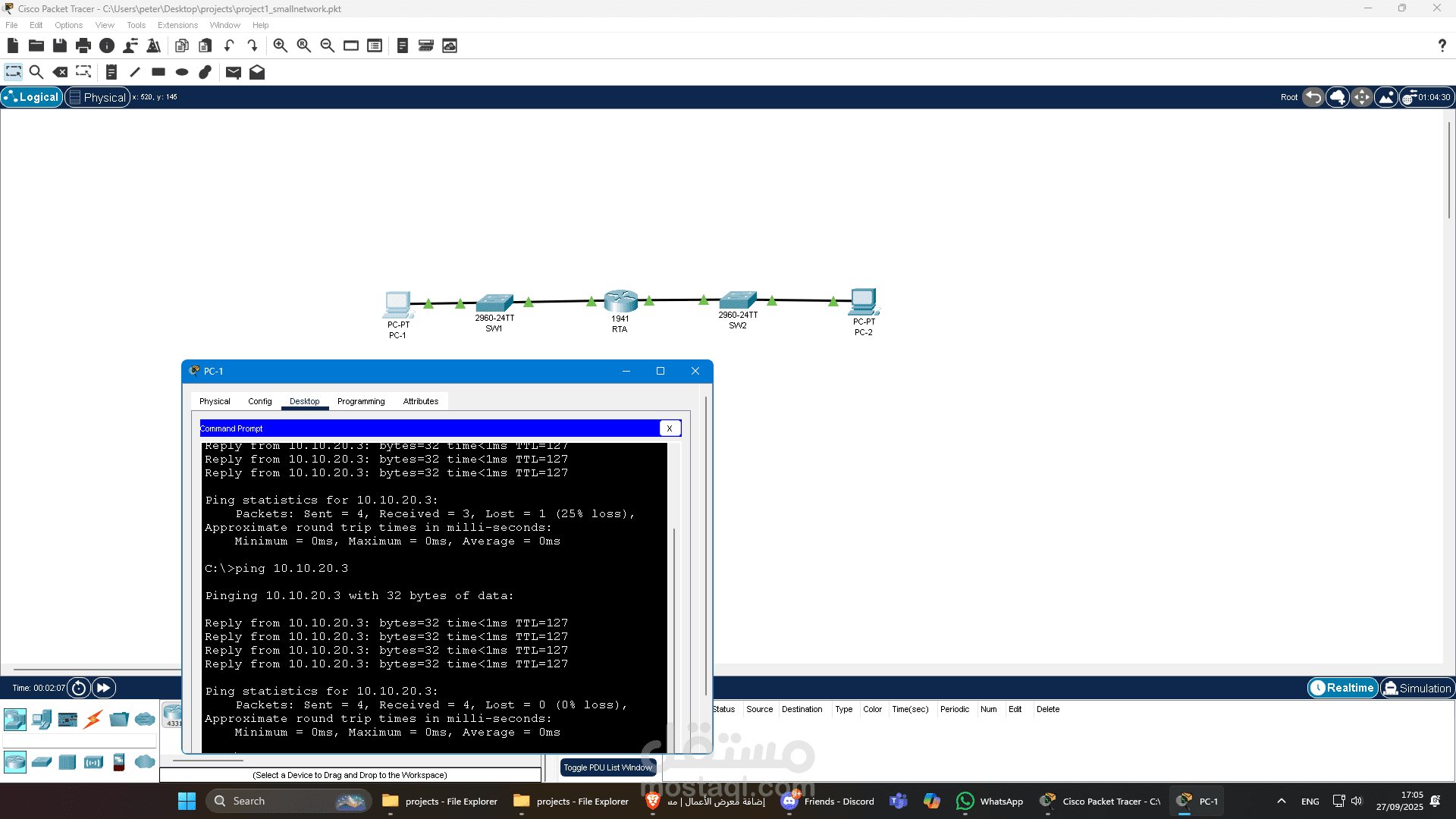 الهدف الأساسي هو تدريب عملي على كيفية بناء شبكة صغيرة من البداية وتكوين الأجهزة وإعداد IP Address لكل جهاز وضبط Gateway بحيث الشبكة تشتغل بشكل كامل وتسمح للأجهزة إنها تتواصل مع بعض المشروع ده يعتبر خطوة أساسية لأي حد عايز يفهم مبادئ الشبكات ويطبقها بشكل عملي
