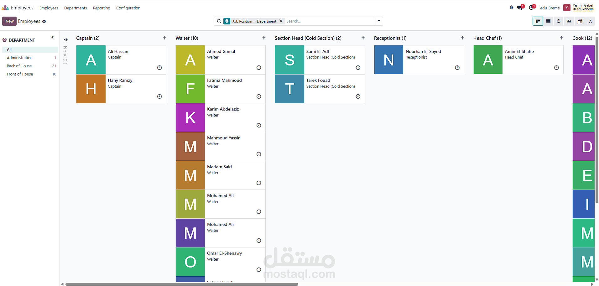 بناء قاعدة بيانات كاملة للموظفين مقسمة حسب الأقسام (صالة ومطبخ) والهيكل الوظيفي.