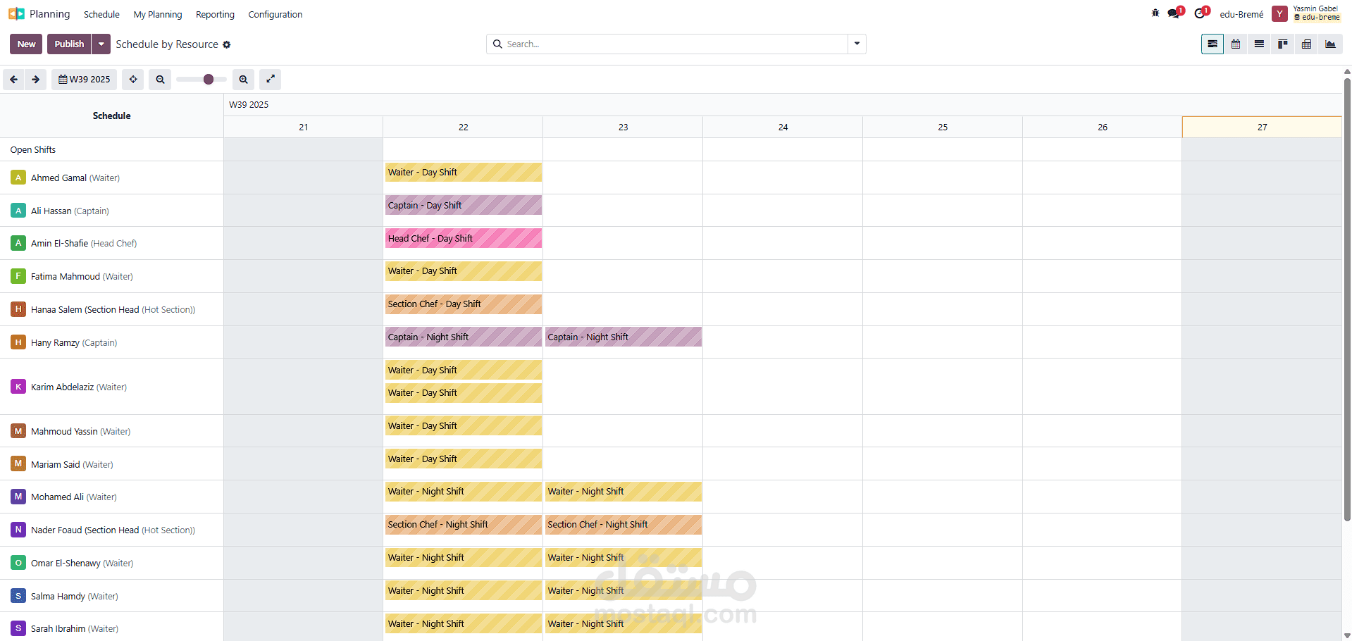 قمت بتصميم وتنفيذ حل متكامل باستخدام موديولات Odoo لإدارة الموظفين والتخطيط. الحل شمل: