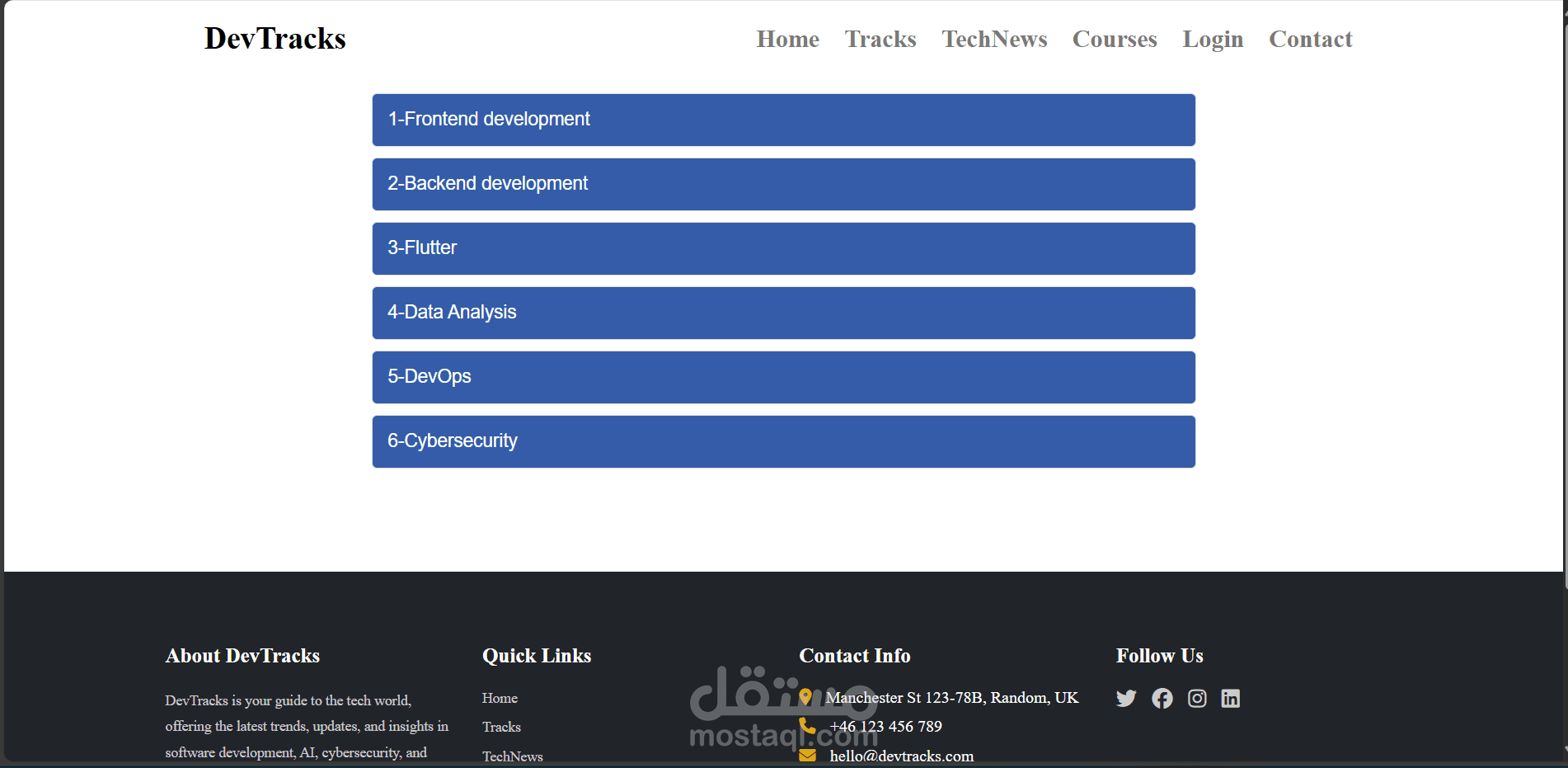 تتكون المنصة من خمس صفحات رئيسية: الصفحة الرئيسية، المسارات التعليمية، الأخبار التقنية، الدورات التدريبية، وصفحة التواصل.