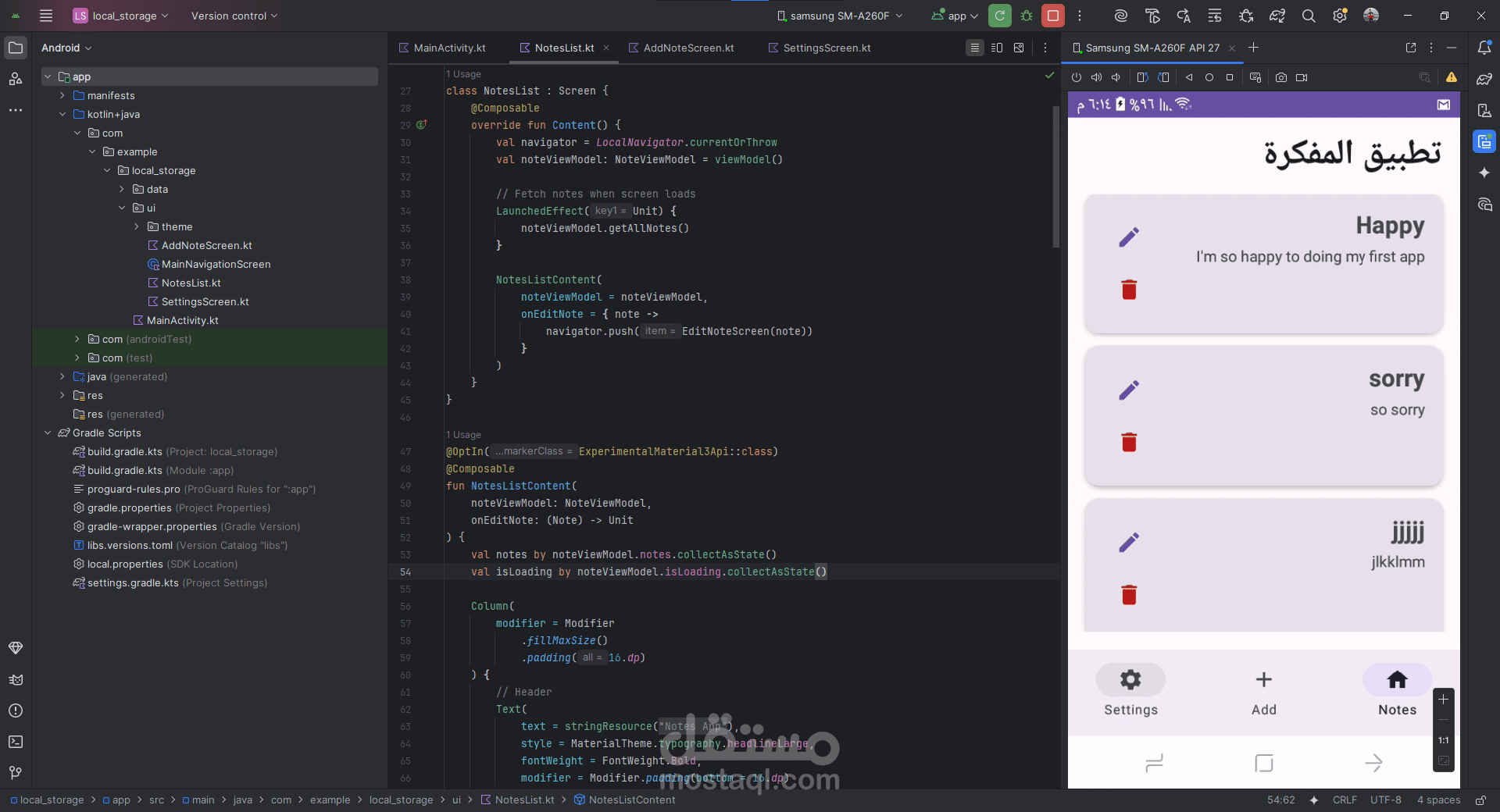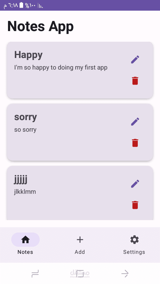 شاشة عرض الملاحظات (NotesList): تعرض جميع الملاحظات مع خيارات تعديل و حذف .