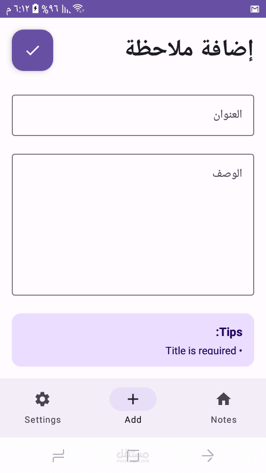 شاشة إضافة الملاحظات (AddNote): يمكن إدخال عنوان ووصف للملاحظة مع زر حفظ .