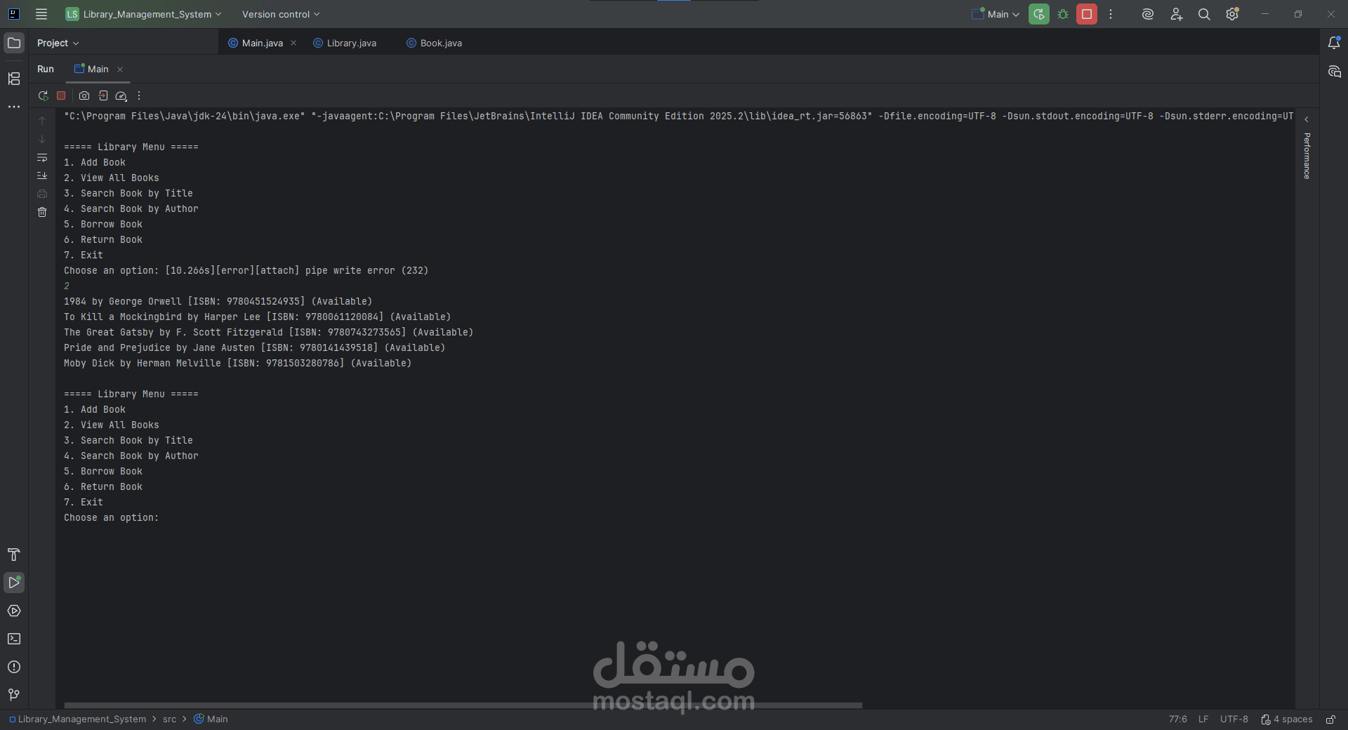 برمجة تطبيق مكتبي (Console-Based Application) بلغة Java لإدارة مكتبة بسيطة تشمل وظائف مثل: