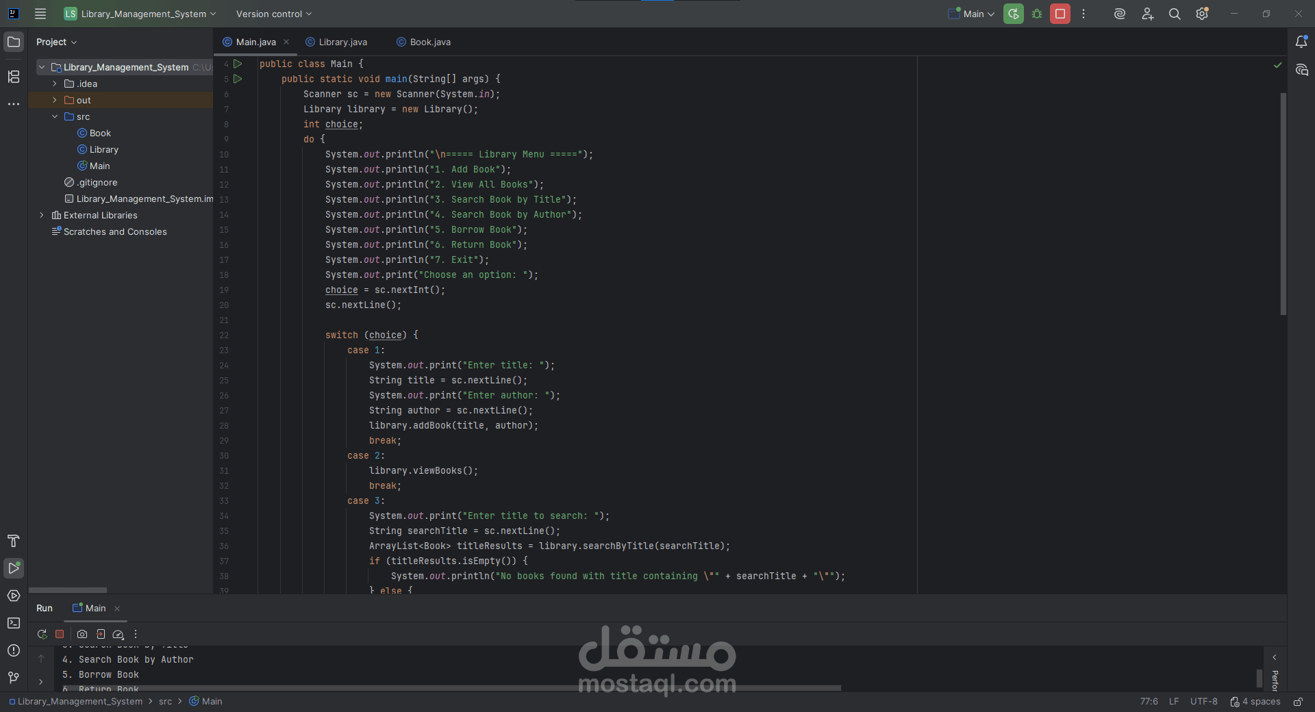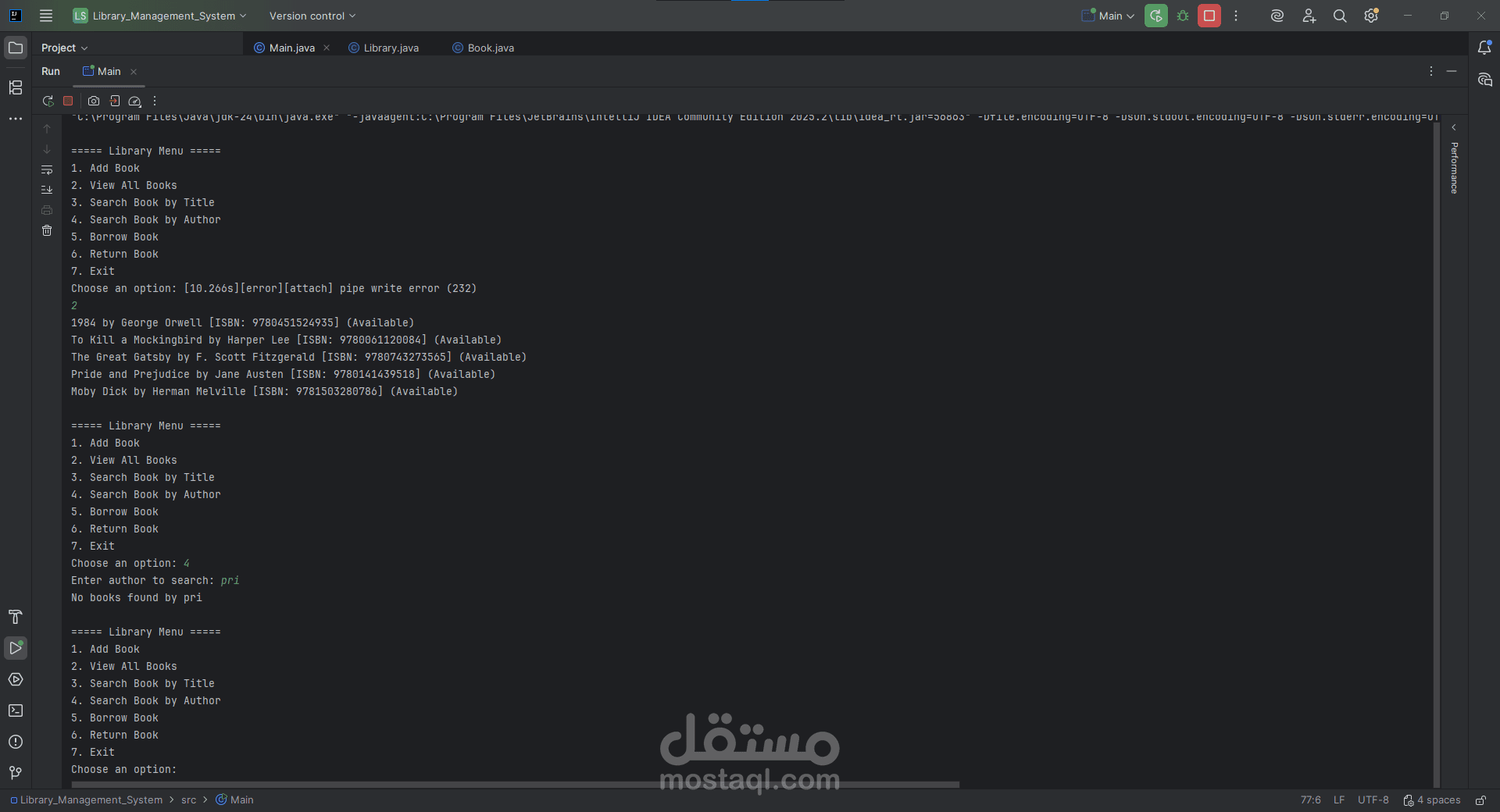 Library.java: يحتوي على الدوال والعمليات الخاصة بإدارة الكتب.