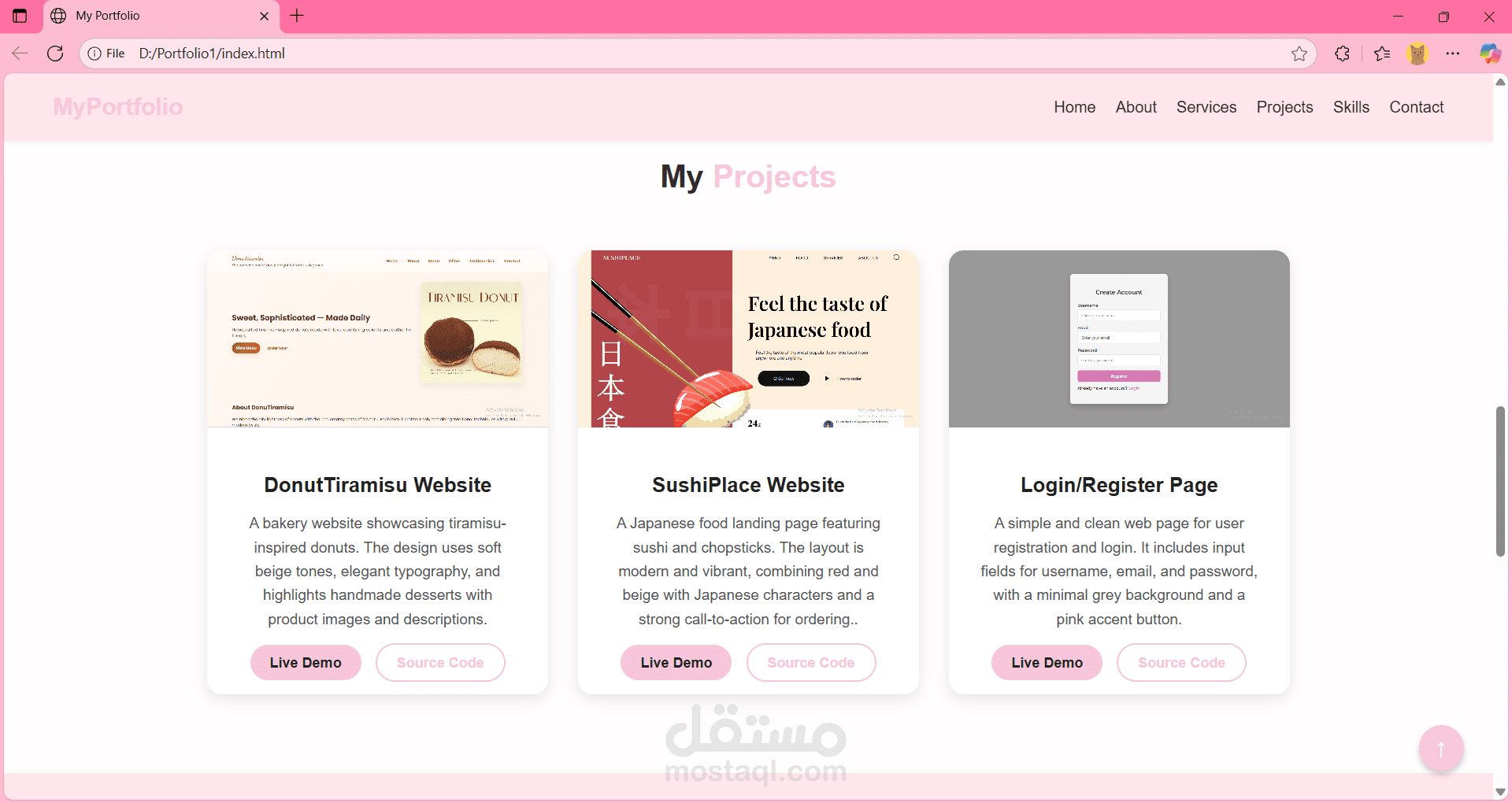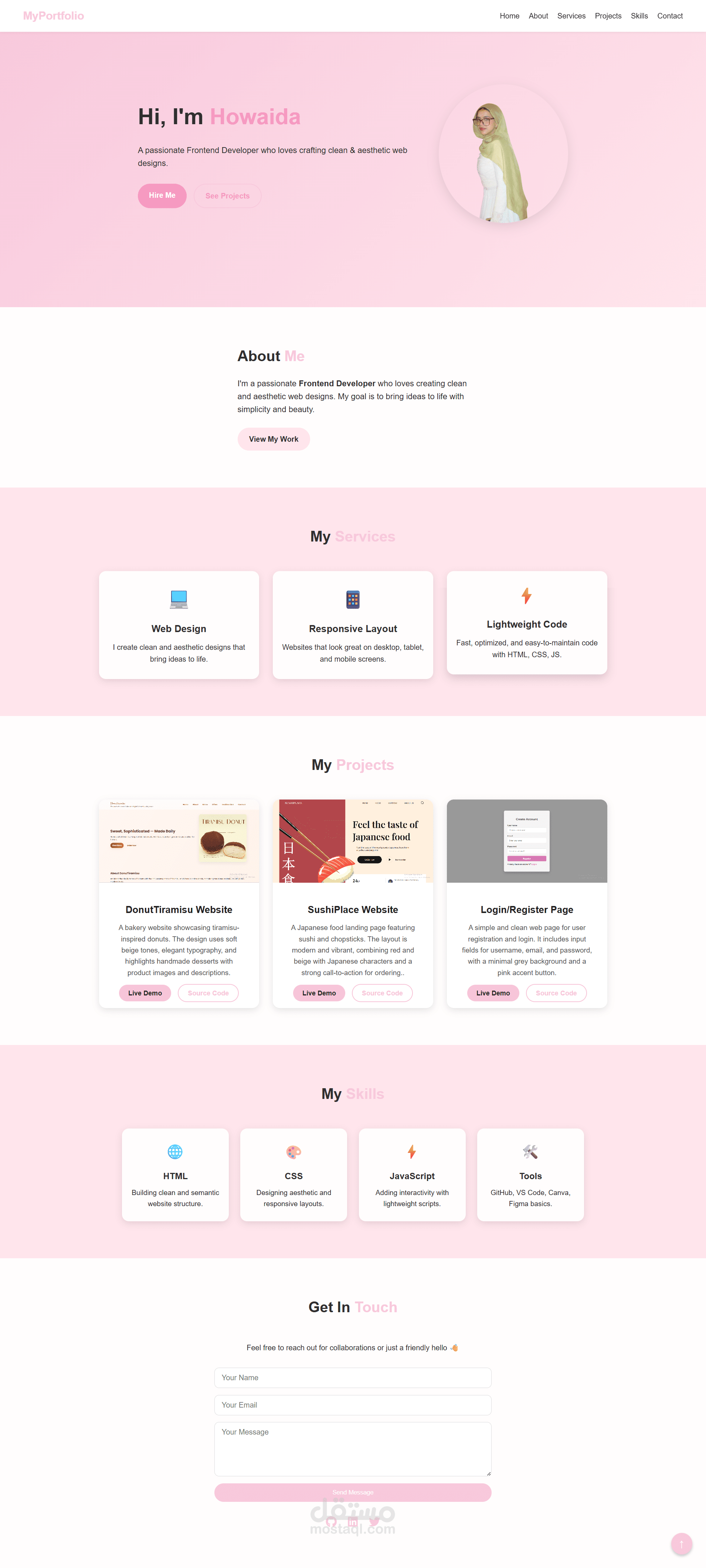 بورتفوليو شخصي عصري ومتجاوب، يحتوي على أقسام للتعريف والخدمات والمشاريع والمهارات مع نموذج تواصل. يتميز بتصميم أنيق، أنيميشن سلس، وتجربة مستخدم سهلة على جميع الأجهزة