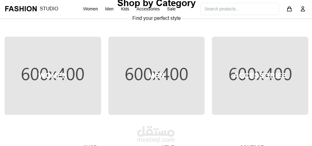 أقسام التصنيفات (Categories Section): ثلاثة أقسام مصورة (Women, Men, Accessories) مع تأثيرات hover للتنقل السريع إلى الفئات.