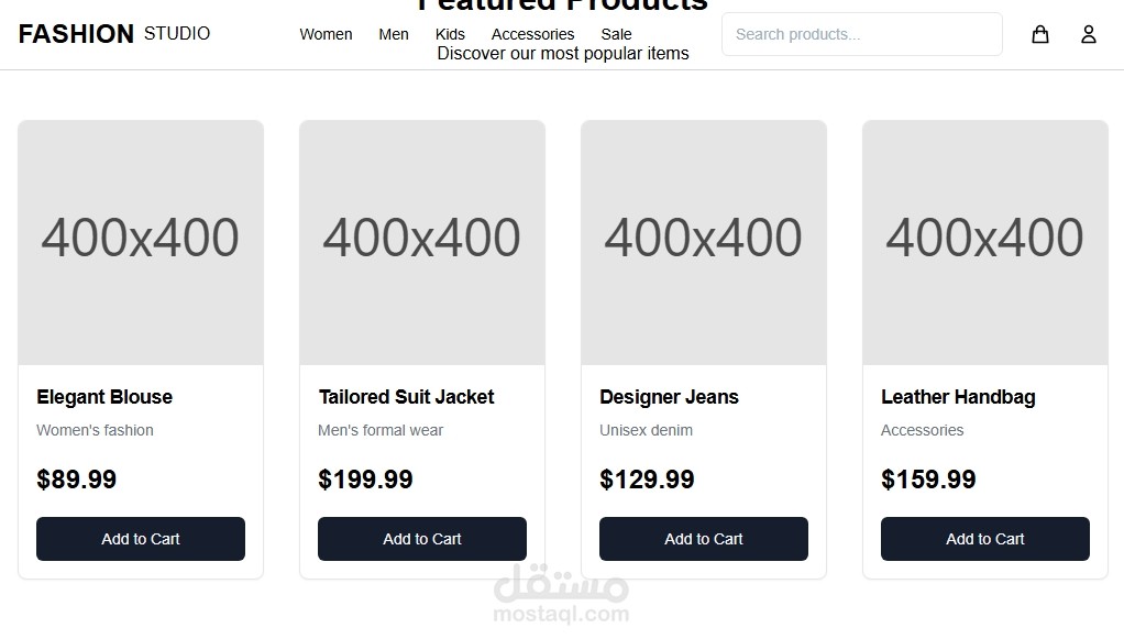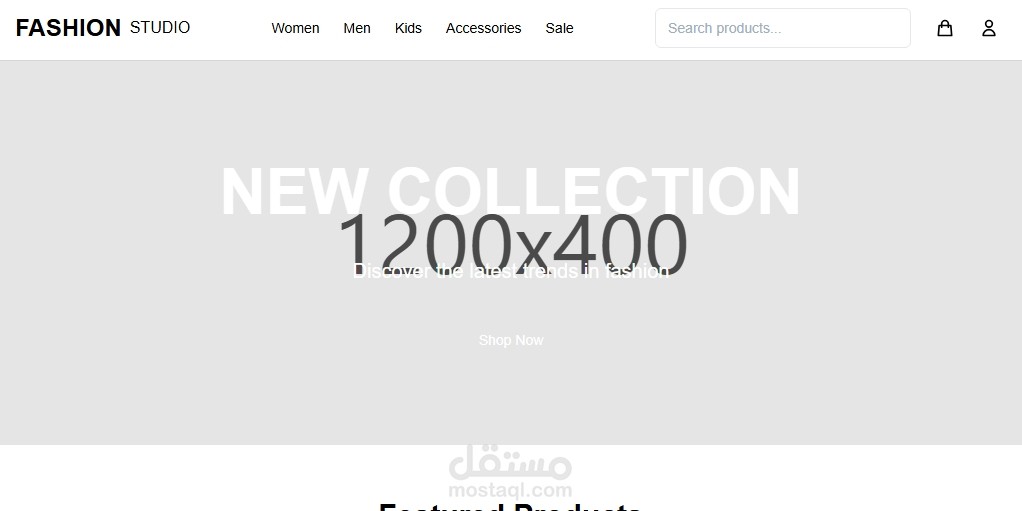 هيدر (Header) تفاعلي: يحتوي على شعار البراند، قائمة تنقل (Women, Men, Kids, Accessories, Sale)، شريط بحث، أيقونة سلة تسوق مع عداد، وأيقونة حساب مستخدم.