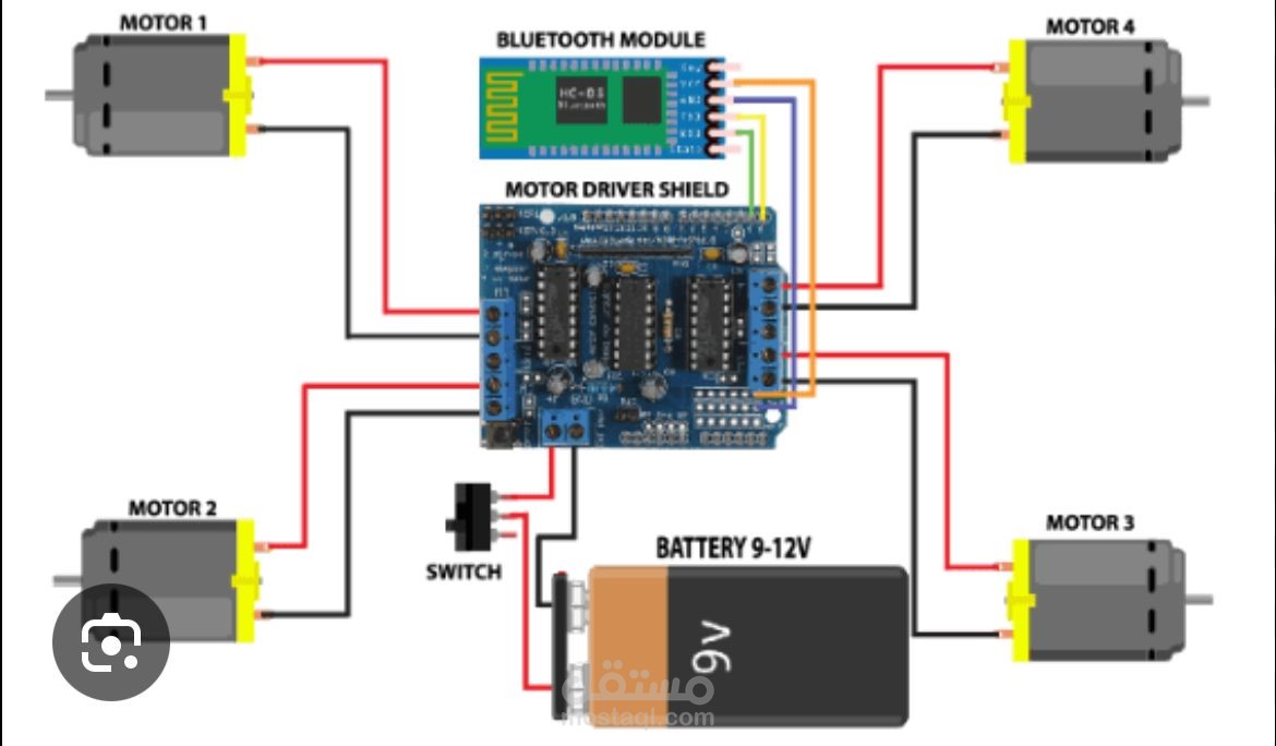 محركات حركة (DC Motors) مع دائرة قيادة للتحكم في الاتجاهات (أمام – خلف – يمين – يسار).