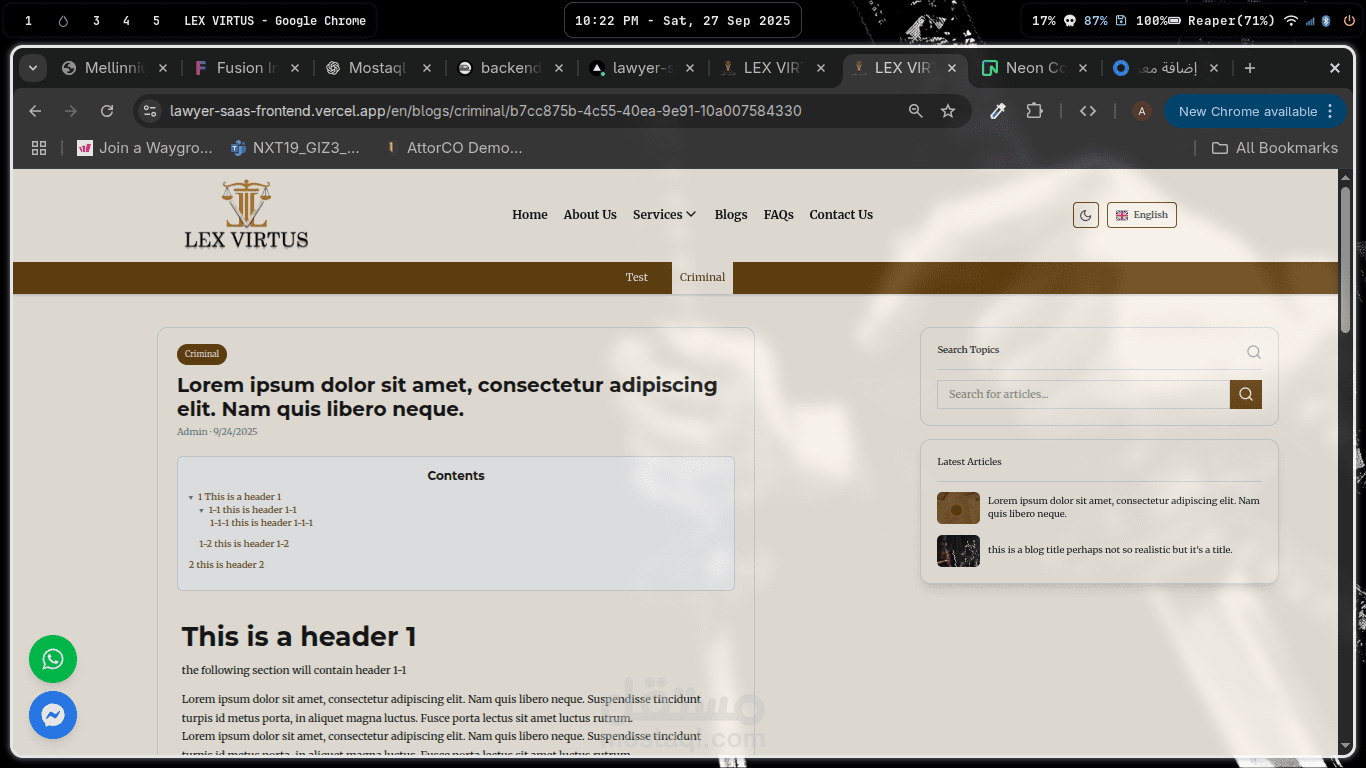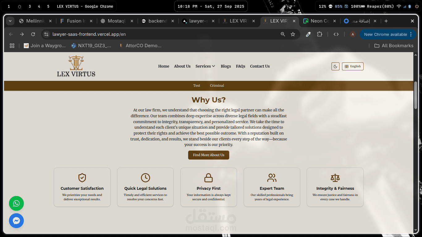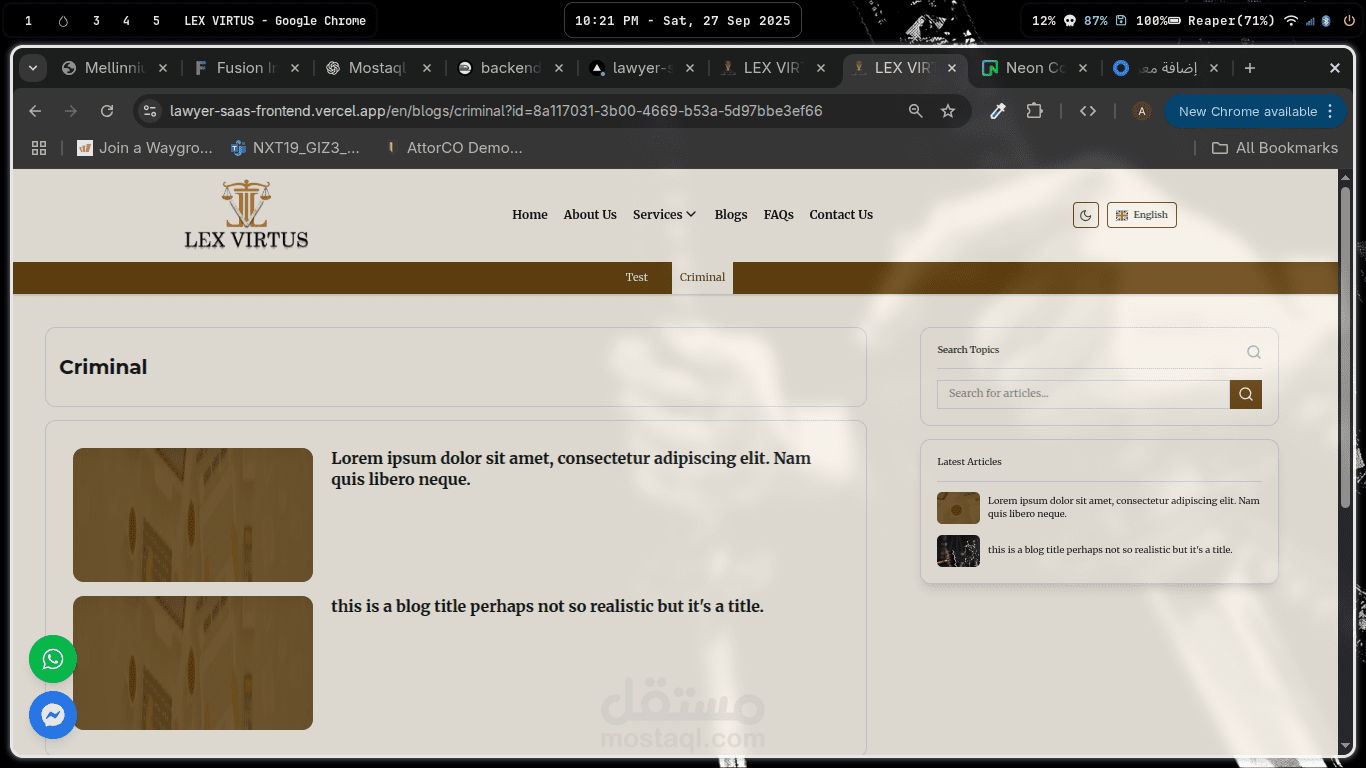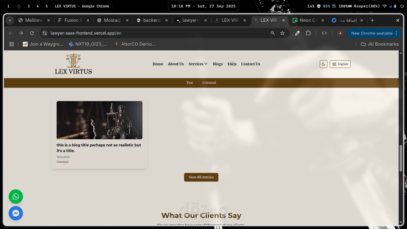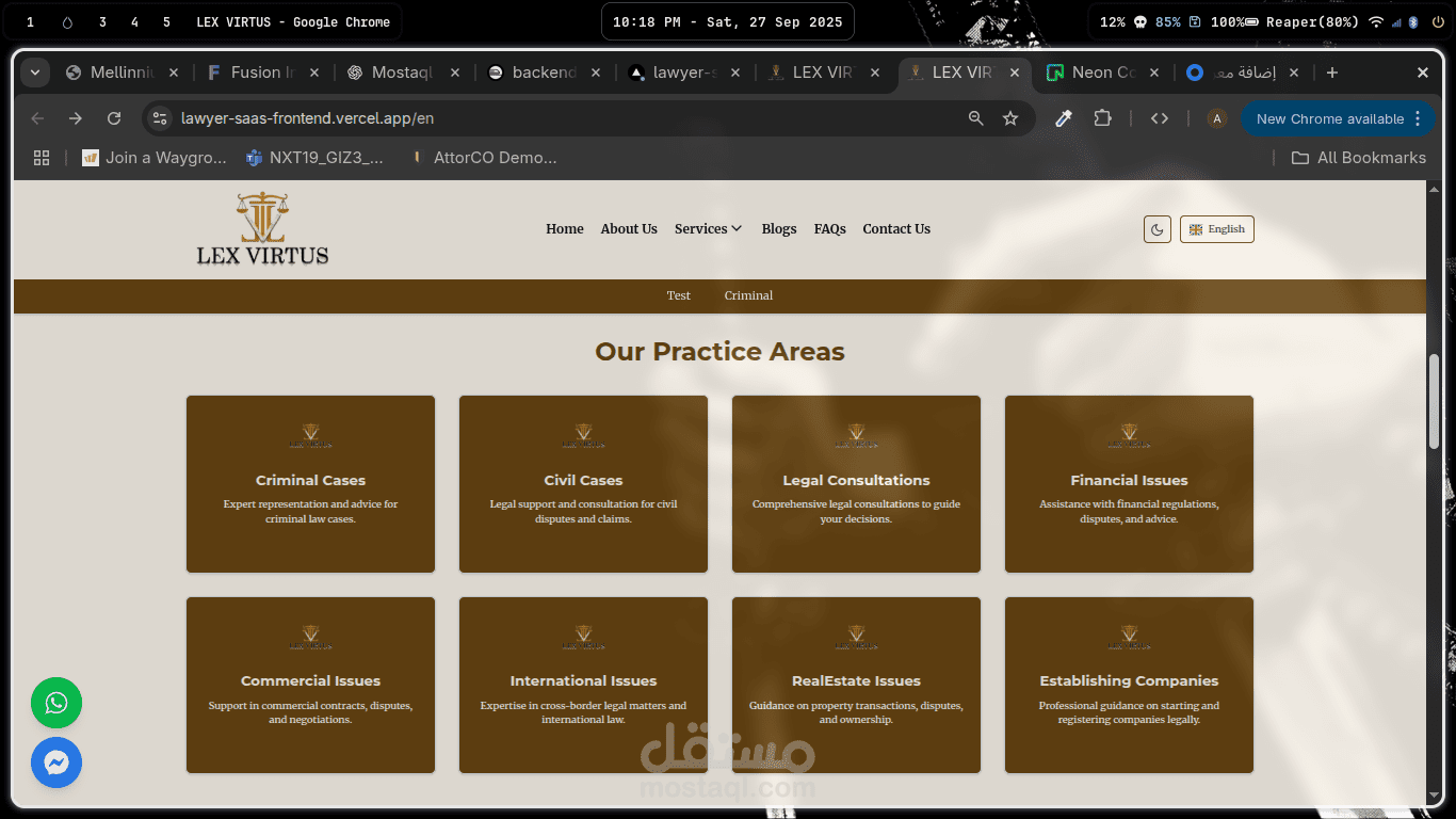 a professional and modern website for a law firm that offers comprehensive legal services. The website includes sections for practice areas, blog articles, client testimonials, staff profiles, FAQs, and contact forms. It features an admin panel for managing content, user roles, and site settings, ensuring the site remains up-to-date and secure. The platform is fully responsive, SEO-friendly, and designed to provide an excellent user experience across all devices.