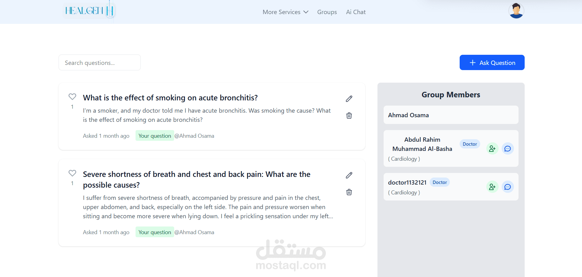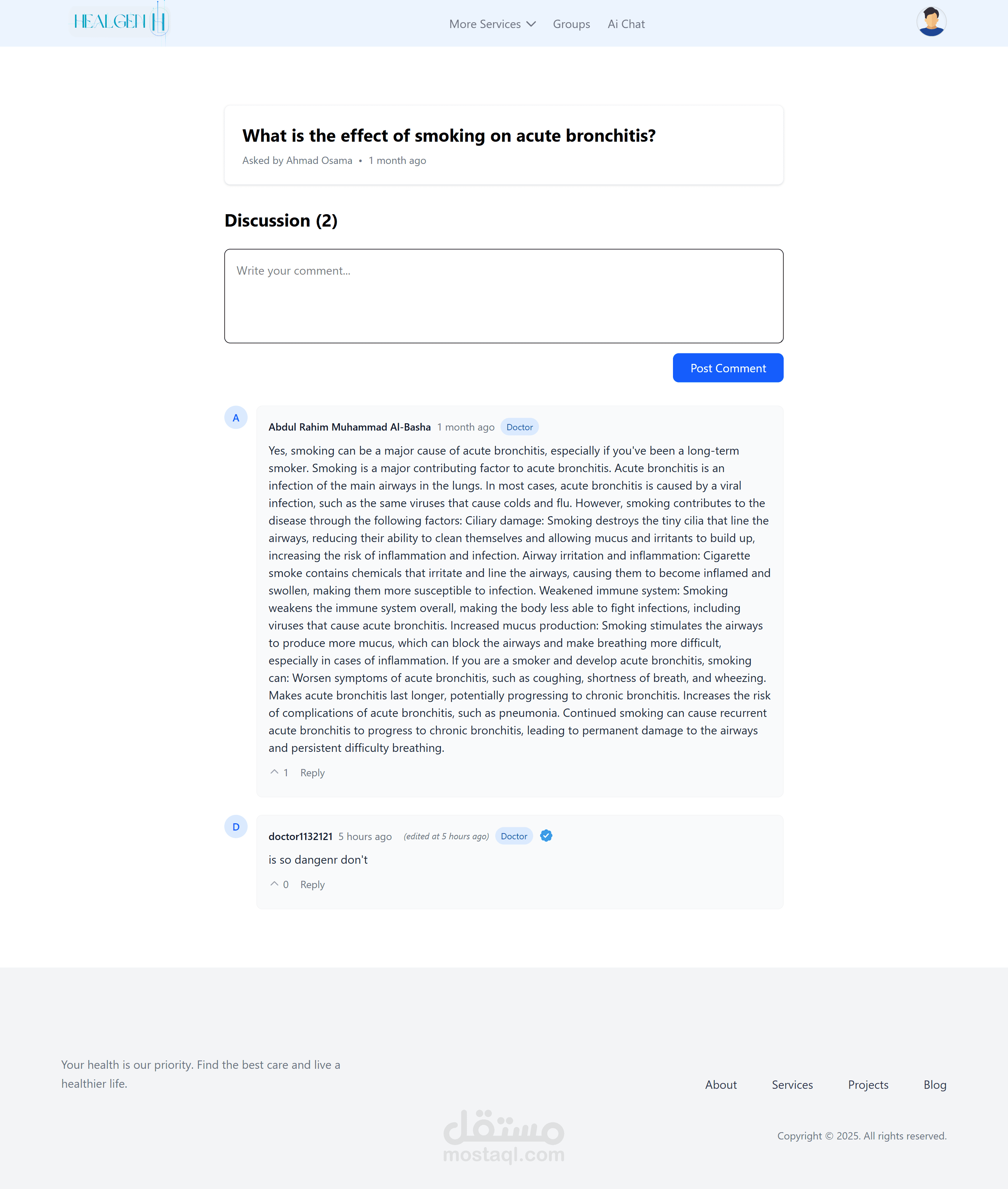منتديات للنقاش الطبي: مجموعات، أسئلة وأجوبة، تعليقات متسلسلة، نظام تصويت على المحتوى، وأدوات إشراف للمحافظة على جودة النقاشات.