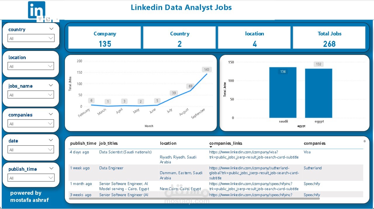 قمت بإنشاء لوحة تحكم تفاعلية باستخدام Power BI بعد جمع بيانات حقيقية لإعلانات وظائف من موقع LinkedIn عبر تقنيات Web Scraping. الهدف من المشروع هو تحليل الطلب على وظائف Data Analyst عبر الدول، المواقع، الشركات، والمسمّيات الوظيفية، بالإضافة إلى التعرف على اتجاهات التوظيف بمرور الوقت.