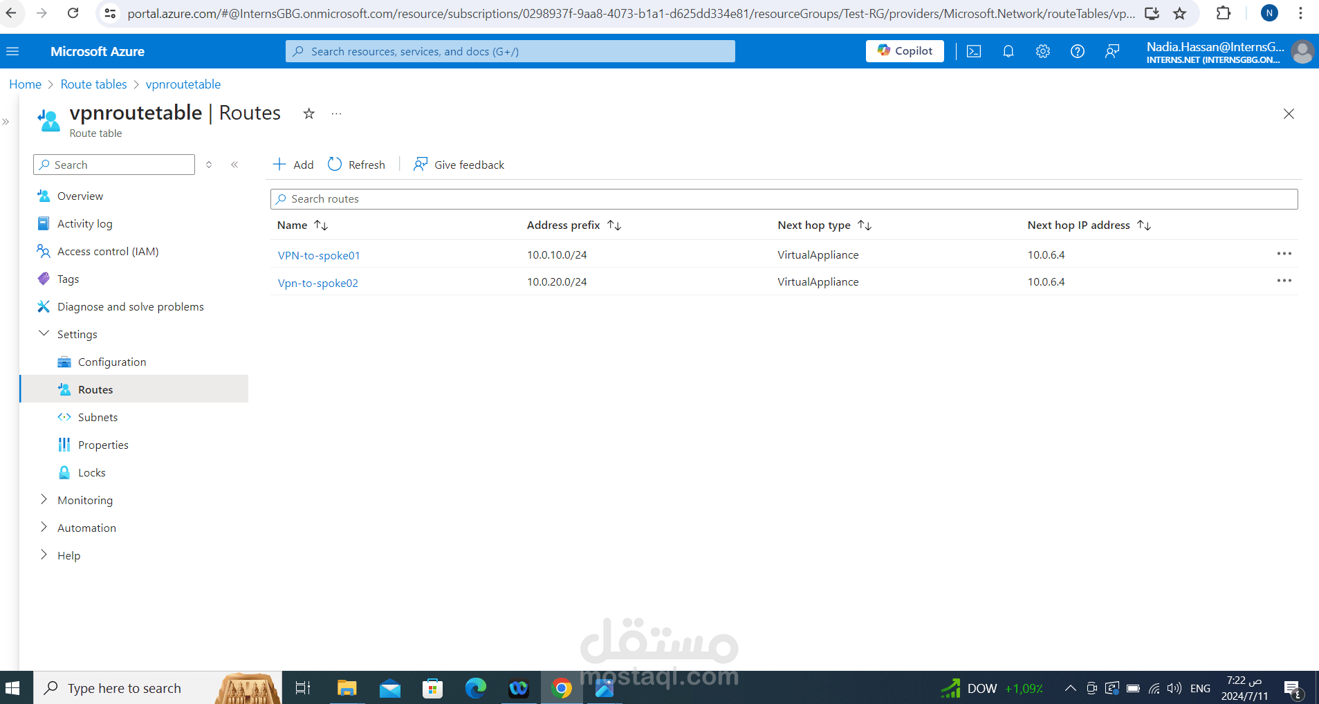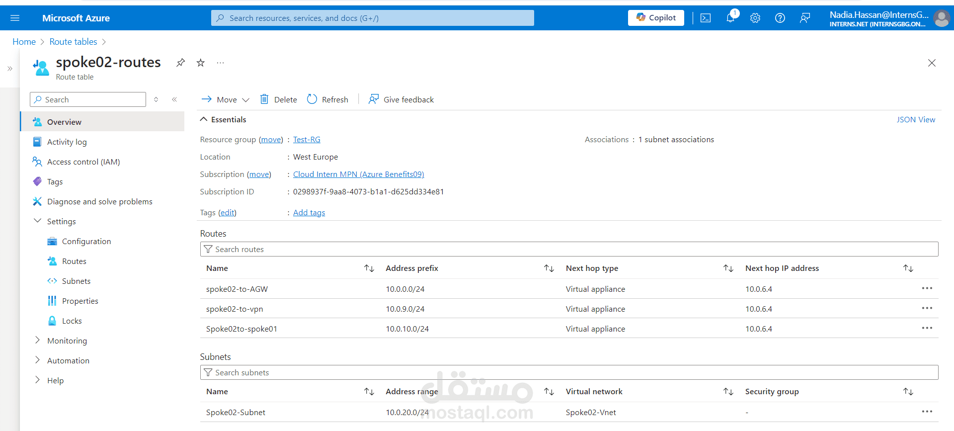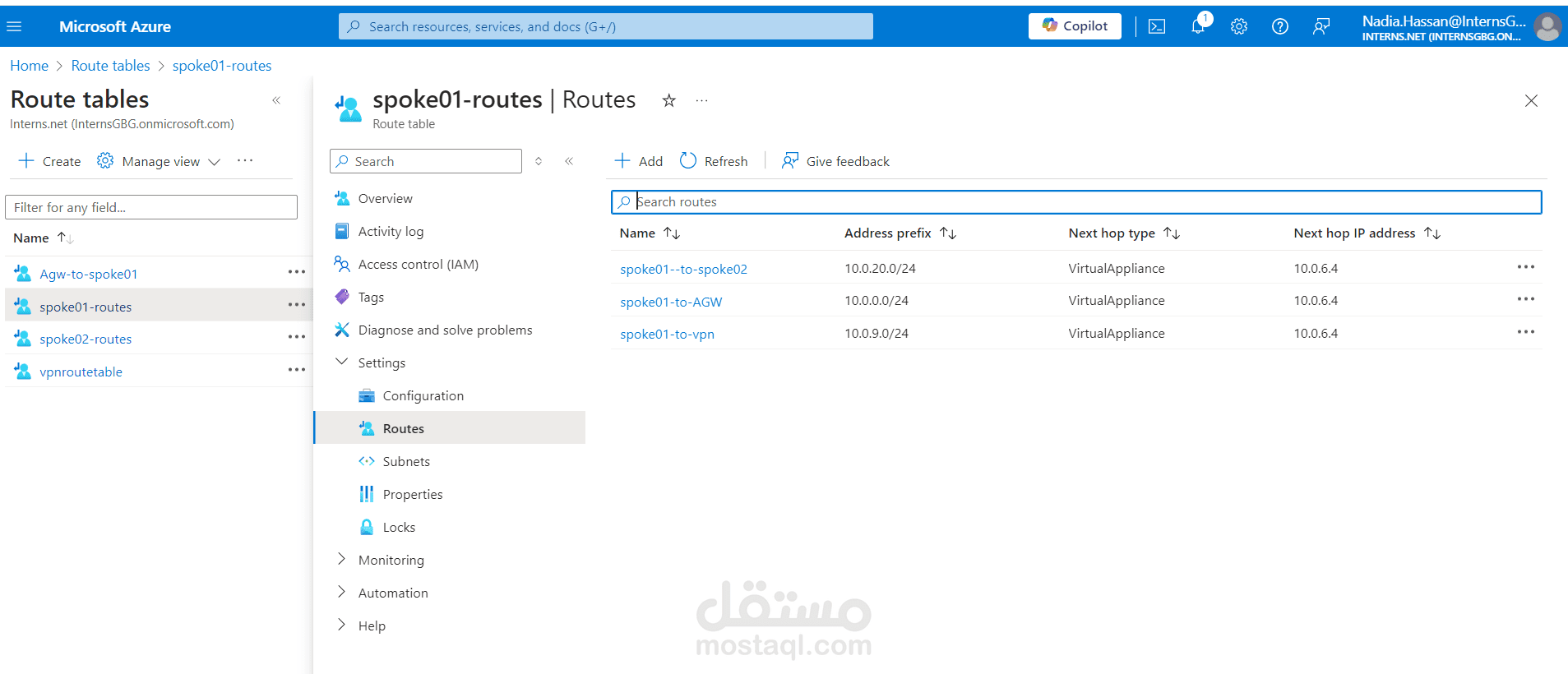 Created route tables for Spoke01 and Spoke02 to ensure secure and optimized routing between workloads.