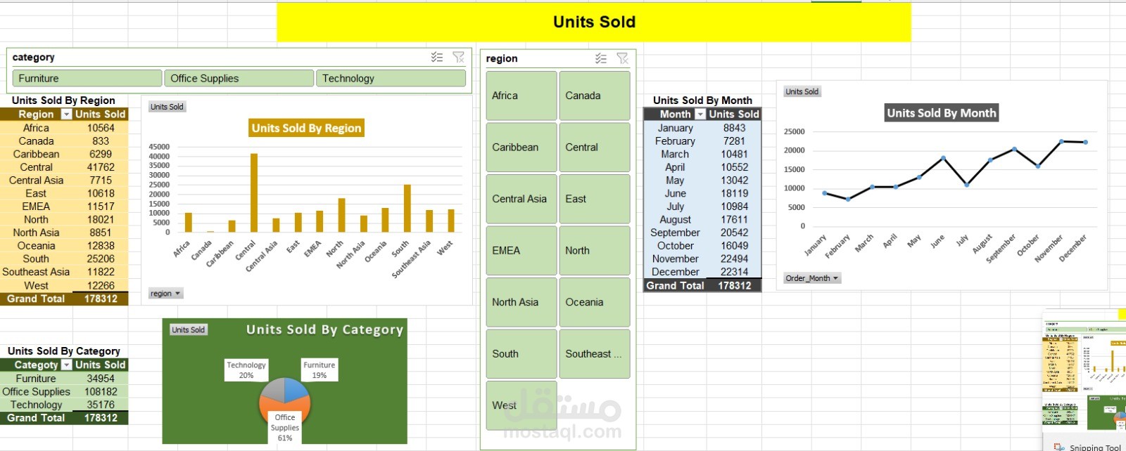 تحليل عدد الوحدات المباعة مع مخططات توضح التوزيع حسب الفئات والعملاء والمناطق.