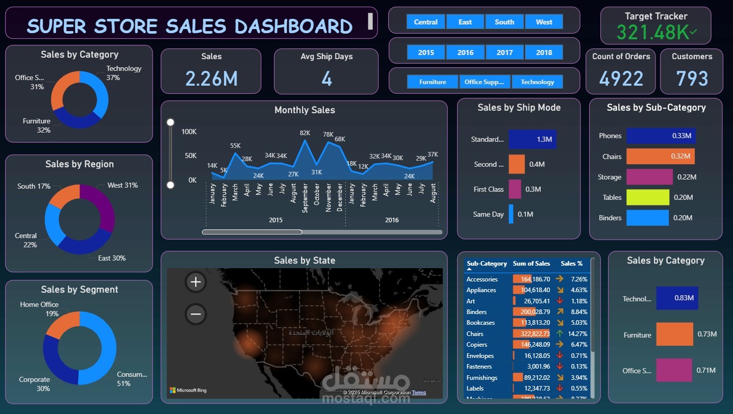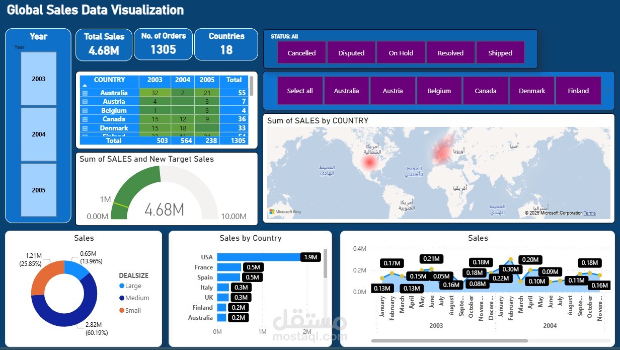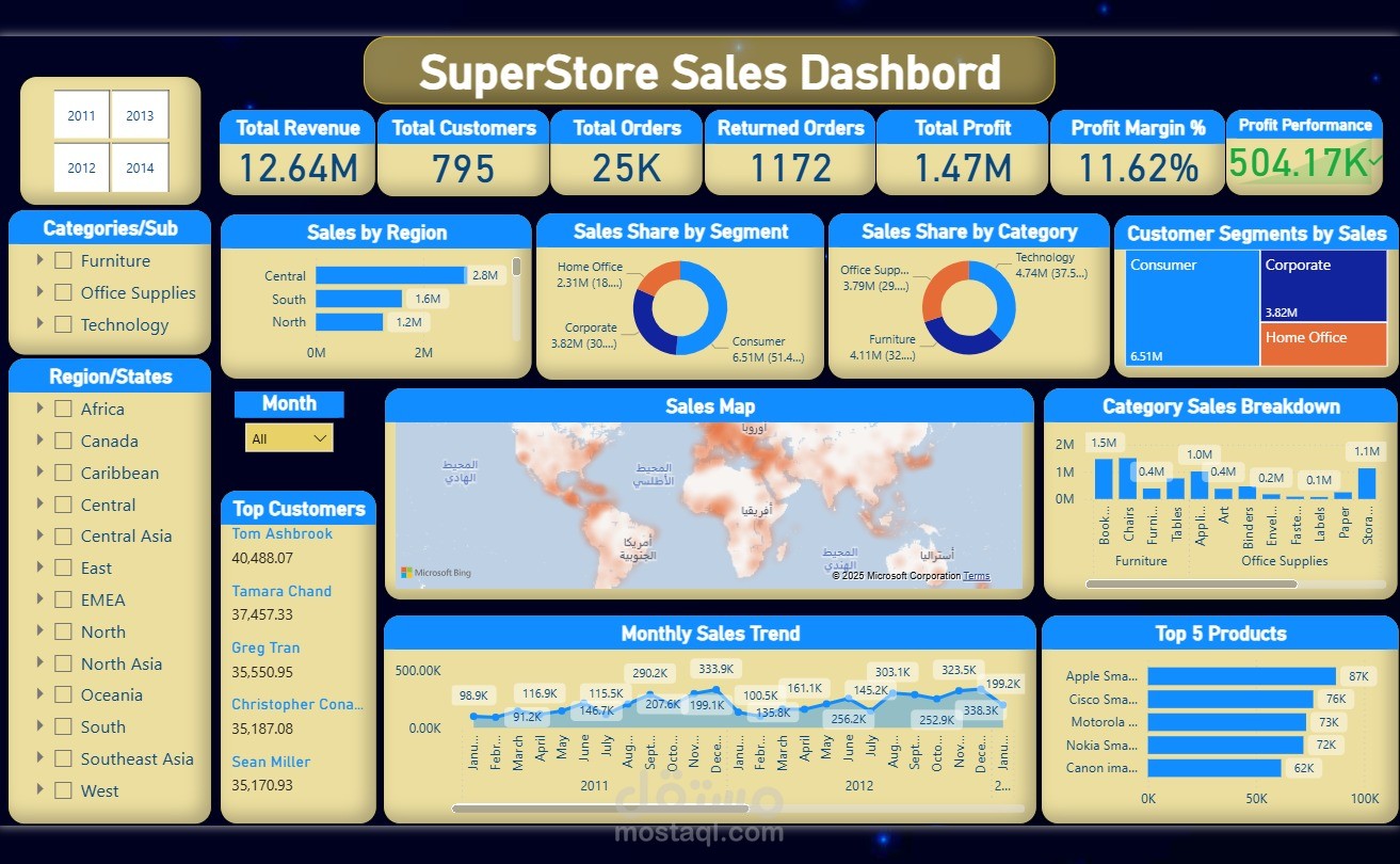 Dashboards لمبيعات مختلفة، عملاء، منتجات، ومؤشرات الأداء الرئيسية (KPIs).